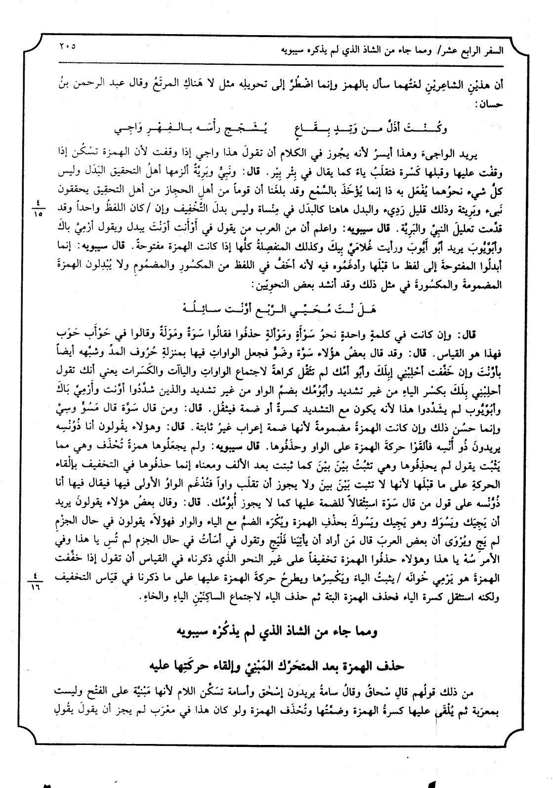 أَن هذيْنِ الشاعِريْن لغتُهما سَأَلَ بِالْهَمْز وَإِنَّمَا اضطُرَّ إِلَى تحويله مثل لَا هَنَاَكِ المرتَعُ، وَقَالَ عبد الرَّحْمَن بن حسان: وكنتَ أَذَلَّ من وَتَدٍ بِقاعٍ يُشَجِّج رأسْهَ بالفِهْرِ واجي يُرِيد الواجئ وَهَذَا أيسر لِأَنَّهُ لَا يجوز فِي الْكَلَام أَن تَقول هَذَا واجي إِذا وقفت لِأَن الْهمزَة تسكن إِذا وقفْتَ عَلَيْهَا وَقبلهَا كَسْرة فتقلَبُ يَاء كَمَا يُقَال فِي بِئْر بِيْر. قَالَ: ونَبِيٌّ وبَرِيَّةٌ ألزمها أهل التَّحْقِيق البَدَل وَلَيْسَ كُلُّ شَيْء نَحْوهمَا يُفعَل بِهِ ذَا إِنَّمَا يُؤْخذ بالسَّمْع وَقد بلغنَا أَن قوما من أهل الْحجاز من أهل التَّحْقِيق يحققون نَبيء وبَريئة وَذَلِكَ قَلِيل رَديء وَالْبدل هَا هُنَا كالبدل فِي مِنْساة وَلَيْسَ بدل التَّخْفيف وَإِن كَانَ اللَّفْظ وَاحِدًا وَقد قدمت تَعْلِيل النبِي والبَرِيَّة. قَالَ سِيبَوَيْهٍ: وَاعْلَم أَن من الْعَرَب من يَقُول فِي أَوْأَنتَ أَوَنْتَ يُبدل وَيَقُول أرْمِيَّ باكَ وأبُوَّيُّوب يُرِيد أَبُو أيُّوب وَرَأَيْت غُلامَيَّ بِيكَ وَكَذَلِكَ المنفصِلة كُلُّها إِذا كَانَت الْهمزَة مَفْتُوحَة. قَالَ سِيبَوَيْهٍ: إِنَّمَا أبدلوا الْمَفْتُوحَة إِلَى لفظ مَا قبلهَا وأدغموه فِيهِ لِأَنَّهُ أخَفُّ فِي اللَّفْظ من المكسور والمضموم وَلَا يُبْدلون الهمزةَ المضمومةَ والمكسورةَ فِي مثل ذَلِك وَقد أنْشد بعض النحوِيِّين: هَلَ نْتَ مُحْيِّي الرِّبْع أوَّنْت سائِلُهْ قَالَ: وَإِن كَانَت فِي كلمة وَاحِدَة نَحْو سَوْأَة وَمْوَألة حذفوا فَقَالُوا سَوَةٌ وَمَوَلةٌ وَقَالُوا فِي حَوْأَب حَوَب فَهَذَا هُوَ الْقيَاس. قَالَ: وَقد قَالَ بعض هَؤُلَاءِ سَوَّة وضَوٌّ فَجعل الواوات فِيهَا بِمَنْزِلَة حُروف المدِّ وشبَّهه أَيْضا بأوَّنْتَ وَإِن خَفَّفْت أحْلِبْني إبِلَكَ وَأَبُو أمِّك لم تُثَقِّل كَرَاهَة لِاجْتِمَاع الواوات والياآت والكَسَرات يَعْنِي أَنَّك تَقول أحلِبْني بِلَكَ بكَسْر الْيَاء من غير تَشْدِيد وأبومِّكَ بضمِّ الْوَاو من غير تَشْدِيد وَالَّذين شدَّدوا أوَّنت وأَرْمِيَّ باكَ وأبوَّيُّوب لم يشَدَّدِوا على هَذَا لِأَنَّهُ يكون مَعَ التَّشْدِيد كسرةٌ أَو ضمة فيثقُل. قَالَ: وَمن قَالَ سَوَّة قَالَ مَسُوٌّ وسِيَّ وَإِنَّمَا حسُن ذَلِك وَإِن كَانَت الهمزةُ مَضْمُومَة لِأَنَّهَا ضمة إِعْرَاب غير ثَابِتَة. قَالَ: وَهَؤُلَاء يَقُولُونَ أَنا ذُونْسِه يُرِيدُونَ ذُو أُنْسِه فألْقَوا حركةَ الْهمزَة على الْوَاو وحذفوها. قَالَ سِيبَوَيْهٍ: وَلم يجعلوها همزَة تُحذف وَهِي مِمَّا يَثْبُت، يَقُول لم يحذفوها وَهِي تثبُت بَيْنَ بَيْنَ كَمَا ثبتَتْ بعد الْألف وَمَعْنَاهُ إِنَّمَا حذفوها فِي التَّخْفِيف بإلقاء الحركةِ على مَا قَبْلَها لِأَنَّهَا لَا تثبت بَيْنَ بَيْنَ وَلَا يجوز أَن تقلبَ واواً فتُدغَم الواوُ الأولى فِيهَا فَيُقَال فِيهَا أَنا ذوُّنْسه على قَول من قَالَ سَوّة استِثقالاً للضمة عَلَيْهَا كَمَا لَا يجوز أُبُّومِّك. قَالَ: وَقَالَ بعضُ هَؤُلَاءِ يقولونَ يُرِيد أَن يجيَكَ ويَسوَك وَهُوَ يَجيِكَ ويَسوكَ بحذفِ الْهمزَة ويُكْرَه الضمُّ مَعَ الْيَاء وَالْوَاو فَهَؤُلَاءِ يَقُولُونَ فِي حَال الجَزْم لم يَجِ ويُرْوى أَن بعض العربَ قَالَ من أَرَادَ أَن يأتِينا فَلْيَجِ، وَتقول فِي أسَاتُ فِي حَال الْجَزْم لم تُسِ يَا هَذَا وَفِي المر سُهْ يَا هَذَا وَهَؤُلَاء حذفوا الْهمزَة تَخْفِيفًا على غير النَّحْو الَّذِي ذَكرْنَاهُ فِي الْقيَاس أَن تَقول إِذا خفَّفت الْهمزَة هُوَ يَرْمِي خْوانَه يثبتُ الياءَ ويَكْسِرُها ويطرحُ حركةَ الْهمزَة عَلَيْهَا على مَا ذكرنَا فِي قِيَاس التَّخْفِيف وَلكنه استثقل كسرة الْيَاء فَحذف الْهمزَة الْبَتَّةَ ثمَّ حذف الْيَاء لِاجْتِمَاع الساكِنَيْن الياءِ والخاءِ.