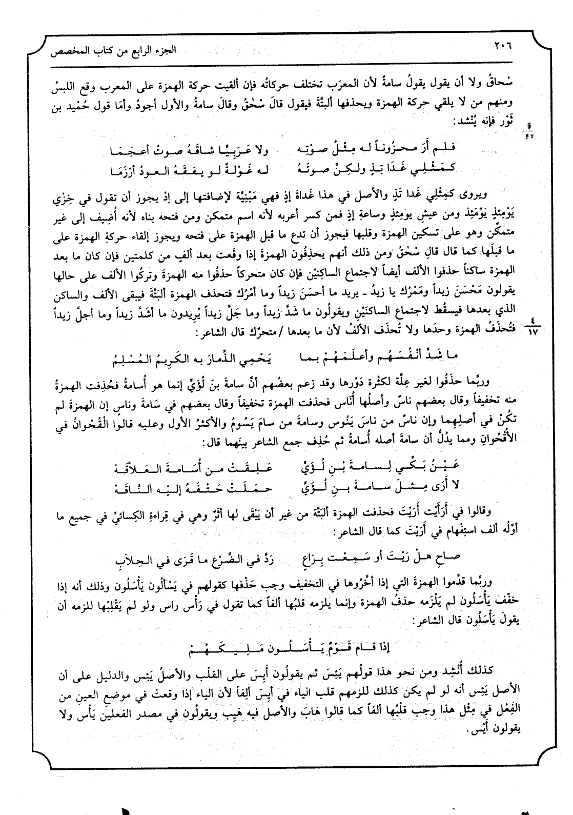سْحقُ وَلَا أَن يَقُول يقولُ سامةُ لِأَن المعرب تخْتَلف حركاته فَإِن ألقيت حَرَكَة الْهمزَة على المعرب وَقع اللّبْس وَمِنْهُم من لَا يلقِي حَرَكَة الْهمزَة ويحذفها البتَّة فَيَقُول قالَ سْحقُ وقالَ سامةُ وَالْأول أَجود وَأما قَول حُميد بن ثَوْر فَإِنَّهُ يُنشد: فَلم أَرَ مَحْزُونا لَهُ مِثْلُ صوْتِه وَلَا عَرَبِيَّاً شاقَهُ صوتُ أعجَما كمثْلي غَداتِذٍ ولكِنَّ صوتَهُ لَهُ غَوْلَةٌ لَو يفقَهُ العودُ أرْزَما ويروى كمِثلي غَداتِذٍ وَالْأَصْل فِي هَذَا غداةَ إذٍ فَهِيَ مَبْنِيَّة لإضافتها إِلَى إدْ يجوز أَن تَقول فِي خِزْيِ يَوْمِئِذٍ يَومَئِذ وَمن عيشِ يومِئِذ وساعةِ إذٍ فَمن كسر أعربه لِأَنَّهُ اسْم مُتَمَكن وَمن فَتحه بناه لِأَنَّهُ أُضيف إِلَى غير مُتَمَكن وَهُوَ على تسكين الْهمزَة وقلبها فَيجوز أَن تدع مَا قبل الْهمزَة على فَتحه وَيجوز إِلْقَاء حَرَكَة الْهمزَة على مَا قبلهَا كَمَا قَالَ: قالِ سْحقُ وَمن ذَلِك أَنهم يحذفون الْهمزَة إِذا وقعَت بعد ألفٍ من كَلِمَتَيْنِ فغن كَانَ مَا بعد الْهمزَة سَاكِنا حذفوا الْألف أَيْضا لِاجْتِمَاع الساكنَيْن فَإِن كَانَ متحركاً حذفوا مِنْهُ الْهمزَة وَتركُوا الْألف على حَالهَا يَقُولُونَ مَحْسَنَ زَيْداً ومَمْرُك يَا زيدُ يُرِيد: مَا أحسَنَ زيدا، وَمَا أمرُك، فتحذف الْهمزَة البتَّةَ فَيبقى الْألف والساكن الَّذِي بعْدهَا فَيسْقط لِاجْتِمَاع الساكنين وَيَقُولُونَ مَا شَدَّ زيدا وَمَا جَلَّ زيداُ يُرِيدُونَ مَا أشَدَّ زيدا وَمَا أَجَلَّ زيدا، فتُحذَفُ الْهمزَة وَحدهَا وَلَا تُحذَف الْألف لن مَا بعْدهَا متحرِّك، قَالَ الشَّاعِر: مَا شَدَّ أنْفُسَهُم وأَعْلَمَهُمْ بِمَا يَحمي الذِمار بِهِ الكريمُ المُسْلِمُ وربَّما حذفوا لغير عِلَّة لِكَثْرَة دَوْرها وَقد زعم بَعضهم أنَّ سامةَ بنَ لُؤيٍّ إِنَّمَا هُوَ أُسَامَة فحُذفت الْهمزَة مِنْهُ تَخْفِيفًا وَقَالَ بَعضهم ناسٌ وَأَصلهَا أُناس فحذفت الْهمزَة تَخْفِيفًا وَقَالَ بَعضهم فِي سامةَ وناسٍ إِن الْهمزَة لم تكُن فِي أَصْلهَا وَإِن ناسٌ من ناسَ يَنوس وسامةَ من سامَ يَسوم وَالْأَكْثَر الأول وَعَلِيهِ قَالُوا القُحْوان فِي الأُقْحُوان، وَمِمَّا يدل على أَن سامة أَصله أُسامة ثمَّ حُذِف جمع الشَّاعِر بَينهمَا قَالَ: عَيْنُ بَكِّي لِسامةَ بنِ لُؤَيٍّ عَلِقَتْ من أُسامةَ العَلاَّقَهْ لَا أَرَىَ مِثْلَ سامةَ بن لُؤَيٍّ حَمَلَتْ حَتْفَهُ إليْه النَّاقَهْ وَقَالُوا فِي أَرَأَيتْ أَرَيْتَ فحذفت الْهمزَة البتَّة من غير أَن يَبْقَى لَهَا أثرٌ وَهِي فِي قراءةِ الكِسائي فِي جَمِيع مَا أوَّلَهُ ألف اسْتِفْهَام فِي أَرَيْتَ كَمَا قَالَ الشَّاعِر: صاحِ هلْ رَيْتَ أَو سَمِعْتَ بِراعٍ رَدَّ فِي الضَّرْع مَا قَرَىَ فِي الحِلابِ وربَّما قدَّموا الهمزةَ الَّتِي إِذا أخَّروها فِي التَّخْفِيف وَجب حذفهَا كَقَوْلِهِم فِي يَسْئَلون يَأْسَلون وَذَلِكَ أَنه إِذا خفف يَأْسَلون لم يَلْزَمه حذفُ الْهمزَة وَإِنَّمَا يلْزمه قَلبهَا ألفا كَمَا تَقول فِي رَأْس راس وَلَو لم يَقْلِبْها للزمه أَن يَقُول يَأْسَلُون، قَالَ الشَّاعِر: إِذا قَامَ قَوْمٌ يَأْسَلُون مَليكَهُمْ كَذَلِك أُنشِد وَمن نَحْو هَذَا قَوْلهم يَئِسَ ثمَّ يَقُولُونَ أَيِسَ على القلْب وَالْأَصْل يَئِس وَالدَّلِيل على أَن الأَصْل يَئِس أَنه لَو لم يكن كَذَلِك للزمهم قلب الْيَاء فِي أَيِسَ ألِفاً لِأَن الْيَاء إِذا وقعتْ فِي مَوضِع الْعين من الفِعْل فِي مِثْل هَذَا وَجب قلْبُها ألفا كَمَا قَالُوا هَاَبَ وَالْأَصْل فِيهِ هَيِبَ وَيَقُولُونَ فِي مصدر الْفِعْلَيْنِ يَأْس وَلَا يَقُولُونَ أَيْس.