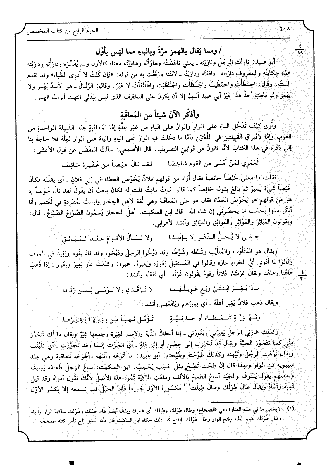 وأُري كيفَ تَدخلُ الياءُ على الواوِ والواوُ على الياءِ من غيرِ عِلَّةٍ إمّا لمُعاقَبةٍ عِند القَبيلة الْوَاحِدَة من الْعَرَب وإمَّا لافتراق القَبيلتين فِي اللُّغَتَيْن فأمَّا مَا دَخَلَتْ فِيهِ الواوُ على الياءِ والياءُ على الواوِ لعلَّة فَلَا حاجةَ بِنَا إِلَى ذِكْره فِي هَذَا الْكتاب لِأَنَّهُ قانونٌ من قَوانين التصريف، قَالَ الْأَصْمَعِي: سألتُ المفَضَّل عَن قَول الْأَعْشَى: لَعَمْري لَمَنْ أَمْسَى من القومِ شاخِصا لقد نالَ خَيْصَاً من عُفَيْرةَ خائِصا فَقلت: مَا معنى خَيْصَاً خائصاً فَقَالَ: أُراه من قَوْلهم فلانٌ يُخَوِّص العطاءَ فِي بَني فلانٍ: أَي يُقَلِّلُه، فكأنَّ خَيْصَاً شيءٌ يسيرٌ ثمَّ بَالغ بقوله خائصاً كَمَا قَالُوا هُوَ مَوْتٌ مائت، قلت لَهُ: فَكَانَ يجب أَن يَقُول لقد نَالَ خَوْصَاً إِذْ هُوَ من قَوْلهم هُوَ يُخَوِّص العَطاء فَقَالَ: هُوَ على المُعاقَبة وَهِي لُغَة لأهل الْحجاز وَلَيْسَت بمًطَّرِدَةٍ فِي لغتهم وَأَنا أذكر مِنْهَا بحسَب مَا يحضُرني إِن شَاءَ الله. قَالَ ابْن السّكيت: أهلُ الْحجاز يُسمُّون الصَّوَّاغ الصَّيَّاغ، قَالَ: وَيَقُولُونَ: المَياثر والمَواثر والمَواثق والمَياثق، وَأنْشد لأعرابي: حِمىً لَا يُحلُّ الدَّهْر إِلَّا بإذْنِنا وَلَا نَسْألُ الأقوامَ عَقْدَ المَيَاثِقِ وَيُقَال: هُوَ المُتَأَوِّب والمُتَأَيِّب، وشَيَّطَه وشَوَّطَه وَقد دَوَّخوا الرجلَ ودَيَّخوه وَقد فادَ يَفود ويَفيد فِي الْمَوْت، وَقَالُوا مَا أَدْري أيُّ الجَرادِ عارَه، وَقَالُوا فِي المُستقبَل يَعورُه ويَعيرُه. غَيره: وَكَذَلِكَ عَار يَعير ويَعور: إِذا ذَهَبَ هَهُنَا وههُنا وَيُقَال غرْتُ فلَانا وقومٌ يَقُولُونَ غُرْتُه: أَي نَفَعْته، وأنْشَد: مَاذَا يَغيرُ ابْنَتَيْ رِبْعٍ عَوِيلُهُما لَا تَرْقُدانِ وَلَا بوسى لِمَن رَقَدَا وَيُقَال ذهب فلانٌ يَغيرُ أهلَه: أَي يَميرُهم ويَنفعُهم، وأنْشَد: ونَهْدِيَّةٍ شَمْطاءَ أَو حارِثيَّةٍ تُؤَمِّلُ نَهْبَاً من بَنيها يَغيرُها وَكَذَلِكَ غارَني الرجلُ يَغيرُني ويَغورُني: إِذا أَعْطَاك الدِّيَة وَالِاسْم الغِيرَة وَجَمعهَا غِيَر، وَيُقَال مَا لَك تَتَحَوَّز مِنِّي كَمَا تَتَحَوَّز الحَيَّة وَيُقَال قد تَحَيَّزْتَ إِلَى حِصْنٍ أَو إِلَى فِئَة: أَي انْحَزْت إِلَيْهَا وَقد تَحَوَّزْت: أَي تَلَبَّثْتَ وَيُقَال تَوَّهْت الرجلَ وتَيَّهْته وَكَذَلِكَ طَوَّحْته وطَيَّحْته. أَبُو عبيد: مَا أَتْوَهَه وَأْتَيهَه وَأْطَوحَه معاقبة وَهِي عِنْد سِيبَوَيْهٍ من الْوَاو وَلِهَذَا قَالَ إنَّ طِحْت تَطيح مثل حَسِبَ يَحْسِب. ابْن السّكيت: ساغَ الرجلُ طعامَه يَسيغه وَبَعْضهمْ يَقُول يَسوغه والجَيِّد أساغَ الطعامَ بِالْألف وماهَتِ الرَّكِيَّة تَموه هَذَا الأَصْل لِأَنَّك تَقول أَمْواه وَقد قيل تَميه وتَماه وَيُقَال طالَ طِوَلُك وَطَالَ طِيَلُك مَكْسُورَة الأوّل جَمِيعًا فَأَما الحبْلُ فَلم نسْمَعه إِلَّا بِكَسْر الأول