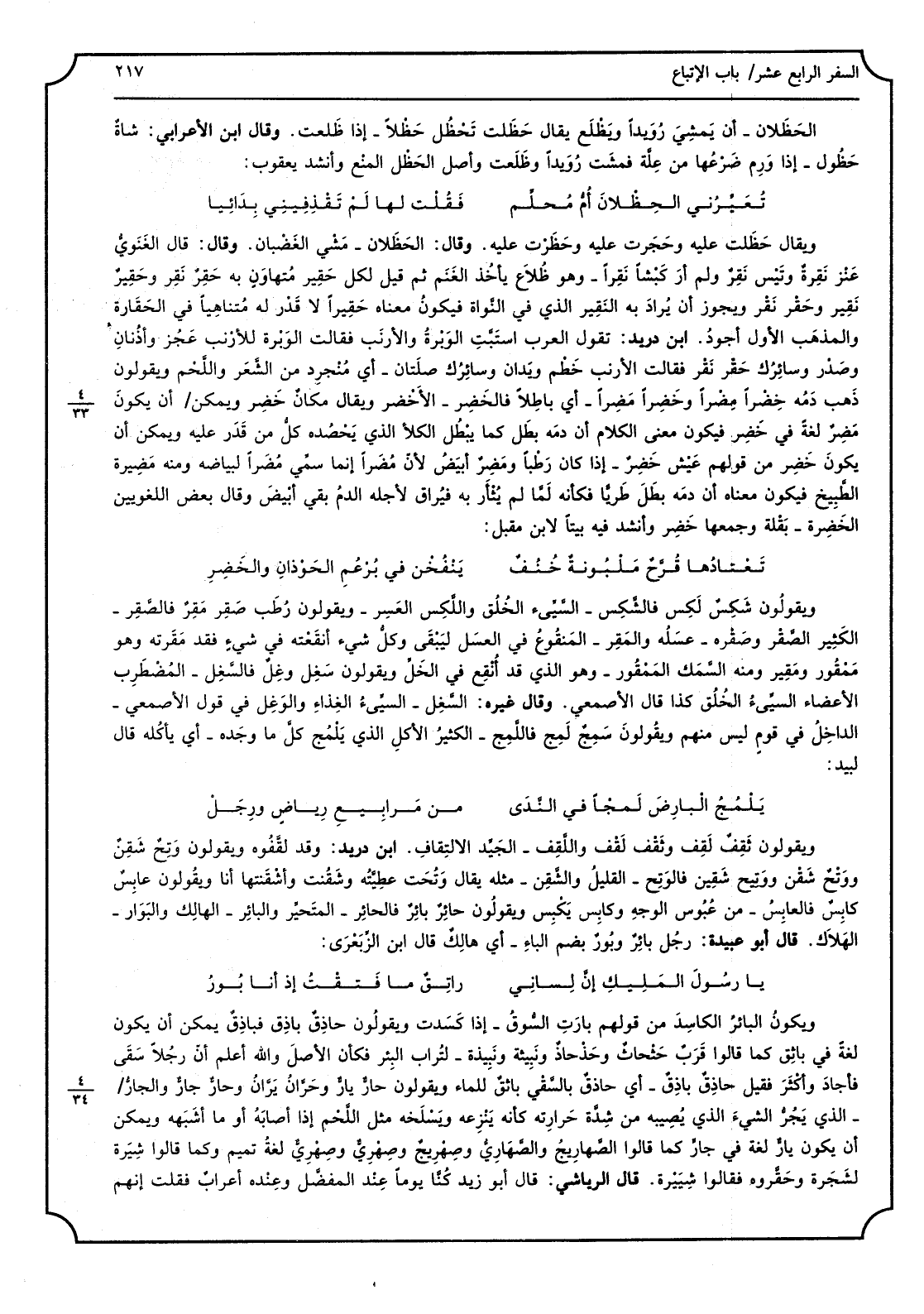 الحَظَلان: أَن يَمشي رُوَيْداً ويَظْلَع، يُقَال حَظَلَت تَحْظُل حَظْلاً: إِذا ظَلَعَت. وَقَالَ ابْن الْأَعرَابِي: شاةٌ حَظْوَل: إِذا وَرِمَ ضَرْعُها من عِلَّة فمشَتْ رُوَيْداً وظَلَعَت وأصل الحَظْل المنْع، وَأنْشد يَعْقُوب: تُعَيِّرُني الحِظْلانَ أُمُّ مُحلِّم فقُلت لَهَا لمْ تَقْذِفيني بدائِيا ويُقال حَظَلْت عَلَيْهِ وحَجَرْت عَلَيْهِ وحَظَرْت عَلَيْهِ، وَقَالَ: الحَظَلان: مَشْي الغضْبان. وَقَالَ: قَالَ الغَنَوِيُّ: عَنْزٌ نَقِرَةٌ وتَيْسٌ نَقِرٌ وَلم أر كَبْشَاً نَقِرَاً: وَهُوَ ظُلاع يأخُذ الغَنَم ثمَّ قيل لكل حَقير مُتهاوَنٍ بِهِ جَقِرٌ نَقِرٌ وحَقير نَقير وحَقْر نَقْر وَيجوز أَن يُراد بِهِ النقير الَّذِي فِي النواة فَيكون مَعْنَاهُ حَقيراً لَا قَدْرَ لَهُ مُتناهياً فِي الحَقارة والمذهَب الأول أجودُ، ابْن دُرَيْد: تَقول الْعَرَب استَبَّتِ الوَبْرةُ والأرنَب فَقَالَت الوَبْرة للأرنب عَجْز وأذُنان وصَدْر وسائِرُك حَقْر نَقْر فَقَالَت الأرنب خَطْم ويَدان وسائِرُك صَلتان: أَي مُنْجرِد من الشَّعر واللَّحْم وَيَقُولُونَ: ذَهَبَ دمُه خِضْراً مِضْراً وخَضِراً مَضِراً: أَي بَاطِلا، فالخَضِر: الأخْضر ويُقال مكانٌ خَضِر وَيُمكن أَن يكون مَضِرٌ لُغَة فِي خَضِر فَيكون معنى الْكَلَام أَن دمَه بَطَلَ كَمَا يبْطُل الْكلأ الَّذِي يَحْصُده كلُّ من قَدَرَ عَلَيْهِ وَيُمكن أَن يكون خَضِر من قَوْلهم عَيْش خَضِرٌ: إِذا كَانَ رَطْباً ومَضِرٌ أَبْيَضُ لأنَّ مُضَراً إِنَّمَا سُمِّيَ مُضَراً لبياضه وَمِنْه مَضيرة الطَّبيخ فَيكون مَعْنَاهُ أَن دمَه بَطَلَ طَريَّاً فَكَأَنَّهُ لمَّا لم يُثَأْر بِهِ فيُراق لأَجله الدمُ بَقِي أَبْيَض وَقَالَ بعض اللغويين الخَضِرة: بَقْلَة وَجَمعهَا خَضِر وَأنْشد فِيهِ بَيْتا لِابْنِ مقبل: تَعْتادُها قُرَّحٌ مَلْبُونَةٌ خُنُفٌ يَنْفُخْنَ فِي بُرْعُمِ الحَوْذانِ والخَضِرِ وَيَقُولُونَ: شَكِسٌ لَكِس فالشَّكِس: السَّيِّئُ الخُلُق واللَّكِس العَسِر وَيَقُولُونَ: رُطَب صَفِر مَقِرٌ فالصقر: الْكثير الصَّقْر وصَقْره: عَسَلُه، والمَقِر: المَنْقوع فِي العَسَل ليَبْقى وكلُّ شَيْء أَنْقَعْته فِي شيءٍ فقد مَقَرْته وَهُوَ مَمْقور ومَقير وَمِنْه السَّمَك المَمْقور: وَهُوَ الَّذِي قد أُنْقِع فِي الخَلِّ وَيَقُولُونَ: سَغِل وَغِلٌ فالسَّغِل: المُضْطَرِب الْأَعْضَاء السيّئ الخُلُق كَذَا قَالَ الْأَصْمَعِي، وَقَالَ غَيره: السَّغِل: السيئُ الغِذاء والوَغِل فِي قَول الْأَصْمَعِي: الداخِلُ فِي قومٍ لَيْسَ مِنْهُم وَيَقُولُونَ: سَمِجٌ لَمِج فاللَّمِج: الكثيرُ الأكلِ الَّذِي يَلْمُج كلَّ مَا وَجَده: أَي يَأْكُلهُ، قَالَ لبيد: يَلْمُجُ البارِضَ المجافي النَّدى من مَرابيعِ رِياضِ ورِجَلْ وَيَقُولُونَ: ثَقِفٌ لَقِف وثَقْف لَقْف، واللَّقِف: الجَيِّد الالتقاف. ابْن دُرَيْد: وَقد لقَّفوه وَيَقُولُونَ: وَتِحٌ شَقِنٌ ووَتْحٌ شَقْن ووَتيح شَقين، فالوَتِح: القليلُ والشَّقِن: مثله يُقَال وَتَحْتُ عَطِيَّتُه وشَقُنت وأَشْقَنتها أَنا وَيَقُولُونَ: عابِسٌ كابِسٌ فالعابس: من عُبوس الْوَجْه وكابِس يَكْبِس وَيَقُولُونَ: حائِرٌ بائِر فالحائر: المتحَيِّر والبائر: الْهَالِك، والبَوار: الهَلاك. قَالَ أَبُو عُبَيْدَة: رجل بائرٌ وبُورٌ بِضَم الباءِ: أَي هالِكٌ، قَالَ ابْن الزِّبَعْرى: يَا رسولَ المَليلكِ إنَّ لِساني راتِقٌ مَا فَتَقْتُ إِذْ أَنا بُورُ وَيكون البائرُ الكاسدَ من قَوْلهم بارَتِ السُّوقُ: إِذا كَسَدَت وَيَقُولُونَ: حاذِقٌ باذِق: فباذِق يُمكن أَن يكون لُغَة فِي باثق كَمَا قَالُوا قَرَبٌ حَثْحَاثٌ وحَذْحَاذ ونَبيثة ونَبيذَة: لتراب الْبِئْر فَكَأَن الأَصْل وَالله أعلم أَن رجلا سَقَىَ فأجادَ وأكْثَر فَقيل حاذق باذق: أَي حاذقٌ بالسَّقْي باثقٌ للْمَاء وَيَقُولُونَ: حارٌّ يارٌّ وحَرَّانُ يَرَّان وحارٌّ جارٌّ والجارُّ ا