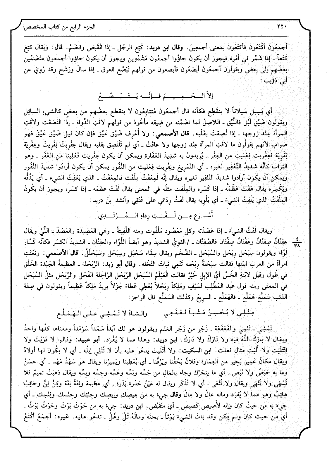 أَجْمَعُون أَكْنَعون فأكْنَعُون بِمَعْنى أَجْمَعِينَ. وَقَالَ ابْن دُرَيْد: كَتِعَ الرجل: إِذا انْقَبَض وانْضَمّ، قَالَ: ويُقال كَتِعَ كَتَعَاً إِذا شَمَّر فِي أمره فَيجوز أَن يكون جاؤا أَجْمَعُونَ أَبْصَعون فأَبْصعون من قَوْلهم تَبَصَّع الْعرق: إِذا سالَ ورَشَحَ وَقد رُوي عَن أبي ذُؤَيْب: إلاَّ الحَميمَ فإنَّه يَتَبَصَّعُ أَي يَسيل سَيلاناً فَكَأَنَّهُ قَالَ أَجْمَعُونَ مُتتابعون لَا يَنْقَطِع بعضُهم من بعضٍ كالشيءِ السائلِ وَيَقُولُونَ: ضَيِّقٌ لَيِّق فاللَّيِّق: اللاصق لما تَضَمَّنه من ضِيقه مَأْخُوذ من قَوْلهم لاقَتِ الدَّواة: إِذا التَصَقَت ولاقَتِ الْمَرْأَة عِنْد زَوْجها: إِذا لَصِقَت بِقَلْبِه. قَالَ الْأَصْمَعِي: وَلَا أعرف ضَيِّق عَيِّق فَإِن كَانَ قيل ضَيِّق عَيِّق فَهُوَ صَوَاب لأَنهم يَقُولُونَ مَا لاقَتِ المرأةُ عِنْد زوجِها وَلَا عاقَتْ: أَي لم تَلْتَصق بِقَلْبِه، ويُقال عِفْريتٌ نِفْريت وعِفْرِيَة نِفْرِيَة فعِفْريت فِعْليت من العَفَر: وَهُوَ التُّرَاب كأنّه شَدِيد التَّعْفير لغيره أَي التَّمْريغ ونِفْريت فِعْليت من النُّفور يُمكن أَن يكون أَرَادوا شديدَ النُّفور وَيُمكن أَن يَكُونُوا أَرَادوا شَدِيد التَّنْفير لغيره ويُقال عَفَتَ عَظْمَه: إِذا كَسَرَه والمِلْفت مثله فِي الْمَعْنى يُقَال لَفَتَ عَظْمَه: إِذا كَسَرَه وَيجوز أَن يكون المِلْفَتُ الَّذِي يَلْفِتُ الشيءَ: أَي يَلْوِيه، يُقَال لَفَتُّ رِدائي على عُنُقي وَأنْشد ابْن دُرَيْد: أَسْرَع من لَفْتِ رِداءِ المُرْتَدي ويُقال لَفَتُّ الشيءَ: إِذا عَصَدْته وكل مَعْصود مَلْفوت وَمِنْه اللَّفيتة وَهِي العَصيدة والعَصْد: اللَّيُّ ويُقال عِفِتَّان صِفِتَّان وعِفِّتان صِفِّتان فالصِفِتَّان: الْقوي الشَّديد وَهُوَ أَيْضا اللَّوَّاء والعِفِتَّان: الشَّديد الْكسر فَكَأَنَّهُ كَسَّار لَوَّاء وَيَقُولُونَ: سِبَحْل رِبَحْل، والسِّبَحْل: الضَّخْم ويُقال سِقاء سَحْبَل وسِبَحْل وسَبَحْلَلٌ، قَالَ الْأَصْمَعِي: ونَعَتَتِ امرأةٌ من الْعَرَب ابْنَتهَا فَقَالَت سِبَحْلَةٌ رِبَحْلَة تَنْمي نباتَ النَّخْلة. وَقَالَ أَبُو زيد: الرِّبَحْلة: الْعَظِيمَة الجَيِّدة الخَلْق فِي طول وَقيل لابنةِ الخُسِّ أَي الإبلِ خَيْرٌ فَقَالَت العَيْلَمُ السِّبَحْل الرِّبَحْل الرَّاحِلة الفَحْل والرِّبَحْل مثل السِّبَحْل فِي الْمَعْنى وَمِنْه قَول عبد المُطَّلِب لسَيْفٍ ومَلِكاً رِبَحْلاً يُعطي عَطاءً جَزْلاً يريدُ مَلِكاً عَظيماً، وَيَقُولُونَ: فِي صِفة الذِّئْب: سَمَلَّع هَمَلَّع: فالهَمَلَّع: السَّرِيع وَكَذَلِكَ السَّمَلَّع، قَالَ الراجز: مِثْلي لَا يُحسِنُ مَشْياً فَعْفَعي والشاةُ لَا تَمْشي على الهَمَلَّعِ تمشي: تَنْمي، والفَعْفَعَة: زَجْر من زَجْر الغَنَم وَيَقُولُونَ: هُوَ لكَ أبَداً سَمَداً سَرْمَداً وَمَعْنَاهَا كلهَا واحدٌ ويُقال لَا بارَكَ اللهُ فِيهِ وَلَا تارَكَ وَلَا دارَك. ابْن دُرَيْد: وَهَذَا مِمَّا لَا يُفْرَد. أَبُو عبيد: وَقَالُوا لَا دَرَيْت وَلَا ائْتَلَيْت وَلَا أَلَيْت مِثَال فعلت. ابْن السّكيت: وَلَا أَتْلَيتَ يَدْعُو عَلَيْهِ بِأَن لَا تُتْلي إبلُه: أَي لَا يكون لَهَا أولادٌ، ويُقال مكانٌ عَمِير بَجير من العِمارة وفلانٌ يَحُفُّنا ويَرُفُّنا: أَي يُعطينا ويَميرُنا ويُقال هُوَ سَهْدٌ مَهْد: أَي حَسَنٌ وَمَا بِهِ حَبَضٌ وَلَا نَبَض: أَي مَا يَتَحَرَّك وَجَاء بِالْمَالِ من حَسِّه وبَسِّه وعَسِّه وحِسِّه وبِسِّه ويُقال ذَهَبَتْ تميمٌ فَلَا تُسْهى وَلَا تُنْهى ويُقال وَلَا تُنْعى: أَي لَا تُذْكَر ويُقال لَهُ عَيْنٌ حَدْرَة بَدْرَة: أَي عَظِيمَة وثِقَةٌ نِقَة وكِنٌّ لِنٌّ وخابٌ هائِب وَهُوَ مِمَّا لَا يُفرد وَمَاله عالٌ وَلَا مالٌ وَقَالَ جئْ بِهِ من عِيصِك وإيصِك وجِنْثِك وجِنْسِك وقِنْسِك: أَي جئْ بِهِ من حيثُ كَانَ وَإنَّهُ لأَصيص كَص