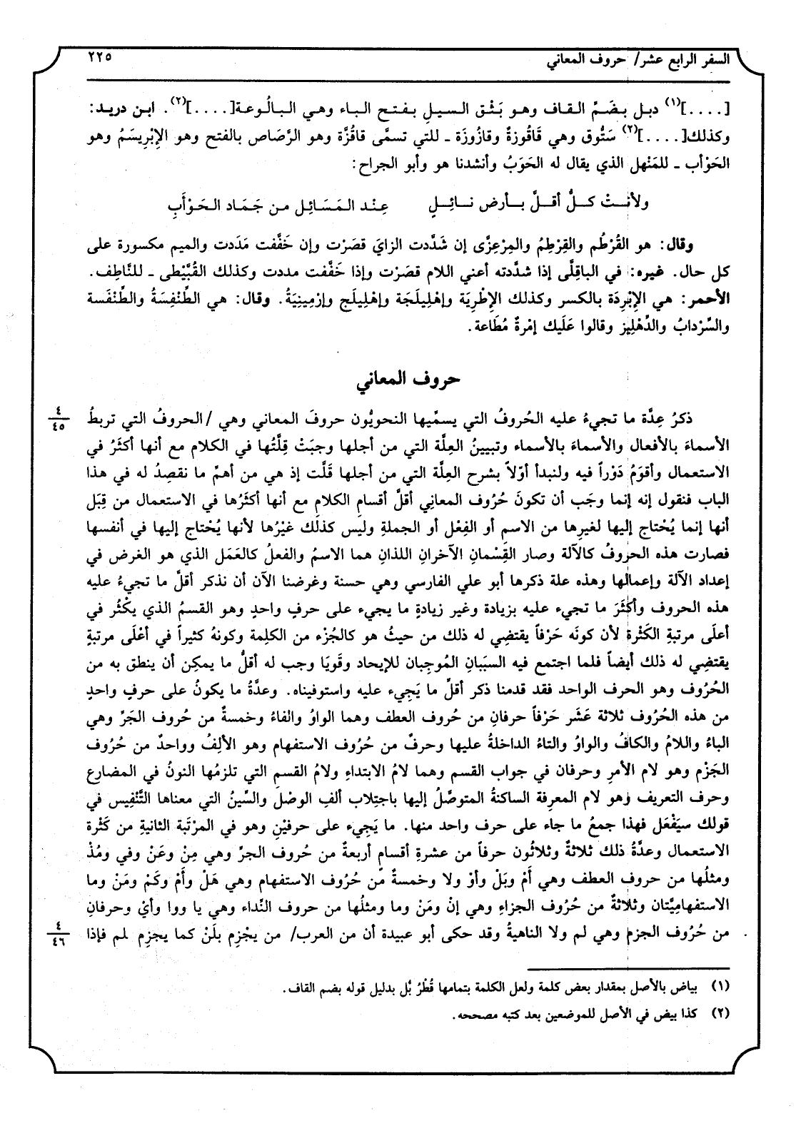 ذكرُ عِدَّة مَا تَجِيء عَلَيْهِ الحروفُ الَّتِي يسمِّيها النحويُّون حروفَ الْمعَانِي: وَهِي الْحُرُوف الَّتِي تربُط الأسماءَ بالأفعال والأسماء بالأسماء وتبينُ العِلَّة الَّتِي من أجلهَا وَجَبْتْ قِلَّتُها فِي الْكَلَام مَعَ أَنَّهَا أكثرُ فِي الِاسْتِعْمَال وأقوَمُ دَوْرَاً فِيهِ ولنبدأ أَولا بشرح العِلَّة الَّتِي من أجلهَا قَلَّت إِذْ هِيَ من أهمِّ مَا نقصِدُ لَهُ فِي هَذَا الْبَاب فَنَقُول إِنَّه إِنَّمَا وَجَبَ أَن تكونَ حُرُوف الْمعَانِي أقلَّ أقسامِ الكلامِ مَعَ أَنَّهَا أكثرُها فِي الِاسْتِعْمَال من قِبَل أَنَّهَا إِنَّمَا يُحتاج إِلَيْهَا لغَيْرهَا من الِاسْم أَو الْفِعْل أَو الْجُمْلَة وَلَيْسَ كَذَلِك غبرُها لِأَنَّهَا يُحتاج إِلَيْهَا فِي أَنْفسهَا فَصَارَت هَذِه الْحُرُوف كالآلة وَصَارَ القِسْمان الْآخرَانِ اللَّذَان هما الِاسْم وَالْفِعْل كالعَمَل الَّذِي هُوَ الْغَرَض فِي إعداد الْآلَة وأعمالها وَهَذِه عِلّة ذكرهَا أَبُو عَليّ الْفَارِسِي وَهِي حَسَنَة وغرضنا الْآن أَن نذْكر أقلَّ مَا تَجِيء عَلَيْهِ هَذِه الْحُرُوف وأكثرَ مَا تَجِيء عَلَيْهِ بِزِيَادَة وَغير زيادةٍ مَا يَجِيء على حرفٍ واحدٍ وَهُوَ القسمُ الَّذِي يَكثُر فِي أَعلَى مرتبَة الكَثرة لِأَن كَونه حَرْفَاً يَقْتَضِي لَهُ ذَلِك من حيثُ هُوَ كالجُزء من الْكَلِمَة وَكَونه كثيرا فِي أَعلَى مرتبةٍ يَقْتَضِي لَهُ ذَلِك أَيْضا فَلَمَّا اجْتمع فِيهِ السَببان الموجبان للإيجاد وقَويا وَجَبَ لَهُ أقلُّ مَا يُمكن أَن ينْطق بِهِ من الْحُرُوف وَهُوَ الْحَرْف الْوَاحِد فقد قدمنَا ذكر أقلِّ مَا يَجيء عَلَيْهِ واستوفيناه. وعدَّةُ مَا يكونُ على حرفٍ واحدٍ من هَذِه الْحُرُوف ثَلَاثَة عشر حَرْفَاً حرفان من حُرُوف الْعَطف وهما الْوَاو وَالْفَاء وخمسةٌ من حُرُوف الجرِّ وَهِي الْبَاء وَاللَّام وَالْكَاف وَالْوَاو وَالتَّاء الداخلةُ عَلَيْهَا وحرفٌ من حُرُوف الِاسْتِفْهَام وَهُوَ الْألف وواحدٌ من حُرُوف الجَزْم وَهُوَ لَام الْأَمر وحرفان فِي جَوَاب الْقسم وهما لَام الِابْتِدَاء ولامُ الْقسم الَّتِي تلزمُها النونُ فِي الْمُضَارع وحرف التَّعْرِيف وَهُوَ لَام الْمعرفَة الساكنةُ المتوصَّلُ إِلَيْهَا باجتلاب ألفِ الوَصْل والسِّينُ الَّتِي مَعْنَاهَا التَّنْفيس فِي قَوْلك سيَفْعَل فَهَذَا جمعُ مَا جَاءَ على حرف وَاحِد مِنْهَا، مَا يَجِيء على حَرْفَين وَهُوَ فِي الْمرتبَة الثَّانِيَة من كَثرة الِاسْتِعْمَال وعدَّةُ ذَلِك ثلاثةٌ وَثَلَاثُونَ حرفا من عشرَة أَقسَام: أربعةٌ من حُرُوف الْجَرّ وَهِي: مِنْ وعَنْ وَفِي ومُذْ. وَمثلهَا من حُرُوف الْعَطف وَهِي: أَمْ وبَلْ وأوْ وَلَا. وخمسةٌ من حُرُوف الِاسْتِفْهَام وَهِي: هَل وأمْ وكَمْ ومَنْ وَمَا الاستفهاميتان. وثلاثةٌ من حُرُوف الْجَزَاء وَهِي: إنْ ومَنْ وَمَا وَمثلهَا من حُرُوف النداء وَهِي: يَا ووا وأيْ. وحرفان من حُرُوف الْجَزْم وَهِي: لم وَلَا الناهية. وَقد حكى أَبُو عُبَيْدَة أَن من الْعَرَب من يَجْزِم بلَنْ كَمَا يجزِم بلَمْ فَإِذا