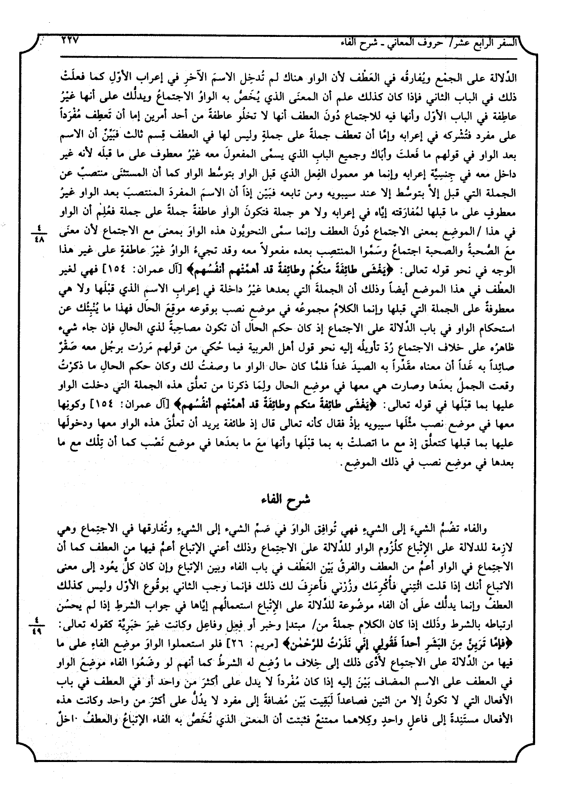 وَالْفَاء تضُمُّ الشيءَ إِلَى الشيءِ فَهِيَ تُوافِق الواوَ فِي ضَمِّ الشيءِ إِلَى الشيءِ وتُفارقها فِي الِاجْتِمَاع وَهِي لَازِمَة للدلالة على الاتْباع كلُزوم الْوَاو للدلالة على الِاجْتِمَاع وَذَلِكَ اعني الِاتِّبَاع أعمُّ فِيهَا من الْعَطف كَمَا أَن الِاجْتِمَاع فِي الْوَاو أعمُّ من الْعَطف والفرقُ بينَ العَطْف فِي بَاب الْفَاء وَبَين الِاتِّبَاع وَإِن كَانَ كلُّ يعود إِلَى معنى الِاتِّبَاع أَنَّك إِذا قلت ائْتِني فأُكْرِمَك وزُرْني فأَعرِفَ لَك ذَلِك فَإِنَّمَا وَجب الثَّانِي بِوُقُوع الأول وَلَيْسَ كَذَلِك العطفُ وَإِنَّمَا يدلُّك على أَن الْفَاء مَوْضُوعَة للدلالة على الِاتِّبَاع استعمالُهم إيّاها فِي جَوَاب الشرطِ إِذا لم يحسُن ارتباطه بِالشّرطِ وَذَلِكَ إِذا كَانَ الْكَلَام جملَة من مُبْتَدأ وَخبر أَو فعلٍ وفاعل وَكَانَت غيرَ خَبَرِيَّة كَقَوْلِه تَعَالَى: (فإمَّا تَرَيِنَّ مِنَ البشَرِ أحدا فَقولِي إنِّي نَذَرْتُ للرَّحْمن) فَلَو استعملوا الواوَ موضعَ الفاءِ على مَا فِيهَا من الدّلَالَة على الِاجْتِمَاع لأدّى ذَلِك إِلَى خِلاف مَا وُضِع لَهُ الشرطُ كَمَا أَنهم لَو وضَعوا الْفَاء موضِع الْوَاو فِي الْعَطف على الِاسْم الْمُضَاف بَيْنَ إِلَيْهِ إِذا كَانَ مُفرداً لَا يدل على أكثرَ من وَاحِد أَو فِي الْعَطف فِي بَاب الْأَفْعَال الَّتِي لَا تكونُ إِلَّا من اثْنَيْنِ فصاعِداً لبَقِيَت بَيْنَ مُضافةً إِلَى مُفْرد لَا يدُلُّ على أكثرَ من وَاحِد وَكَانَت هَذِه الْأَفْعَال مستَنِدةً إِلَى فاعلٍ واحدٍ وَكِلَاهُمَا ممتنعٌ فَثَبت أَن الْمَعْنى الَّذِي تَخُصُّ بِهِ الْفَاء الِاتِّبَاع والعطفُ داخلٌ