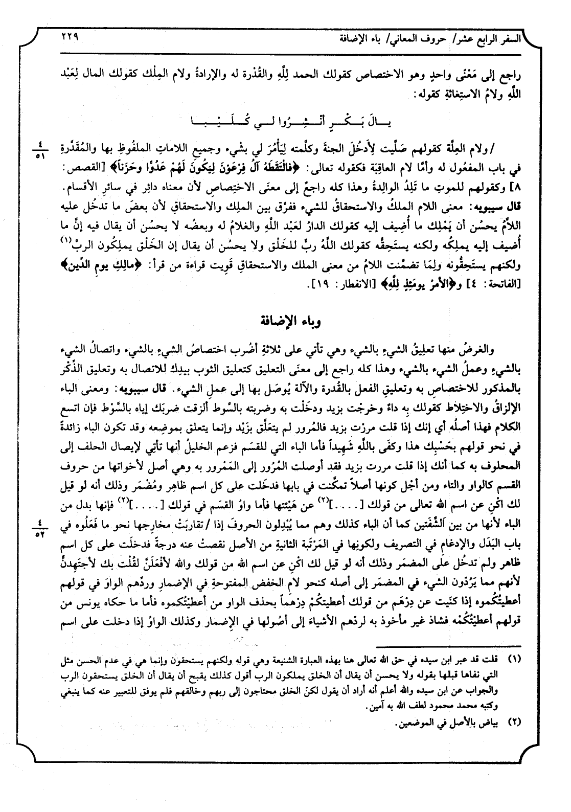 رَاجع إِلَى معنى واحدٍ وَهُوَ الِاخْتِصَاص كَقَوْلِك الْحَمد للهِ والقُدْرَة لَهُ والإرادة، وَلَام المِلْك كَقَوْلِك المَال لعبْدِ الله ولامُ الاستغاثة كَقَوْلِه: يالَ بَكْرٍ أنْشِروا لي كُلَيْبا وَلَام الْعلَّة كَقَوْلِهِم صَلَّيت لأَدْخُل الجنةَ وكلّمته ليأمرَ لي بِشَيْء وَجَمِيع اللامات الملفوظ بهَا والمُقَدَّرة فِي بَاب الْمَفْعُول لَهُ وَأما لَام الْعَاقِبَة فكقوله تَعَالَى: (فالْتَقَطَه آلُ فرعَوْنَ ليَكونَ لهُمْ عَدُوَّاً وَحَزَناً) . وكقولهم للموتِ مَا تَلِدَ الوالِدةُ وَهَذَا كُله راجعٌ إِلَى معنى الِاخْتِصَاص لِأَن مَعْنَاهُ دائر فِي سَائِر الْأَقْسَام. قَالَ سِيبَوَيْهٍ: معنى اللَّام الملكُ والاستحقاق للشَّيْء ففرّق بَين الْملك والاستحقاق لِأَن بعض مَا تدخلُ عَلَيْهِ اللَّام يحسُن أَن يَمْلِك مَا أُضيف إِلَيْهِ كَقَوْلِك الدارُ لِعَبْد اللهِ والغلامُ لَهُ وبَعْضُه لَا يحسُن أَن يُقَال فِيهِ إنَّ مَا أُضيف إِلَيْهِ يملكهُ وَلكنه يَسْتَحِقُّه كَقَوْلِك اللهُ ربُّ للخَلْق وَلَا يحسُن أَن يُقَال إِن الخَلْق يمْلِكون الربَّ ولكنّهم يُسْتَحَقُّونه ولِما تَضمَّنت اللَّام من معنى الْملك والاستحقاق قَوِيت قِرَاءَة من قَرَأَ مالِكِ يومِ الدِّين، والأمرُ يَوْمَئِذٍ للهِ.