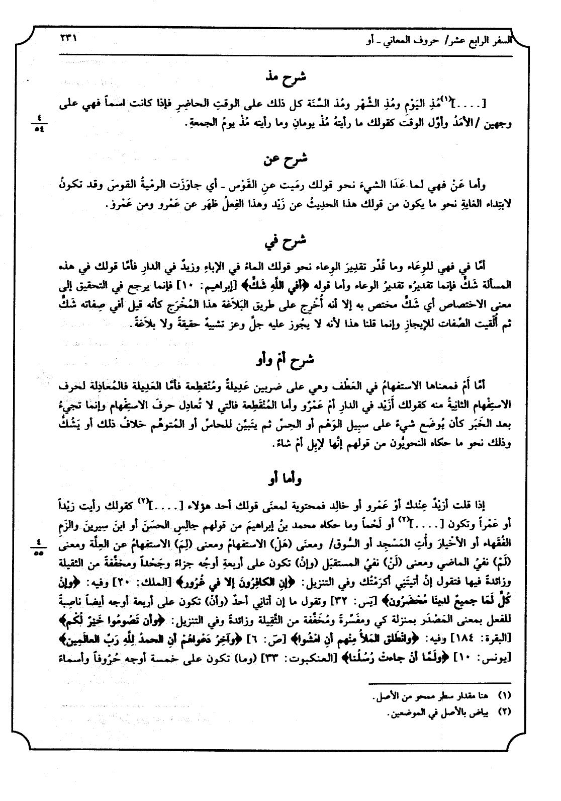 إِذا قلت أزيدٌ عِنْدك أَو عَمْرو أَو خَالِد فمحتوية لِمَعْنى قَوْلك أحد هَؤُلَاءِ ... . كَقَوْلِك رَأَيْت زيْداً أَو عمروا وَتَكون ... . أَو لَحْمًا وَمَا حَكَاهُ مُحَمَّد بن إِبْرَاهِيم من قَوْلهم جالِسِ الحسَنَ أَو ابنَ سِيرِين والزَمِ الْفُقَهَاء أَو الأخْيار وأتِ المَسْجِد أَو السُّوق وَمعنى هَلْ الِاسْتِفْهَام وَمعنى لِمَ الِاسْتِفْهَام عَن العِلَّة وَمعنى لَمْ نفي الْمَاضِي وَمعنى لَنْ نفي الْمُسْتَقْبل وإنْ تكون على أَرْبَعَة أوجه جَزَاء وجَحْداً ومخفَّفةً من الثَّقِيلَة وزائدةً فِيهَا فَتَقول إنْ أَتَيْتني أَكَرْمتُك وَفِي التَّنْزِيل: (إنِ الْكَافِرُونَ إِلَّا فِي غُرور) . وَفِيه: (وإنْ كُلٌّ لَما جميعٌ لدينا مُحضَرون) . وَتقول مَا إِن أَتَانِي أحدٌ وأنْ تكون على أَرْبَعَة أوجه أَيْضا ناصِبةً للْفِعْل بِمَعْنى الْمصدر بِمَنْزِلَة كي ومفَسِّرةً ومخفِّفة من الثَّقيلة وزائدةً وَفِي التَّنْزِيل: (وأنْ تَصوموا خَيْرٌ لكُمْ) . وَفِيه: (وانْطَلَقَ الملأُ مِنْهُم أَن امْشوا) . (وآخِرُ دَعْواهُم أنِ الحَمْدُ للهِ ربِّ العالَمين) . (ولَمَّا أنْ جاءتْ رًسُلُنا) . مَا: تكون على خَمْسَة أوجه حروفاً وَأَسْمَاء