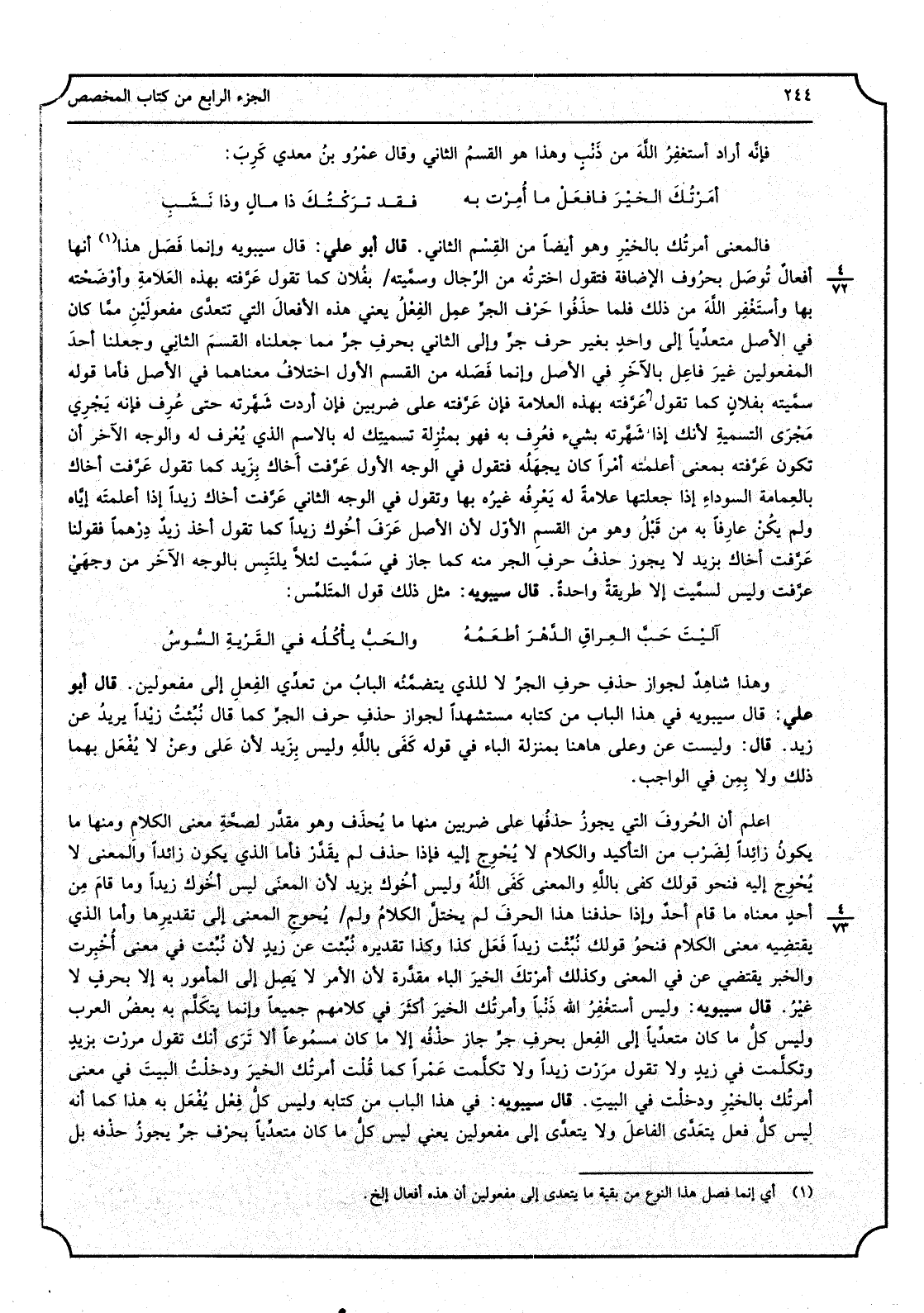 فإَّنه أَرَادَ: أستغفِرُ اللهَ من ذنبٍ وَهَذَا هُوَ الْقسم الثَّانِي وَقَالَ عَمْرو بنُ معدي كَرِبَ: أَمَرْتُكَ الخَيْرَ فافْعَلْ مَا أُمِرْت بِهِ فقد تَرَكْتُكَ ذَا مالٍ وَذَا نَشَبِ فَالْمَعْنى أَمرتك بِالْخَيرِ وَهُوَ أَيْضا من الْقسم الثَّانِي، قَالَ أَبُو عَليّ: قَالَ سِيبَوَيْهٍ: وَإِنَّمَا فَصَلَ هَذَا أَنَّهَا أفعالٌ توصَل بحروف الْإِضَافَة فَتَقول اخترتُه من الرِّجال وسمَّيته بفلان كَمَا تَقول عرَّفته بِهَذِهِ العَلامةِ وأوْضَحته بهَا وأستَغْفِر اللهَ من ذَلِك فَلَمَّا حَذَفوا حَرْفَ الجرِّ عمِلَ الفعلُ يَعْنِي هَذِه الأفعالَ الَّتِي تتعدّى إِلَى مفعولَيْن ممّا كَانَ فِي الأَصْل متعدّياً إِلَى واحدٍ بِغَيْر حرف جرٍّ وَإِلَى الثَّانِي بِحرف جرِّ مِمَّا جَعَلْنَاهُ القسمَ الثَّانِي وَجَعَلنَا أحد المفعولين غيرَ فَاعل بالآخرِ فِي الأَصْل وَإِنَّمَا فَصَلَه من الْقسم الأول اختلافُ مَعْنَاهُمَا فِي الأَصْل فَأَما قَوْله سمَّيته بفلانٍ كَمَا تَقول عرَّفته بِهَذِهِ الْعَلامَة فَإِن عرَّفته على ضَرْبَيْنِ فَإِن أردْت شَهَّرته حَتَّى عُرف فَإِنَّهُ يَجري مَجْرَى التَّسْمِيَة لِأَنَّك إِذا شَهَّرته بِشَيْء فعُرف بِهِ فَهُوَ بِمَنْزِلَة تسميتِك لَهُ بالاسمِ الَّذِي يُعرف لَهُ وَالْوَجْه الآخر أَن تكون عرَّفته بِمَعْنى أعلمته أمرا كَانَ يجهلُه فَتَقول فِي الْوَجْه الأول عَرَّفت أخاكَ بزيد كَمَا تَقول عَرَّفت أخاكَ بالعمامة السَّوْدَاء إِذا جَعلتهَا عَلامَة لَهُ يعْرِفُه غيرُه بهَا وَتقول فِي الْوَجْه الثَّانِي عَرَّفت أخاكَ زيدا إِذا أعلمتَه إِيَّاه وَلم يكن عارِفاً بِهِ من قَبْلُ وَهُوَ من الْقسم الأول لِأَن الأَصْل عَرَفَ أَخُوك زيدا كَمَا تَقول أَخذ زيدٌ دِرْهماً فقولنا عَرَّفت أَخَاك بزيد لَا يجوز حذفُ حرفِ الجرِّ مِنْهُ كَمَا جَازَ فِي سَمَّيت لئلاّ يَلْتَبِس بِالْوَجْهِ الآخر من وَجْهَيْ عرَّفت وَلَيْسَ لسمَّيت إِلَّا طريقةٌ وَاحِدَة. قَالَ سِيبَوَيْهٍ: مثل ذَلِك قَول المتَلَمِّس: آليْتَ حَبَّ العِراقِ الدَّهْرَ أطعَمُهُ والحَبُّ يأكلُهُ فِي القَرْيَةِ السُّوسُ وَهَذَا شاهدٌ لجَوَاز حذفِ حرفِ الجرِّ لَا للَّذي يتضمَّنه البابُ من تَعدّي الفعلِ إِلَى مفعولين. قَالَ أَبُو عَليّ: قَالَ سِيبَوَيْهٍ فِي هَذَا الْبَاب من كِتَابه مستشهداً لجَوَاز حذف حرفِ الجرِّ كَمَا قَالَ: نُبِّئتُ زيْداً يُرِيد عَن زيد. قَالَ: وَلَيْسَت عَن وعَلى هَهُنَا بِمَنْزِلَة الْبَاء فِي قَوْله كَفَىَ باللهِ وَلَيْسَ بزيد لِأَن عَليّ وَعَن لَا يُفْعَل بهما ذَلِك وَلَا بمِن فِي الْوَاجِب. اعْلَم أَن الحروفَ الَّتِي يجوزُ حذفُها على ضَرْبَيْنِ: مِنْهَا مَا يُحذَف وَهُوَ مقدَّر لصحَّة معنى الكلامِ وَمِنْهَا مَا يكونُ زَائِدا لِضَرْب من التَّأْكِيد وَالْكَلَام لَا يُحْوِج إِلَيْهِ فَإِذا حذف لم يقدَّر فَأَما الَّذِي يكون زَائِدا وَالْمعْنَى لَا يُحْوِج إِلَيْهِ فنحو قَوْلك كفى باللهِ وَالْمعْنَى كفى اللهُ وَلَيْسَ أَخُوك بزيد لِأَن الْمَعْنى لَيْسَ أَخُوك زيدا وَمَا قَامَ مِن أحدٍ مَعْنَاهُ مَا قَامَ أحدٌ وَإِذا حذفنا هَذَا الحرفَ لم يختلَّ معنى الكلامُ وَلم يُحوجِ الْمَعْنى إِلَى تقديرها وَأما الَّذِي يَقْتَضِيهِ معنى الْكَلَام فنحو قَوْلك نُبِّئْت زيدا فَعَلَ كَذَا وَكَذَا تَقْدِيره نُبِّئْت عَن زيدٍ لِأَن نُبِّّئْت فِي معنى أُخبِرت وَالْخَبَر يَقْتَضِي عَن فِي الْمَعْنى وَكَذَلِكَ أَمَرْتكَ الخيرَ الْبَاء مقدرَة لِأَن الْأَمر لَا يصل إِلَى الْمَأْمُور بِهِ إِلَّا بِحرف لَا غير. قَالَ سِيبَوَيْهٍ: وَلَيْسَ أستغفرُ الله ذَنْبَاً وأمرتك الخيرَ أكثرَ فِي كَلَامهم جَمِيعًا وَإِنَّمَا يتَكَلَّم بِهِ بعضُ الْعَرَب وَلَيْسَ كلُّ مَا كَانَ متعديّاً إِلَى الْفِعْل بِحرف جرٍّ جازَ حذفُه إِلَّا مَا كَانَ مسموعاً أَلا ترى 