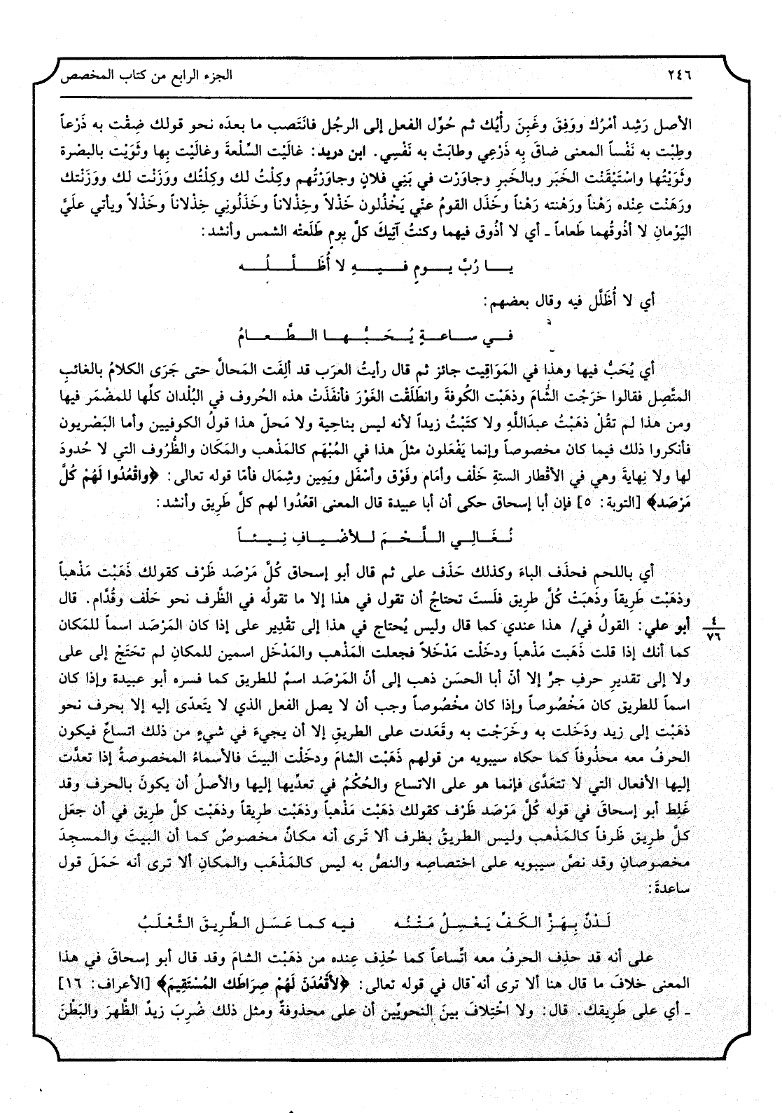 الأَصْل رَشِدَ أمْرُك ووَفِقَ وغَبِنَ رأيُك ثمَّ حُوِّل الْفِعْل إِلَى الرجل فانتَصَب مَا بعدهَ نَحْو قَوْلك ضِقْتُ ذَرْعَاً وطِبْتُ بِهِ نَفْسَاً الْمَعْنى ضاقَ بِهِ ذَرْعي وطابَتْ بِهِ نَفسِي. ابْن دُرَيْد: غَاَلَيْت السِّلْعة وغالَيْت بهَا وثَوَيْت بِالْبَصْرَةِ وثَوَيْتها وأَسْتَيقنْت الخبرَ وبالخبر وجَاَوَرْت فِي بني فلَان وجاوَرْتهم وكِلْتُ لَك وكِلْتُكَ ووَزَنْت لَك ووَزَنْتك ورَهَنْت عِنْده رَهْنَاً ورَهَنْته رَهْنَاً وخذلَ القومُ عني يَخْذُلون خَذْلاً وخِذْلاناً وخَذَلُوني خِذْلاناً وخَذْلاًَ وَيَأْتِي عليَّ اليومان لَا أذوقُهما طَعاماً: أَي لَا أَذُوق فيهمَا وكنتُ آتيكَ كلَّ يومٍ طَلَعْته الشَّمْس، وأنْشَد: يَا رُبَّ يومٍ فيهِ لَا أُظَلِّلُه أَي لَا أُظَلَّل فِيهِ، وَقَالَ بَعضهم: فِي ساعةٍ يُحِبُّها الطَّعامُ أَي يُحِبُّ فِيهَا وَهَذَا فِي المَواقيت جَائِز ثمَّ قَالَ رأيتُ العربَ قد أَلِفَت المَحالَّ حَتَّى جرى الكلامُ بالغائبِ المتَّصِل فَقَالُوا خَرَجْت الشامَ وذَهَبْت الكوفةَ وَاْنَطلقتُ الغَوْرَ فأنفذَتْ هَذِه الْحُرُوف فِي البُلدان كلِّها للمضمَر فِيهَا وَمن هَذَا لم تقُل ذَهَبْتَ عَبْدَ اللهِ وَلَا كَتَبْتُ زيدا لِأَنَّهُ لَيْسَ بِنَاحِيَة وَلَا محَلِّ هَذَا قَول الْكُوفِيّين وَأما البَصْريون فأنكروا ذَلِك فِيمَا كَانَ مَخْصُوصًا وَإِنَّمَا يَفْعَلون مثلَ هَذَا فِي المُبْهَم كالمَذْهب وَالْمَكَان والطُّروف الَّتِي لَا حُدُود لَهَا وَلَا نِهَايَة وَهِي فِي الأقطار السِّتَّة خَلْفَ وأمام وفَوْق وأَسْفَل ويَمين وشِمال، فَأَما قَوْله تَعَالَى: (واقْعُدوا لهُمْ كلَّ مَرْصَدْ) . فَإِن أَبَا إِسْحَاق حكى أَن أَبُو عُبَيْدَة قَالَ: الْمَعْنى اقعُدوا لَهُم كلَّ طَرِيق، وأنْشَد: نُغالي اللَّحْمَ لِلأَضْيافِ نِيئاً أَي بِاللَّحْمِ فحذفَ الباءَ وَكَذَلِكَ حَذَفَ على ثمَّ قَالَ أَبُو إِسْحَاق كلَّ مَرْصَد ظَرْف كَقَوْلِك ذَهَبْت مَذْهَباً وذَهَبْت طَرِيقا وذَهَبْت كلَّ طَرِيق فلستَ تحتاجُ أَن تَقول فِي هَذَا إِلَّا مَا تَقوله فِي الظَّرف نَحْو خَلْف وقُدَّام. قَالَ أَبُو عَليّ: القولُ فِي هَذَا عِنْدِي كَمَا قَالَ وَلَيْسَ يُحتاج فِي هَذَا إِلَى تَقْدِير على إِذا كَانَ المَرْصَد اسْما للمكان كَمَا أَنَّك إِذا قلت ذَهَبْت مَذْهَباً ودَخَلْت مَدْخَلاً فَجعلت المذْهب والمَدْخل اسْمَيْنِ للمكان لم تَحْتَج إِلَى على وَلَا إِلَى تَقْدِير حرفِ جرِّ إِلَّا أنّ أَبَا الْحسن ذهب إِلَى أَن المرْصَد اسمٌ للطريق كَمَا فسره أَبُو عُبَيْدَة وَإِذا كَانَ اسْما للطريق كَانَ مخْصوصاً وَإِذا كَانَ مَخْصُوصًا وَجب أَن لَا يصل الْفِعْل الَّذِي لَا يتعدّى إِلَيْهِ إِلَّا بِحرف نَحْو ذَهَبْت إِلَى زيد ودَخَلْت بِهِ وخَرَجْت بِهِ وقَعَدْت على الطَّرِيق إِلَّا أَن يَجِيء فِي شيءٍ من ذَلِك اتساعٌ فَيكون الحرفُ مَعَه محذوفاً كَمَا حَكَاهُ سِيبَوَيْهٍ من قَوْلهم ذَهَبْت الشامَ ودَخَلْت البيتَ فالأسماءُ المخصوصةُ إِذا تعدَّت إِلَيْهَا الْأَفْعَال الَّتِي لَا تتعدّى فَإِنَّمَا هُوَ على الاتساع والحُكْمُ فِي تعدِّيها إِلَيْهَا والأصلُ أَن يكونَ بالحرف وَقد غَلِطَ أَبُو إسحاقَ فِي قَوْله كلُّ مَرْصَد ظَرْف كَقَوْلِك ذَهَبْت مَذْهَباً وذَهَبْت طَريقاً وذَهَبْت كلَّ طَرِيق فِي أَن جعلَ كلَّ طَرِيق ظَرْفَاً كالمَذْهب وَلَيْسَ الطريقُ بظرف أَلا ترى أَنه مكانٌ مخصوصٌ كَمَا أَن البيتَ والمسجدَ مخصوصان وَقد نصَّ سِيبَوَيْهٍ على اختصاصِه والنصُّ بِهِ لَيْسَ كالمَذْهب والمكانِ أَلا ترى أَنه حَمَلَ قَول سَاعِدَة: لَدْنٌ بِهَزِّ الكَفِّ يَعْسِلُ مَتْنُه فِيهِ كَمَا عَسَلَ الطريقَ الثَّعْلَبُ على أَنه قد حُذف الحرفُ مَعَه اتساعاً كَمَا حُذف عِنْده من ذَهَبْت الشامَ وَقد قَالَ أَبُو إِسْحَاق فِي هَذَا الْمَعْنى خلافَ 
