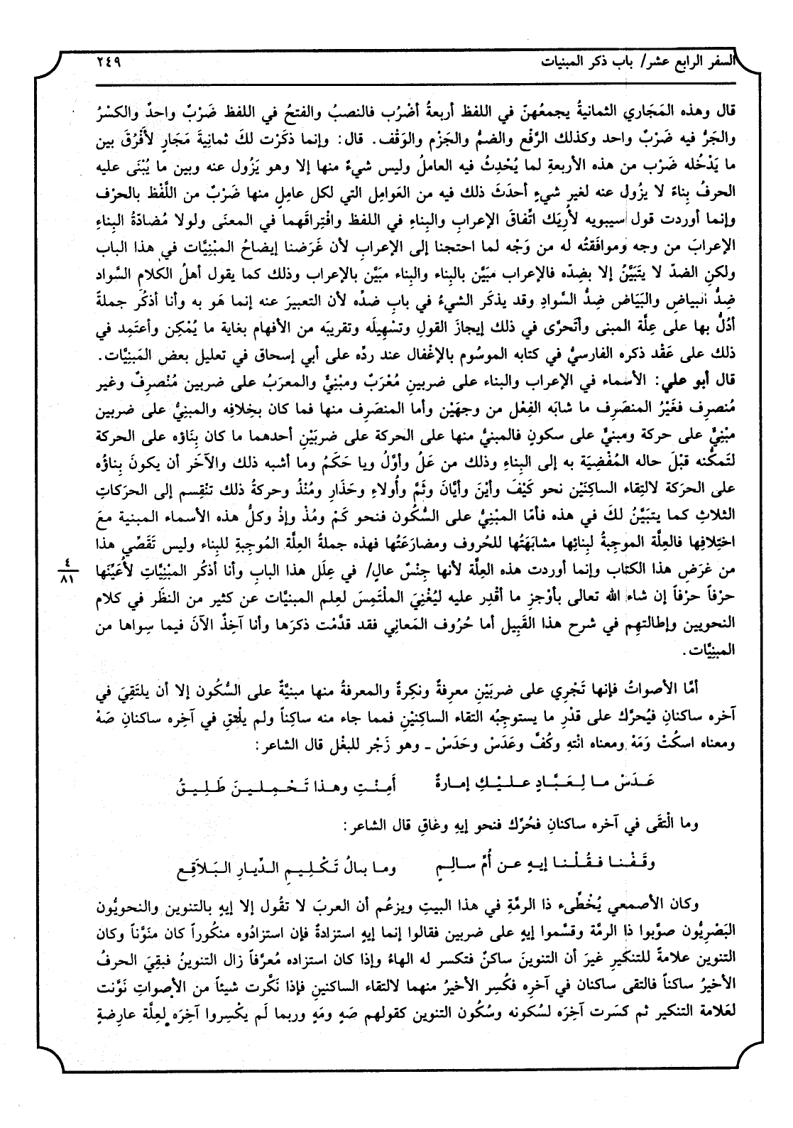 قَالَ وَهَذِه المجاري الثَّمَانِية يجمعهنَّ فِي اللَّفْظ أَرْبَعَة أضْرب فالنَّصب وَالْفَتْح فِي اللَّفْظ ضَرْبٌ وَاحِد، وَالْكَسْر والجَرُّ فِيهِ ضربٌ وَاحِد، وَكَذَلِكَ الرَّفعُ والضمُّ والجزم وَالْوَقْف. قَالَ: وَإِنَّمَا ذكرت لَك ثَمَانِيَة مجار لأَفْرُقَ بَين مَا يدْخلهُ ضرب من هَذِه الْأَرْبَعَة لما يُحدِث فِيهِ الْعَامِل وَلَيْسَ شيءٌ مِنْهَا إلاّ وَهُوَ يَزُول عَنهُ وَبَين مَا يُبنى عَلَيْهِ الْحَرْف بِنَاء لَا يَزُول عَنهُ لغير شيءٍ أحدَثَ ذَلِك فِيهِ من العوامل الَّتِي لكل عاملٍ مِنْهَا ضَربٌ من اللَّفْظ بالحرف وَإِنَّمَا أوردت قَول سِيبَوَيْهٍ لأُريكَ اتِّفاقَ الْإِعْرَاب وَالْبناء فِي اللَّفْظ وافتراقَهما فِي الْمَعْنى وَلَوْلَا مُضادَّةُ الْبناء الإعرابَ من وَجه وموافقتُه لَهُ من وَجه لما احتجنا إِلَى الْإِعْرَاب لأنَّ غرضَنا إِيضَاح المبنِيَّات فِي هَذَا الْبَاب، وَلَكِن الضدّ لَا يتبيَّن إِلَّا بضدِّه، فالإعراب مبيَّن بِالْبِنَاءِ وَالْبناء مبيَّن بالإعراب، وَذَلِكَ كَمَا يَقُول أهل الْكَلَام السَّواد ضدّ الْبيَاض وَالْبَيَاض ضدّ السَّواد، وَقد يُذكَر الشَّيْء فِي بَاب ضدّه لِأَن التَّعْبِير عَنهُ إِنَّمَا هُوَ بِهِ، وَأَنا أذكر جملَة أدُلُّ بهَا على عِلَّة الْمَبْنِيّ وأتحرّى فِي ذَلِك إنجاز القَوْل وتسهيله وتقريبه من الأفهام بغاية مَا يُمكن وأعتمد فِي ذَلِك على عقد ذكره الفارسيّ فِي كِتَابه الموسوم بالإغفال عِنْد ردِّه على أبي إِسْحَاق فِي تَعْلِيل بعض المبنيّات. قَالَ أَبُو عَليّ: الْأَسْمَاء فِي الْإِعْرَاب وَالْبناء على ضَرْبَيْنِ: مُعْرَبٌ ومبنيٌّ والمعرب على ضَرْبَيْنِ مُنْصَرِفٌ وَغير منصرف فَغير المنصرف مَا شابه الْفِعْل من وَجْهَيْن وَأما المنصرف مِنْهَا فَمَا كَانَ بِخِلَافِهِ، والمبنيُّ على ضَرْبَيْنِ مَبْنِيّ على حَرَكَة ومبني على سُكُون فالمبني مِنْهَا على الْحَرَكَة على ضَرْبَيْنِ أَحدهمَا مَا كَانَ بِنَاؤُه على الْحَرَكَة لتمكُّنه قبلَ حَاله المُفْضِيَة بِهِ إِلَى الْبناء وَذَلِكَ من علُ وأوَّل وَيَا حَكَمُ وَمَا أشبه ذَلِك وَالْآخر أَن يكون بِنَاؤُه على الْحَرَكَة لالتقاء الساكنين نَحْو كَيفَ وَأَيْنَ وأيّانَ وثَمَّ وأُولاءِ وحَذار ومُنذُ وحركة ذَلِك تَنْقَسِم إِلَى الحركات الثَّلَاث كَمَا يتبيَّن لَك فِي هَذِه، فَأَما المبنيُّ على السُّكون فنحو كَمْ ومُذْ وإذْ وكلُّ هَذِه الْأَسْمَاء المبنيَّة مَعَ اختلافها فالعِلَّة الْمُوجبَة لبنائها مشابهتُها للحروف ومُضارعتُها فَهَذِهِ جملَة العلَّة الْمُوجبَة للْبِنَاء وَلَيْسَ تَقَصّي هَذَا من غَرَض هَذَا الْكتاب وَإِنَّمَا أوردت هَذِه العلَّة لِأَنَّهَا جِنسٌ عالٍ فِي علل هَذَا الْبَاب، وَأَنا أذكر المبنيّات لأُعيِّنها حرفا حرفا إِن شَاءَ الله تَعَالَى بأوجز مَا أقدر عَلَيْهِ ليُغني الملتمس لعلم المبنيّات عَن كثير من النّظر فِي كَلَام النّحويين وإطالتهم فِي شرح هَذَا القَبيلَ أما حُرُوف الْمعَانِي فقد قدّمت ذكرهَا وَأَنا آخذٌ الْآن فِيمَا سواهَا من المبنيّات. أما الْأَصْوَات فَإِنَّهَا تجْرِي على ضَرْبَيْنِ معرفَة ونكرة، والمعرفة مِنْهَا مبنيَّة على السّكون إلاّ أَن يلتقي فِي آخِره ساكنان فيحرَّك على قدر مَا يستوجبه التقاء الساكنين فمما جَاءَ مِنْهُ سَاكِنا وَلم يلتق فِي آخِره ساكنان صَهْ وَمَعْنَاهُ اسكُتْ، ومَهْ وَمَعْنَاهُ انتَهِ وكُفَّ، وعدَسْ وحَدَسْ: وَهُوَ زَجر للبغل قَالَ الشَّاعِر: عَدَسْ مَا لِعَبّادٍ عليكِ إمارةٌ أَمِنْتِ وَهَذَا تَحْمِلينَ طَليقُ وَمَا التقى فِي آخِره ساكنان فحُرِّك فنحو: إيه وغاقِ قَالَ الشَّاعِر: وَقَفنا فقُلنا إيهِ عَن أُمِّ سالِمٍ وَمَا بالُ تَكليمِ الدِّيار البَلاقِع وَكَانَ الْأَصْمَعِي يُخَطِّئ ذَا الرِّمَّة فِي هَذَا الْبَيْت وَيَزْعُم أَن الْعَرَب لَا تَقول إِلَّا 