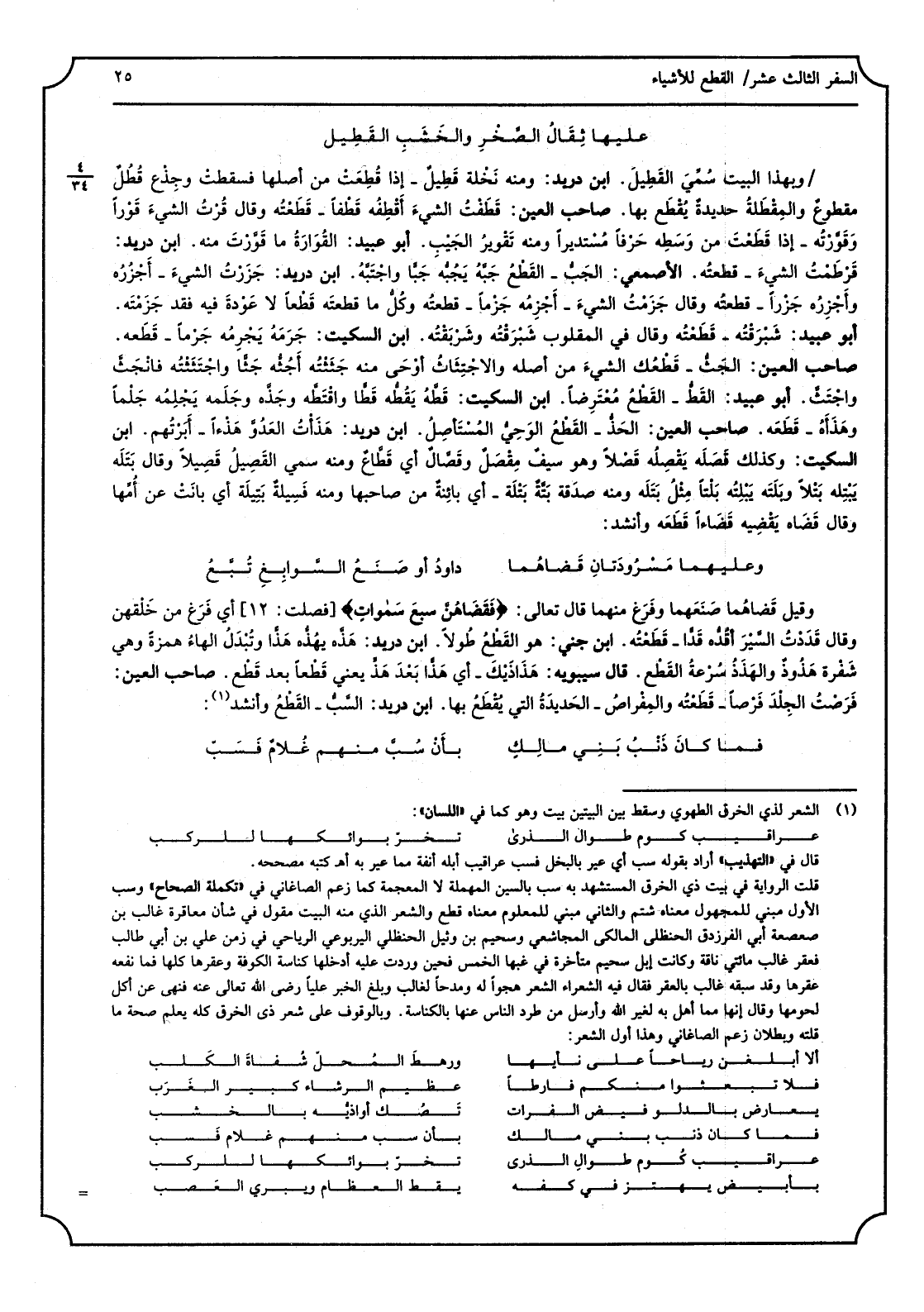 عَلَيْهَا ثِقالُ الصَّخر والخشَبِ القَطيلِ وَبِهَذَا الْبَيْت سمّي القطيل. ابْن دُرَيْد: وَمِنْه نخلةٌ قَطيلٌ: إِذا قطعت من أَصْلهَا فَسَقَطت، وجِذعٌ قُطُلٌ مَقْطُوع والمِقْطَلة: حَديدة يُقطع بهَا. صَاحب الْعين: قَطَفْتُ الشّيء أَقْطِفُه قَطْفاً: قطَعْتُه، وَقَالَ: قرْتُ الشّيءَ قَوْراً وقوَّرْتُه: إِذا قطعت من وَسطه حرفا مستديراً وَمِنْه تَقْوير الجَيْب. أَبُو عُبَيْد: القُوارَة: مَا قوَّرْتَ مِنْهُ. ابْن دُرَيْد: قرْطَمْتُ الشّيء: قطعته. الْأَصْمَعِي: الجَبُّ: الْقطع، جبَّه يجبُّه جَبّاً واجتبَّه. ابْن دُرَيْد: جَزَرْتُ الشّيء: أجزُرُه وأجزِرُه جَزْراً: قطعته، وَقَالَ: جزَمْتُ الشّيء: أجزِمُه جَزماً، قطعته وكل مَا قطعته قطعا لَا عودة فِيهِ فقد جَزَمْته. أَبُو عُبَيْد: شبْرَقْتُه: قطعته، وَقَالَ فِي المقلوب شَبْرَقْتُه وشَرْبَقْتُه. ابْن السّكيت: جرمَه يجرِمُه جَرْماً: قطعه. صَاحب الْعين: الجَثُّ: قَطعك الشّيء من أَصله، والاجتثاث أوحى مِنْهُ جَثَثْتُه أَجُثُّه جَثّاً واجْتَثَثْتُه فانْجَثَّ واجْتَثَّ. أَبُو عُبَيْد: القَطُّ: الْقطع مُعْتَرضًا. ابْن السّكيت: قطَّه يقُطُّه قطّاً واقْتَطَّه وجَذَّه وجلَمَه يجلِمُه جَلْماً وهَذَأَه: قطعه. صَاحب الْعين: الحَذُّ: الْقطع الوحِيُّ المُسْتَأْصِل. ابْن دُرَيْد: هذأت العدوَّ هَذْءَاً: أبَرْتُهم. ابْن السّكيت: وَكَذَلِكَ قَصَلَه يقصِلُه قَصْلاً، وَهُوَ سيفٌ مِقصَلٌ وقَصَّالٌ أَي قطّاعٌ وَمِنْه سمّي القَصيل قَصيلاً، وَقَالَ بتَلَه يبتِله بَتلاً وبلَتَه يبلِته بَلْتاً مثل بتله، وَمِنْه صدَقةٌ بَتَّة بتلَة: أَي بَائِنَة من صَاحبهَا وَمِنْه فسيلة بَتيلة أَي بَانَتْ عَن أمّها، وَقَالَ: قَضاه يَقْضيه قَضاءً: قطعه، وَأنْشد: وَعَلَيْهِمَا مسرودتان قضاهما داودُ أَو صَنعُ السّوابغِ تُبَّعُ وَقيل قضاهما صنعهما وَفرغ مِنْهُمَا، قَالَ تَعَالَى: (فقضاهُنَّ سبعَ سماواتٍ) أَي فرغ من خَلقهنَّ، وَقَالَ قددت السّير أقُدُّه قَدّاً: قطَعته. ابْن جني: هُوَ الْقطع طولا. ابْن دُرَيْد: هذَّه يهُذُّه هذّاً وتبدل الْهَاء همزَة وَهِي شفرةٌ هَذوذ والهَذَذُ سرعَة الْقطع. قَالَ سِيبَوَيْهٍ: هَذَا ذَيْكَ: أَي هذّا بعد هذٍّ يَعْنِي قَطْعاً بعد قَطْعٍ. صَاحب الْعين: فَرَصْتُ الجِلد فَرْصاً: قطعته والمِفْراص: الحديدة التّي يقطع بهَا. ابْن دُرَيْد: السّبُّ: الْقطع وَأنْشد: فَمَا كَانَ ذنبُ بني مالِكٍ بِأَن سُبَّ مِنْهُم غلامٌ فسَبّْ