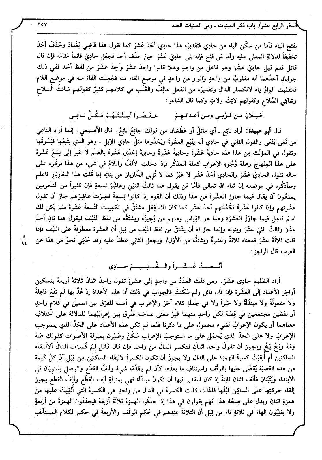 بِفَتْح الْيَاء فَأَما من سكَّن الْيَاء من حاديْ فتقديرُه هَذَا حادي أَحَدَ عَشَرَ كَمَا تَقول هَذَا قَاضِي بَغْدَاد وحَذَفَ أَحَدَ تَخْفِيفًا لدلَالَة الْمَعْنى عَلَيْهِ وَأما من فتح فَإِنَّهُ بنى حاديَ عَشَرَ حينَ حذف أحدَ فَجعل حاديَ قَائِما مقَامه فَإِن قَالَ قَائِل فَلم قيل حاديْ عَشَرَ وَهُوَ فَاعل من واحدٍ وهلا قَالُوا واحدَ عَشَرَ وآحِدَ عشرَ من لفظ أحَد فَفِي ذَلِك جوابانِ أحدُهما أَنه مقلوبٌ من واحدٍ وَالْوَاو من واحدٍ فِي مَوضِع الْفَاء مِنْهُ فجُعلت الفاءُ مِنْهُ فِي مَوضِع اللَّام فَانْقَلَبت الواوُ يَاء لانكسارِ الدالِ وتقديرُه من الْفِعْل عالفٌ والقَلْب فِي كَلَامهم كثير كَقَوْلِهِم شائِكُ السلاحِ وشاكي السِّلَاح، وكقولهم لائِثٌ ولاثٍ وكما قَالَ الشَّاعِر: خَيلانِ من قوْمي وَمن أعدائِهِمْ خفَضوا أسِنَّتَهُمْ فكُلُّ ناعي قَالَ أَبُو عُبَيْدَة: أَرَادَ نائِع: أَي مائلٌ أَو عَطْشَان من قَوْلك جائِعٌ نائِع، قَالَ الْأَصْمَعِي: إِنَّمَا أَرَادَ الناعي من نَعَىَ يَنْعَى. وَالْقَوْل الثَّانِي فِي حادي أَنه يَتْبَع العَشرةَ ويَحْدوها مثلُ حادي الْإِبِل: وَهُوَ الَّذِي يَتْبَعُها فيَسوقُها وَتقول فِي المؤنَّث مِن هَذَا هَذِه حاديةَ عَشْرَةَ وحاديةٌ عَشْرَةً وحاديةُ إحْدى عَشْرَةَ بِالضَّمِّ لَا غير إِلَى تِسعَ عَشْرَةَ على هَذَا المِنْهاج وَعلة وُجوهِ الْإِعْرَاب كعلة المذكَّر فَإِذا دخلتِ الألفُ واللامُ فِي شَيْء من هَذَا تَرَكُوهُ على حَاله تَقول الحاديْ عَشَرَ وَالْحَادِي أَحَدَ عَشَرَ لَا غيرُ كَمَا لَا تُزيل الخازِ بازِ عَن بنائِهِ إِذا قلت هَذَا الخازِ بازِ فَاعْلَم وسأذكره فِي مَوْضِعه إِن شَاءَ الله تَعَالَى فأمّا من يَقُول هَذَا ثالثُ اثْنَيْن وعاشِرُ تِسعةٍ فَإِن كثيرا من النَّحْوِيين يمْنَعُونَ أَن يُقَال فِيمَا جَاوز العشرةَ من هَذَا وَذَلِكَ أَن الْقَوْم إِذا كَانُوا تِسْعَة فصِرْت عاشِرَهم جَازَ أَن تَقول عَشَرتهم وَإِذا كَانُوا عَشَرَة فكمَّلَهم أحد عَشَرَ كَمَا كَانَ لَك فِعْل مشتَقٌّ فِي تكميلك التسعةَ عشرَةَ فَلم يكن لَك اسمُ فَاعل فِيمَا جاوَزَ العشرةَ وَهَذَا هُوَ الْقيَاس وَمِنْهُم من يُجيزُه ويشتقُّه من لفظ النَّيِّف فَيَقُول هَذَا ثانٍ أحدَ عَشَرَ وثالثٌ اثْنَي عشرَ وينونه وَإِنَّمَا جَازَ لَهُ أَن يشتقَّ من لفظ النَّيِّف من قِبَل أَن الْعشْرَة معطوفةٌ على النيِّف فَإِذا قلت ثلاثةَ عَشَرَ فَمَعْنَاه ثلاثةٌ وعشرةٌ ويشتقُّه من الأوّل وَيجْعَل الثَّانِي عطفا عَلَيْهِ وَقد حُكي نحوٌ من هَذَا عَن الْعَرَب، قَالَ الراجز: أَنْعَتُ عَشْرَا والظَّلِيمُ حادِي أَرَادَ الظليم حادي عشر: وَمن ذَلِك لعَدَدُ من واحدٍ إِلَى عشرَة تَقول وَاحِد اثْنَان ثَلَاثَة أرْبَعة بتسكين أَوَاخِر الْأَعْدَاد إِلَى العشَرة، فَإِن قَالَ قَائِل وَلم سُكِّنَتْ فَالْجَوَاب فِي ذَلِك أَن هَذِه الْأَعْدَاد إِذْ عُدَّ بهَا لم تقع فاعلةً وَلَا مفعولةً وَلَا مُبتَدأَة وَلَا خبَراً وَلَا فِي جملَة كَلَام آخر، وَالْإِعْرَاب فِي أَصله للْفرق بَين اسْمَيْنِ فِي كلامٍ واحدٍ أَو لفظين مُجْتَمعين فِي قصَّة لكل وَاحِد مِنْهُمَا غير معنى صَاحبه ففُرِقَ بَين إعرابيهما للدلالة على اخْتِلَاف مَعْنَاهُمَا أَو يكون الْإِعْرَاب لشيءٍ محمولٍ على مَا ذكرنَا، فَلَمَّا لم تكن هَذِه الْأَعْدَاد على الحدّ الَّذِي يُحمل على مَا اسْتوْجبَ الْإِعْرَاب سُكِّنَ وصُيِّرْنَ بِمَنْزِلَة الْأَصْوَات كَقَوْلِك صَهْ ومَهْ وبَخْ بَخْ، وَيجوز أَن تَقول وَاحِد اثْنَان فتكسر الدالَ من وَاحِد، فَإِن قَالَ قَائِل لم كُسِرَت الدَّال لالتقاء الساكنين أم أُلقيَت كسرة الْهمزَة على الدَّال وَلَا يجوز أَن تكون الكسرة لالتقاء الساكنين من قِبَلِ أنَّ كلمة من هَذِه القضيَّة يُقضى عَلَيْهَا بِالْوَقْفِ واستئناف مَا بعْدهَا كَأَن لم يتقدَّمه شيءٌ