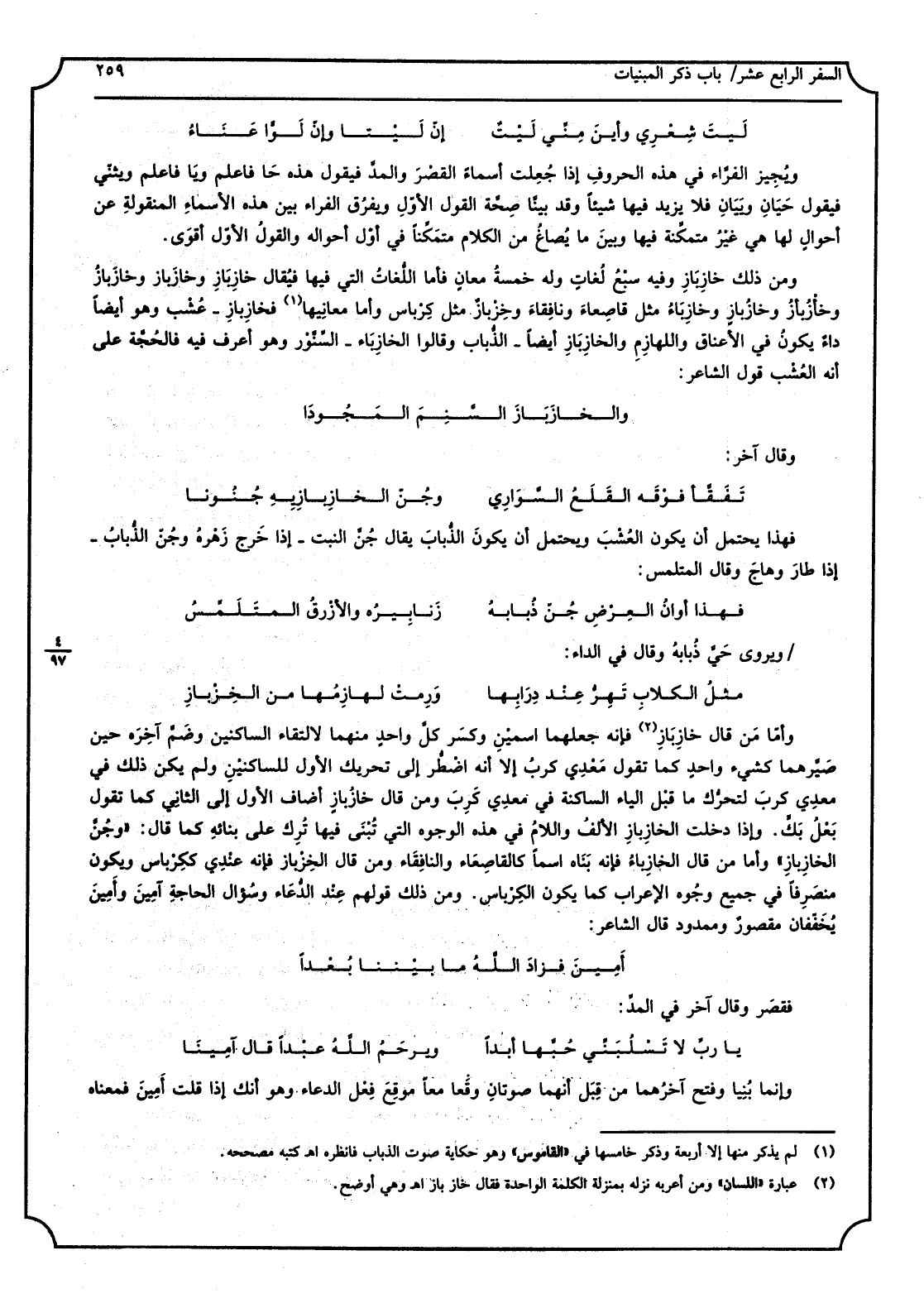لَيتَ شِعري وأينَ مِنِّي لَيْتٌ إنّ لَيْتا وإنّ لَوّاً عَناءُ ويُجيز الفرّاء فِي هَذِه الْحُرُوف إِذا جُعِلت أَسمَاء القَصرَ والمَدَّ فَيَقُول هَذِه حا فَاعْلَم وَيَا فَاعْلَم ويثنّي فَيَقُول حَيانِ ويَيَانِ فَلَا يزِيد فِيهَا شَيْئا، وَقد بيّنّا صحَّة القَوْل الأوّل، ويفرُق الْفراء بَين هَذِه الْأَسْمَاء المنقولة عَن أحوالٍ لَهَا هِيَ غيرُ متمكِّنة فِيهَا وَبَين مَا يصاغ من الْكَلَام متمَكِّنا فِي أوّل أَحْوَاله وَالْقَوْل الأوّل أقوى. وَمن ذَلِك خازِ بَازِ وَفِيه سبعُ لغاتٍ وَله خَمْسَة معانٍ، فَأَما اللُّغَات الَّتِي فِيهَا فَيُقَال خازِ بازِ وخازَ بازَ وخازَ بازُ وخأْزُ بأْزُ وخازُ بازٍ وخازِ باءُ مثل قاصِعاءَ ونافِقاءَ وخِزْبازٌ مثل كِرْباس، وَأما مَعَانِيهَا: فخازِبازِ: عُشْب، وَهُوَ أَيْضا داءٌ يكون فِي الْأَعْنَاق والّلهازم، والخازبازِ أَيْضا: الذُّباب، وَقَالُوا الخازِباء: السِّنَّوْر وَهُوَ أعرف فِيهِ فالحجّة على أَنه العشب قَول الشَّاعِر: والخازَ بازَ السَّنِمَ المَجودا وَقَالَ آخر: تَفَقَّأ فوقَه القَلَعُ السَّواري وجُنَّ الخازِ بازِ بِهِ جُنونا فَهَذَا يحْتَمل أَن يكون العشبَ وَيحْتَمل أَن يكون الذُّبابَ، يُقَال جُنَّ النَّبْتُ إِذا خرج زهرُه، وجُنّ الذّباب: إِذا طَار وهاج وَقَالَ المتلمس: فَهَذَا أوانُ العِرْضِ جُنَّ ذُبابُهُ زَنابيرُهُ والأزْرَقُ المُتَلَمِّس ويروى حَيَّ ذُبابُه وَقَالَ فِي الدَّاء: مثلُ الكلابِ تَهِرُّ عِنْد دِرابِها وَرِمَتْ لَهازِمُها من الخِزبازِ وَأما من قَالَ خازِ بازِ فَإِنَّهُ جَعلهمَا اسْمَيْنِ وَكسر كلَّ وَاحِد مِنْهُمَا لالتقاء الساكنين وضَمَّ آخِره حِين صيَّرهما كشيءٍ وَاحِد كَمَا تَقول مَعْدي كربُ إلاّ أَنه اضطرَّ إِلَى تَحْرِيك الأوّل للساكنين وَلم يكن ذَلِك فِي معدِي كربَ لتحرُّكِ مَا قبل الْيَاء الساكنة فِي معدِي كَرِبَ، وَمن قَالَ خازُ بازٍ أضَاف الأوّل إِلَى الثَّانِي كَمَا تَقول بَعْلُ بَكٍّ. وَإِذا دخلت الخازِ بازِ الْألف واللامُ فِي هَذِه الْوُجُوه الَّتِي تُبنى فِيهَا تُرِك على بنائِهِ كَمَا قَالَ وجُنَّ الخازِ بازِ، وَأما من قَالَ الخازِباءُ فَإِنَّهُ بناه اسْما كالقاصِعاء والنافِقاء، وَمن قَالَ الخِزْباز فَإِنَّهُ عِنْدِي ككِرْباس وَيكون منصرفاً فِي جَمِيع وُجُوه الْإِعْرَاب كَمَا يكون الكِرباس. وَمن ذَلِك قَوْلهم عِنْد الدُّعَاء وسؤال الْحَاجة آمين وأُمينَ يُخَفِّفان مقصورٌ وممدودٌ قَالَ الشَّاعِر: أَمينَ فَزَاد اللهُ مَا بَيْننَا بُعْدا فقَصَرَ وَقَالَ آخر فِي المَدِّ: يَا ربِّ لَا تَسْلُبَنِّي حُبَّها أبدا ويرحمُ اللهُ عبْداً قَالَ آمينا وَإِنَّمَا بُنيا وفُتِح آخرهما من قِبَل أَنَّهُمَا صوتان وَقعا مَعًا موقعَ فِعْل الدُّعَاء وَهُوَ أَنَّك إِذا قلت أَمينَ فَمَعْنَاه