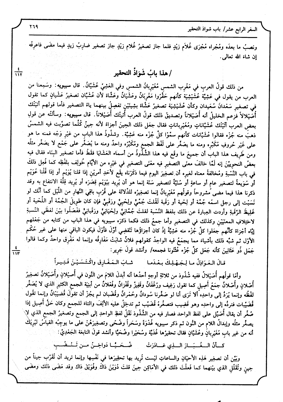 من ذَلِك قولُ العربِ فِي مَغْرِب الشَّمْس مُغَيْرِبان الشَّمْس وَفِي العشيِّ عُشّيَّان، قَالَ سِيبَوَيْهٍ: وسَمِعنا من الْعَرَب من يَقُول فِي عَشِيَّة عُشَيْشِيَة كَأَنَّهُمْ حقَّروا مَغْرِبانٌ وعَشْيَانٌ وعَشَّاة لِأَن عُشَيَّان تَصْغِير عَشْيانٍ كَمَا تَقول فِي تَصْغِير سَعْدَان سُعَيْدان وَكَأن عُشَيْشِيَة تَصْغِير عَشَّاة بشِينَيْنِ تفصِلُ بَينهمَا ياءُ التصغير فَأَما قَوْلهم أَتَيْتُكَ أُصَيْلالاً فَزعم الْخَلِيل أَنه أُصَيْلاناً وتصديقُ ذَلِك قولُ الْعَرَب أَتَيْتكَ أُصَيْلاناً، قَالَ سِيبَوَيْهٍ: وسألتُه عَن قولِ بعضِ الْعَرَب أَتَيْتُك عُشَيَّاناتٍ ومُغَيْرِباناتٍ فَقَالَ: جعل ذَلِك الحينَ أَجزَاء لِأَنَّهُ حينٌ كلَّما تصوَّبَت فِيهِ الشمسُ ذهبَ مِنْهُ جُزءٌ فَقَالُوا عُشَيَّانات كَأَنَّهُمْ سمَّوا كلَّ جزءٍ مِنْهُ عَشِيَّة، وشذوذ هَذَا الْبَاب من غَيْرِ وَجْه فَمِنْهُ مَا هُوَ على غير حروفِ مُكَبَّرِه وَمِنْه مَا يُصغَّر على لفْظ الجمعِ ومُكَبَّرُه واحدٌ وَمِنْه مَا يُصغَّر على جَمْع لَا يُصغَّر مثلُه وَمن طَريف هَذَا الْبَاب أَن جميعَ مَا وَقع فِيهِ هَذَا الشذوذُ من أَسمَاء العَشايا فقطْ فَأَما تَصْغِير البِناء فَقَالَ فِيهِ بعض النَّحْوِيين إِنَّه لمَّا خالَف معنى التصغيرِ فِيهِ معنى التصغير فِي غيرِه من الأيَّام خُولِف لفْظِه كَمَا فعلِل ذلكَ فِي بَاب النِّسْبَةِ ومُخالفةُ مَعْنَاهُ لغيره أَن تصغيرَ الْيَوْم فِيمَا ذَكرْنَاهُ يَقع لأحدِ أمرَيْنِ إِذا قُلنا يُوَيْم أَو إِذا قُلْنَا عُوَيْم أَو سُوَيْعةٌ لتصغير عامٍ أَو ساعةٍ أَو سُنَيَّةٌ لتصغير سَنَة إِنَّمَا هُوَ أَن يُريد بيُوَيْم قِصَرَه أَو يُرِيد قِلَّة الِانْتِفَاع بِهِ وَقد ذكرنَا هَذَا فِيمَا مضى مشروحاً وقولُهم مُغَيْرِبانٌ إِنَّمَا تصغيرُه للدِّلالة على قُرْبِ بَاقِي النهارِ من اللَّيْل كَمَا أنَّك لَو نَسَبْت إِلَى رجل اسْمه جُمَّة أَو لِحْية أَو رَقَبَة لقلتَ جُمِّيٌّ ولِحْيِيٌّ ورَقَبِيٌّ فَإِن كَانَ طَوِيل الجُمَّة أَو اللِّحْيَة أَو غليظَ الرقبةِ وَأَرَدْت العِبارةَ عَن ذَلِك بِلَفْظ النِّسْبَة لقلتَ جُمَّانِيٌّ ولِحْيانِيٌّ ورَقَبانِيٌّ فَفَصَلوا بَيْنَ لَفْظَي النِّسبة لاختلافِ المَعْنَيَيْنِ وَكَذَلِكَ فِي التصغير وَأما مَا جمعُ ذَلِك فَكَمَا ذكره سِيبَوَيْهٍ فِي هَذَا الْبَاب من كِتَابه من جَعْلهم إيَّاه أجْزاءَ كأنهمجعلواكلَّ جُزء مِنْهُ عَشِيَّةً إذْ كَانَ أجزاؤها تَنقضي أوّلَ فَأول فَيكون الْبَاقِي مِنْهَا على غير حُكم الأول ثمَّ شبَّه ذَلِك بأشياءَ مِمَّا يجمعُ فِيهِ الواحدُ كَقَوْلِهِم فلانٌ شابَتْ مَفارِقُه وَإِنَّمَا لَهُ مَفْرِقٌ واحدٌ وكما قَالُوا جَمَل ذُو عَثانَيْن كَأَنَّهُ جَعَلَ كلَّ جُزء عُثْنوناً فَجَمعه، وَأنْشد قَول جَرير: قالَ العواذِلُ مَا لِجَهْلِكَ بَعْدَ مَا شابَ المَفارِقُ واكْتَسَيْنَ فَتيرا وَأما قَوْلهم أُصَيْلالٌ فَفِيهِ شذوذ من ثَلَاثَة أوجه أحدُها أَنه أبدلَ اللامَ من النُّون فِي أُصَيْلانٍ وأُصَيْلانٌ تصغيرُ أُصْلانٍ وأًصلان جمع أَصيلٍ كَمَا تَقول رَغيف ورُغْفان وقَفيز وقُفْزان وفُعْلانٌ من أبنيَة الجمعِ الْكثير الَّذِي لَا يُصغَّر لفظُه وَإِنَّمَا يُردُّ إِلَى واحده أَلا ترى أَنا لَو صَغَّرنا سُودانٌ وحُمْرانٌ وقُضْبان لم يجُز أَن تَقول قُضَيْبانٌ وَإِنَّمَا تَقول قُضَيِّبات فتردُّه إِلَى واحدِه وَهُوَ قَضيب فتصغرُه قُضَيِّب ثمَّ تُدخلُ عَلَيْهِ الْألف والتاءَ للْجمع وَكَانَ حَقُّ أَصيل إِذا صُغِّر أَن يُقَال أُصَيِّل على لفظ الْوَاحِد فَصَارَ فِيهِ من الشُّذوذ نَقْلُ لفظِ الواحدِ إِلَى الجمعِ وتصغيرُ الجمعِ الَّذِي لَا يُصغَّر مثلُه وإبدالُ اللامِ من النُّون ثمَّ ذكر سِيبَوَيْهٍ غُدْوَةً وسَحَراً وضُحىً وتصغيرَهُنَّ على مَا يوجِبهُ القياسُ ليُريَك أَنه من 