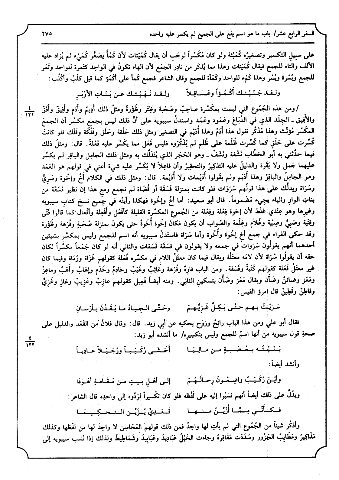على سَبِيل التكسير وتصغيره كُمَيْئة وَلَو كَانَ مكسَّراً لوجَب أَن يُقَال كُمَيْئآت وَهَذَا مِمَّا يذكر من نَادِر الْجمع لِأَن الْهَاء تكون فِي الْوَاحِد كتَمرة للْوَاحِد وتَمْر للْجمع وبُسْرَة وبُسْر وَهَذَا كَمْء للْوَاحِد وكَمْأَة للْجمع وَقَالَ الشَّاعِر فَجمع كَمأ على أَكْمُؤ كَمَا قيل كَلْبٌ وأكْلُب وَلَقَد جَنَيْتك أَكْمُؤا وعَساقِلاً وَلَقَد نَهَيْتك عَن بَناتِ الأَوْبَرِ وَمن هَذِه الجموع الَّتِي لَيست بمكسَّرة صاحبٌ وصُحْبة وظِئرٌ وظُؤْرَةٌ وَمثل ذَلِك أديمٌ وأَدَمٌ وأَفيقٌ وأَفَقٌ، والأفيق: الْجلد الَّذِي فِي الدِّباغ، وعَمود وعَمَد واستدلَّ سِيبَوَيْهٍ على أَن ذَلِك لَيْسَ بِجمع مكسَّر أَن الْجمع المكسَّر مؤنّث وَهَذَا مذكَّر تَقول هَذَا أدمٌ وَهَذَا أَديمٌ فِي التصغير وَمثل ذَلِك حَلْقَة وحَلَق وفَلْكَة وفَلَك فَلَو كَانَت كُسِّرت على حلَقٍ كَمَا كُسِّرت ظُلمة على ظُلَم لم يُذَكِّروه فَلَيْسَ فَعَلَ مِمَّا يُكَسَّر عَلَيْهِ فَعْلَةٌ. قَالَ: وَمثل ذَلِك فِيمَا حدّثني بِهِ أَبُو الخطّاب نَشْفَة، ونَشَفٌ: وَهُوَ الْحجر الَّذِي يُتَدلَّك بِهِ، وَمثل ذَلِك الجامل والباقر لم يكسَّر عَلَيْهِمَا جَمَل وَلَا بقرة وَالدَّلِيل عَلَيْهِ التَّذْكِير والتحقير وَأَن فَاعِلا لَا يُكَسَّر عَلَيْهِ شيءٌ أَعنِي فِي قَوْلهم هُوَ العمَد وَهُوَ الجاملُ والباقِرُ وَهَذَا أُدَيْم وَلم يَقُولُوا أُدَيِّمات وَلَا أُدَيِّمة. قَالَ: وَمثل ذَلِك فِي الْكَلَام أَخٌ وإخوةٌ وسَرِيٌّ وسَراة ويدلّك على هَذَا قَوْلهم سَرَوات فَلَو كَانَت بِمَنْزِلَة فَسَقَة أَو قُضاة لم تجمع وَمَعَ هَذَا إِن نَظِير فسقة من بَنَات الْوَاو وَالْيَاء يَجِيء مضموماً. قَالَ أَبُو سعيد: أما أخٌ وإخوةٌ فَهَكَذَا رَأَيْته فِي جَمِيع نسخ كتاب سِيبَوَيْهٍ وَغَيرهَا وَهُوَ عِنْدِي غلط لِأَن إخْوَة فِعْلَة وفِعْلَة من الجموع المُكسَّرة القليلة كأفعُل وأفعِلَة وأَفعال كَمَا قَالُوا فَتى وفِتْيَة وصَبيٌّ وصِبية وغُلامٌ وغِلْمَة وَالصَّوَاب أَن يكون مَكَان إخْوَة أُخوةٌ حَتَّى يكون بِمَنْزِلَة صُحبة وفُرْهَة وظُؤْرَة، وَقد حكى الْفراء فِي جمع أخٍ إخْوَة وأُخوة، وَأما سَراة فاستدلَّ سِيبَوَيْهٍ أَنه اسْم للْجمع وَلَيْسَ بمكسَّر بشيئين أَحدهمَا انهم يَقُولُونَ سَرَوات فِي جمعه وَلَا يَقُولُونَ فِي فَسَقة فَسَقات وَالثَّانِي أَنه لَو كَانَ جمعا مكَسَّراً لَكَانَ حَقه أَن يَقُولُوا سراة لِأَن لامه معتلَّة وَيُقَال فِيمَا كَانَ معتلّ اللَّام فِي مكسَّره فُعَلَة كَقَوْلِهِم غُزاة ورُماة وَفِيمَا كَانَ غير معتلٍّ فَعَلة كَقَوْلِهِم كَتَبةٌ وفَسَقة. وَمن الْبَاب فارهٌ وفُرهة وغائبٌ وغَيْبٌ وخادمٌ وخَدَم وإهابٌ وأَهَبٌ وماعِزٌ ومَعَزٌ وضائنٌ وضَأَن ويُقال معْز وضَأْن بتسكين الثَّانِي، وَمِنْه أَيْضا فَعيل كَقَوْلِهِم عازِبٌ وعَزيبٌ وغازٍ وغَزِيٌّ وقاطنٌ وقَطينٌ، قَالَ امْرُؤ الْقَيْس: سَرَيْتُ بهم حتَّى يَكِلَّ غَزِيُّهمْ وحتَّى الجِيادُ مَا يُقَدْنَ بأرْسانِ فَقَالَ أَبُو عَليّ: وَمن هَذَا الْبَاب رائِحٌ ورَوَح يحكيه عَن أبي زيد، قَالَ: وَمن قَالَ فلانٌ من القَعَد وَالدَّلِيل على صِحَة قَول سِيبَوَيْهٍ من أَنَّهَا اسمٌ للْجمع وَلَيْسَ بتكسيرِه مَا أنْشدهُ أَبُو زيد: بَنَيْتُه بعُصْبةٍ من مالِيا أَخْشَى رُكَيْباً ورُجَيْلاً عادِيا وَأنْشد أَيْضا: وأيْنَ رُكَيْبٌ واضِعونَ رِحالَهُمْ إِلَى أَهْلِ بَيْتٍ من مَقامةِ أَهْوَدا ويدلُّ على ذَلِك أَيْضا أَنهم نسَبوا إِلَيْهِ على لفظِه فَلَو كَانَ تكْسيراً لَرَدُّه إِلَى واحدِه، قَالَ الشَّاعِر: فكأنِّي ممَّا أُزَيِّنُ مِنْهَا قعَدِيٌّ يُزَيِّن التحكيما وأذكر شَيْئا من الجُموع الَّتِي لم يأتِ لهاواحجٌ فَمن ذَلِك قَوْلهم المَحاسِن لَا وَاحِد لَهَا من لَفظهَا، وَكَذَلِكَ مَذاكير ومَطايِب الجَزور وسَ