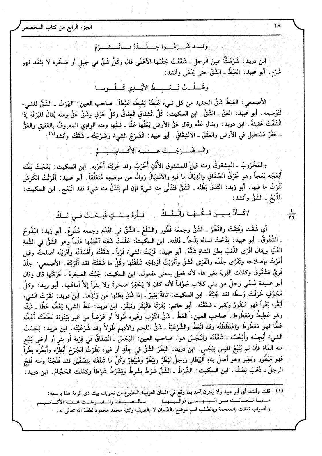 وَقد شرموا جِلدَه فانشَرَم ابْن دُرَيْد: شرَمت عين الرَّجُل: شققت جفنها الْأَعْلَى قَالَ وكل شقّ فِي جبل أَو صَخْرَة لَا ينفذ فَهُوَ شَرْم. أَبُو عُبَيْد: العَبْطُ: الشّقُّ حَتَّى يَدمَى وَأنْشد: وظلَّت تعبِطُ الأَيْدي كُلوما الْأَصْمَعِي: العَبْط: شَقُّ الْجَدِيد من كل شَيْء عَبَطَه يَعْبِطُه عَبْطاً. صَاحب الْعين: الهَرْتُ: الشّقُّ للشَّيْء لتوسيعه. أَبُو عُبَيْد: العَقُّ: الشّقُّ. ابْن السّكيت: كلُّ انْشِقاقٍ انْعِقاقٌ وكل خَرْقٍ وشقٍّ عَقٌّ وَمِنْه يُقَال للبَرْقَة إِذا انْشَقَّتْ عَقيقة. ابْن دُرَيْد: وَيُقَال عقَّه وَقَالَ عقَّ الأَرْض يعُقُّها عَقّاً: شقَّها وَمِنْه الْوَادي الْمَعْرُوف بالعقيق، والعَقُّ: حَفْرٌ مستطيل فِي الأَرْض، والعَقَق: الانشقاق. أَبُو عُبَيْد: انْضَرَجَ الشّيء وضَرَّجتُه: شَقَقْته وَأنْشد: وانْضَرَجَتْ عنهُ الأكاميمُ والمَخْروب: المَشْقوق وَمِنْه قيل للمَشْقوق الأُذُن أَخْرَب وَقد خَرَبْتُه أخْرُبُه. ابْن السّكيت: بعجت بَطْنه أبعجُه بعجاً وَهُوَ خرق الصِّفاق واندِيالُ مَا فِيهِ والانديال زَوَاله من مَوْضِعه متعلِّقاً. أَبُو عُبَيْد: أَفْرَنْتُ الكَرِش: نثرت مَا فِيهَا. أَبُو زيد: انْثَدَق بَطْنه: انْشَقَّ فتَدَلَّى مِنْهُ شيءٌ فقد انْبَعَج. ابْن السّكيت: الذَّبح: الشّقُ وَأنْشد: كانَّ بَين فكِّها والفكِّ فارةَ مِسكٍ ذُبِحت فِي سُكِّ أَي شقَّت وفتقت، والفَطر: الشّق وَجمعه فطور، والسّلْع: الشّق فِي الْقدَم وَجمعه سُلوع. أَبُو زيد: البُذوح: الشُّقوق. أَبُو عُبَيْد: بَذَحْت لِسَانه بَذْحاً: فَلَقْتُه. ابْن السّكيت: عَلَمت شفته أعلِمها عَلْماً وَهُوَ الشّق فِي الشّفة الْعليا وَيُقَال أفْرى الذِّئْب بطن الشّاة: شقَّه. أَبُو عُبَيْد: فَرَيْت الشّيء فَرياً: شققته وأفسدته وأَفْرَيْتُه أصلحته وَقيل أمرت بإصلاحه وتَفَرَّى جلده وانْفَرى انْشَقَّ وأَفْرَيْتُ أوْداجًه: شَقَقْتُها، وكل مَا شققته فقد أفريته. الْأَصْمَعِي: جلد فَرِيّ: مشقوق، وَكَذَلِكَ الْقرْبَة بِغَيْر هَاء لِأَنَّهُ فعيل بِمَعْنى مفعول. ابْن السّكيت: جُبْت الصَّخْرَة: خرقتها. قَالَ: وَقَالَ أَبُو عُبَيْدة سُمي رجل من بني كلاب جَوَّاباً لِأَنَّهُ كَانَ لَا يحْفر صَخْرَة وَلَا بِئْرا إلاّ أماهَهَا. أَبُو زيد: وكل مُجوّف خرقت وَسطه فقد جُبْته. ابْن السّكيت: نَاقَة بَقير: إِذا شُق بَطنهَا عَن وَلَدهَا. ابْن دُرَيْد: بَقَرْت الشّيء أبْقُره بَقراً فَهُوَ مبقور وبَقير: شققته. أَبُو حَاتِم: بَقَرْتُه فانْبَقَر وتَبَقَّر. ابْن دُرَيْد: عَطَّ الشّيء يعُطُّه عَطَّاً: شقَّه وَهُوَ عَطيط ومَعطوط. صَاحب الْعين: العَطّ: شقّ الثّوب وَغَيره طولا أَو عرضا من غير بينونة، عَطَطْتُه أعُطّه عَطاً فَهُوَ مَعْطوط واعْتَطَطْتُه وَقد انْعَطّ والشّرْعَبَة: شقّ اللَّحْم والأديم طولا وَقد شَرْعَبْتُه. ابْن دُرَيْد: بَجَسْت الشّيء أبْجِسه وأَبْجُسه: شققته وانْبَجَس هُوَ. صَاحب الْعين: البَجْس: انْشِقَاق فِي قِربة أَو بِئْر أَو أَرض يَنْبع مِنْهُ المَاء فَإِن لم يَنْبع فَلَيْسَ ببجس. ابْن دُرَيْد: البَطْر: الشّق فِي جلد أَو غَيره بَطَرَت الْجرْح أبطِره وأبطُره بطراً فَهُوَ مَبْطور وبَطير وَهُوَ أصل بِنَاء البَيْطار وَرجل بَيْطَر ومُبَيْطِر وكل مَا شققته بنصفين فقد فَلَجْته وَمِنْه فُلِج الرَّجُل: ذهب نصفه. ابْن السّكيت: الشّرْط: الشّق، شَرَط يشرِط ويشرُط شَرطاً وَكَذَلِكَ الحَجَّام. ابْن دُرَيْد: