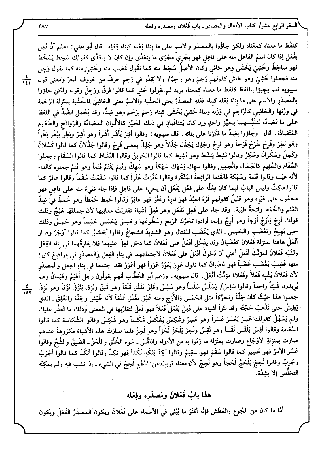 كلفْظ مَا مَعْنَاهُ وَلَكِن جاؤا بِالْمَصْدَرِ والاسمِ على مَا بِناءُ فِعْله كبِناء فِعْلِه. قَالَ أَبُو عَليّ: اعْلَم أنَّ فَعِلَ يَفْعَل إِذا كَانَ اسمُ الْفَاعِل مِنْهُ على فاعِلٍ فَهُوَ يَجْرِي مَجْرَى مَا يتعدَّى وَإِن كَانَ لَا يتعدَّى كَقَوْلِك سَخِطَ يَسْخَط فَهُوَ ساخِطٌ وخَشِيَ يَخْشَى وَهُوَ خاشٍ وَكَانَ الأصلُ سَخِطَ مِنْهُ كَمَا تَقول غَضِبَ مِنْهُ وخَشِيَ مِنْهُ كَمَا تَقول وَجِلَ مِنْهُ فَجعلُوا خَشِيَ وَهُوَ خاشٍ كَقَوْلِهِم رَحِمَ وَهُوَ راحِمٌ وَلَا يُقدَّر فِي رَحِمَ حرفٌ من حُرُوف الجرِّ وَمعنى قَول سِيبَوَيْهٍ فَلم يجيؤا بِاللَّفْظِ كَلَفْظِ مَا مَعْنَاهُ كمعناه يُرِيد لم يَقُولُوا خَشٍ كَمَا قَالُوا فَرِقٌ ووَجِلٌ وَقَوله وَلَكِن جاؤا بِالْمَصْدَرِ وَالِاسْم على مَا بِناءُ فِعْله كبناء فعْلِه المصدرُ يَعْنِي الخشْية والاسمُ يَعْنِي الخاشي فالخَشْية بمنْزلةِ الرَّحْمة فِي وزْنها والخاشي كالرَّاحِم فِي وَزْنِه وبناءُ خَشِيَ يَخْشَى كبناء رَحِمَ يَرْحَم وَهُوَ ضِدُّه وَقد يُحْمَل الضِّدُّ فِي اللفظِ على مَا يُضادُّه لتلبُّسهما بحيِّز واحدٍ وَإِن كَانَا يتنافيان فِي ذَلِك الحيِّز كالألْوان المضادَّة والرَّوائحِ والطُّعومِ المتضادَّة. قَالَ: وجاؤا بضِدِّ مَا ذَكَرْنا على بنائِهِ، قَالَ سِيبَوَيْهٍ: وَقَالُوا أَشِرَ يَأْشَر أَشَرَاً وَهُوَ أَشِرٌ وبَطِرَ يَبْطَر بَطَرَاً وَهُوَ بَطِرٌ وفَرِحَ يَفْرَح فَرَحَاً وَهُوَ فَرِحٌ وجَذِلَ يَجْذَل جَذَلاً وَهُوَ جَذِلٌ بِمَعْنى فَرِحَ وَقَالُوا جَذْلاَنُ كَمَا قَالُوا كَسْلاَن وكَسِلٌ وسَكْرَانُ وسَكِرٌ وَقَالُوا نَشِطَ يَنْشَط وَهُوَ نَشيط كَمَا قَالُوا الحَزين وَقَالُوا النَّشاط كَمَا قَالُوا السَّقام وَجعلُوا السَّقام والسَّقيم كالجَمال والجَميل وَقَالُوا سَهِكَ يَسْهَك سَهَكَاً وَهُوَ سَهِكٌ وقَنِمَ يَقْنَمُ قَنَمَاً وَهُوَ قَنِمٌ جَعَلُوهُ كالداء لِأَنَّهُ عَيْب وَقَالُوا قَنَمَة وسَهَكَة قالقَنَمة الرائحةُ المُنْكَرة وَقَالُوا عَقُرَتْ عُقْراً كَمَا قَالُوا سَقُمَت سُقْماً وَقَالُوا عاقِرٌ كَمَا قَالُوا ماكِثٌ وَلَيْسَ البابُ فِيمَا كَانَ فِعْلُه على فَعُل يَفْعُل أَن يجيءَ على فاعلٍ فَإِذا جَاءَ شيءٌ مِنْهُ على فاعلٍ فَهُوَ مَحْمُول على غَيْرِه وَهُوَ قليلٌ كَقَوْلِهِم فَرُهَ العبْدُ فَهُوَ فارِهٌ وعَقُرَ فَهُوَ عاقِرٌ وَقَالُوا خَمِطَ خَمَطَاً وَهُوَ خَمِطٌ فِي ضِدِّ القَنَم والخَمْط رائحةٌ طيِّبة. وَقد جَاءَ على فَعِلَ يَفْعَل وَهُوَ فَعِلٌ أشياءُ تقاربتْ مَعَانِيهَا لِأَن جملَتَها هَيْجٌ وَذَلِكَ قولُك أَرِجَ يَأْرَجُ أَرَجَاً وَهُوَ أَرِجٌ وَإِنَّمَا أَرَادوا تحرُّك الرِّيح وسُطوعَها وحَمِسَ يَحْمَس حَمَسَاً وَهُوَ حَمِسٌ وَذَلِكَ حِين يَهيجُ ويَغْضَب والحَمِس: الَّذِي يَغْضَب لِلْقِتَالِ وَهُوَ الشَّديد الشجاعُ وَقَالُوا أَحْمَسُ كَمَا قَالُوا أَوْجَرُ وَصَارَ أَفْعَلُ هَا هُنَا بِمَنْزِلَة فَعْلاَن كغَضْبان وَقد يَدْخُل أَفْعَلُ على فَعْلاَن كَمَا دخل فَعِلٌ عَلَيْهِمَا فَلَا يُفارِقهما فِي بناءِ الفِعْل ولشَبَه فَعْلاَن لمؤنَّث أَفْعَلَ أَعنِي أَن دخولَ أَفْعَلَ على فَعْلاَن لاجتماعهما فِي بناءِ الفِعل والمصدرِ فِي مواضِعَ كثيرةٍ مِنْهَا غَضِبَ يَغْضَب غَضَبَاً فَهُوَ غَضْبَان كَمَا تَقول عَوِرَ يَعْوَرُ عَوَرَاً فَهُوَ أَعْوَرُ فقد اجْتمعَا فِي بناءِ الفعلِ والمصدرِ لِأَن فَعْلاَنَ يُشبِه فَعْلاَء وَفْعَلاءُ مؤنَّثُ أَفْعَلَ. قَالَ سِيبَوَيْهٍ: وَزعم أَبُو الخطَّاب أَنهم يَقُولُونَ رجل أَهْيَمُ وهَيْمَانُ وهم يُرِيدُونَ شَيْئا وَاحِدًا، وَقَالُوا سَلِسَ يَسْلَسُ سَلَسَاً وَهُوَ سَلِسٌ وقَلِقَ يَقْلَق قَلَقَاً وَهُوَ قَلِقٌ ونَزِقَ يَنْزَق نَزَقَاً وَهُوَ نَزِقٌ جعلُوا هَذَا حيثُ كَانَ خِف