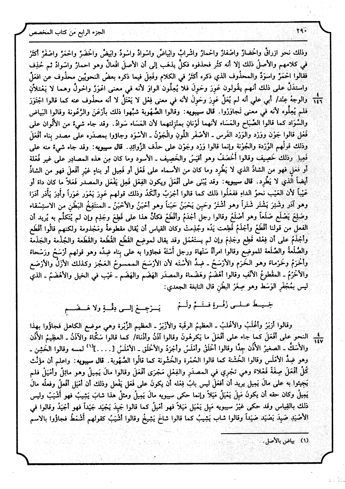 وَذَلِكَ نَحْو ازْرَاقَّ واخْضارَّ واصْفارَّ واحْمارَّ واشْرابَّ وابْياضَّ واسْوادَّ وابْيَضَّ واخْضَرَّ واحْمرَّ واصْفَرَّ أكثرُ فِي كَلَامهم والأصلُ ذَلِك إِلَّا أَنه كثُر فحذفوه فكلٌّ يذهب إِلَى أَن الأصلَ افْعالَّ وَهُوَ احْمارَّ واسْوادَّ ثمَّ حُذِف فَقَالُوا احْمَرَّ واسْوَدَّ والمحذوف الَّذِي ذكره أكثرُ فِي الْكَلَام وفَعِلَ فِيمَا ذكره بعض النَّحْوِيين مَحْذُوف عَن افعَلَّ واستدَلَّ على ذَلِك أَنهم يَقُولُونَ عَوِرَ وحَوِلَ فَلَا يُعِلُّون الواوَ لِأَنَّهُ فِي معنى اعْوَرَّ واحْوَلَّ وهما لَا يَعْتَلاَّنِ والوجهُ عِنْد أبي عَليّ أَنه لم يُعَلَّ عَوِرَ وحَوِلَ لِأَنَّهُ فِي معنى فِعْل لَا يَعْتَلُّ إِلَّا أَنه مَحْذُوف عَنهُ كَمَا قَالُوا اجْتَوَرَ فَلم يُعِلُّوه لِأَنَّهُ فِي معنى تَجاوروا، قَالَ سِيبَوَيْهٍ: وَقَالُوا الصُّهُوبة شبَّهوا ذَلِك بأَرْعَنَ والرُّعونة وَقَالُوا البَياض والسَّواد كَمَا قَالُوا الصَّباح والمَساء لِأَنَّهُمَا لَوْنَانِ بمنزلتهما لِأَن المَساء سَوادٌ، وَقد جَاءَ شيءٌ من الألوان على فعْل قَالُوا جَوْن ووَرْدَ والوَرْد الفَرس: الأصْفَر اللَّون، والجَوْن: الأَسْود وجاؤا بمصدره على مصدرِ بِنَاء أَفْعَلَ وَذَلِكَ قولُهم الوُرْدة والجُوْنة وَإِنَّمَا قَالُوا وَرْد وجَوْن على حذْف الزَّوائِدِ، قَالَ سِيبَوَيْهٍ: وَقد جَاءَ شيءٌ مِنْهُ على فَعيل وَذَلِكَ خَصيف وَقَالُوا أَخْصَفُ وَهُوَ أَقْيَسُ والخَصيف: الْأسود وَمَا كَانَ من هَذِه المصادرِ على غير فُعْلة أَو فَعَلٍ فَهُوَ من الشاذِّ أَيْضا الَّذِي لَا يطَّرِد، قَالَ سِيبَوَيْهٍ: وَقد يُبْنى على أَفْعَلَ وَيكون الفِعل فَعِلَ يَفْعَل والمصدر فعَلاً مَا كَانَ دَاء أَو عَيْبَاً لِأَن العَيْب نحوُ الداءِ فَفَعَلُوا ذَلِك كَمَا قَالُوا أَجْرَبُ وأَنْكَدُ وَذَلِكَ قَوْلهم عَوِرَ يَعْوَر عَوَرَاً وأَدِرَ يَأْدَر أَدَرَاً وَهُوَ آدِر وشَتِرَ يَشْتَر شَتَرَاً وَهُوَ أَشْتَروحَبِنَيَحْبَن حَبَنَاً وَهُوَ أَحْبَنُ والأَحْبَن: المنتفخ البطنِ من الاسْتِسْقَاء وصَلِعَ يَصْلَع صَلَعَاً وَهُوَ أَصْلَعُ وَقَالُوا رجل أَجْذَمُ وأَقْطَعُ فكأنَّ هَذَا على قَطِعَ وجَذِمَ وَإِن لم يُستعمَل وَقد يُقَال لموضِع القَطْع القُطْعة والقَطَعة والجُذْمة والجَذَمة والصُّلْعة والصَّلَعة للموضع وَقَالُوا امرأةٌ سَتْهَاءُ وَرجل أَسْتَهُ فجاؤا بِهِ على بِنَاء ضِدِّه وَهُوَ قَوْلهم أَرْسَحُ ورَسْحَاءُ وأَخْرَمُ وخَرْمَاءُ وَهُوَ الخَرَم والأرْسَحُ: ضِدُّ الأَسْته لِأَن الأرْسَح الْمَمْسُوح العَجُز وَكَذَلِكَ الأَزَلُّ والأَرْصَع والأَخْرَمُ: المقطوعُ الأنفِ وَقَالُوا أَهْضَمُ وهَضْمَاءُ والمصدر الهَضَم: عيْبٌ فِي الْخَيل والأَهْضَمُ: الَّذِي لَيْسَ بمُجْفَرِ الوَسَط وَهُوَ صِغَرُ البطنِ، قَالَ النَّابِغَة الْجَعْدِي: خِيطَ على زَفْرَةٍ فتَمَّ ولَمْ يَرْجِعْ إِلَى دِقَّةٍ وَلَا هَضَمِ وَقَالُوا أَزْبَرُ وأَغْلَبُ، والأَغْلَبُ: الْعَظِيم الرَّقَبَة، والأَزْبَر: الْعَظِيم الزُّبْرة وَهِي مَوضِع الْكَاهِل فجاؤا بِهَذَا النَّحْو على أَفْعَلَ كَمَا جَاءَ على أَفْعَلَ مَا يكْرهُونَ وَقَالُوا آذَنُ وأذْناءُ كَمَا قَالُوا سَكَّاء، والآذَن: العظيمُ الأُذُن، والأَسَكُّ: الصَّغِير الأُذُن جِدَّاً، وَقَالُوا أَخْلَقُ وأَمْلَسُ وأَجْرَدُ والأَخْلق: الأمْلَس ... . لمسه وَقَالُوا الخَشِن: وَهُوَ ضدُّ الأمْلَس وَقَالُوا الخُشْنة كَمَا قَالُوا الحُمْرة والخُشونة كَمَا قَالُوا الصُّهوبة، قَالَ سِيبَوَيْهٍ: وَاعْلَم أَن مؤنَّثَ كلِّ أَفْعَلَ صِفَةً فَعْلاَءُ وَهِي تجْرِي فِي الْمصدر والفِعلِ مَجْرَى أَفْعَلَ وَقَالُوا مالَ يميلُ وَهُوَ مائِلٌ وأَمْيَلٌ فَلم يجيئوا بِهِ على مالَ يَميل يُرِيد أَن أَفْعَلَ لَيْسَ بابُ فِعله أَن يكونَ على فَعَلَ