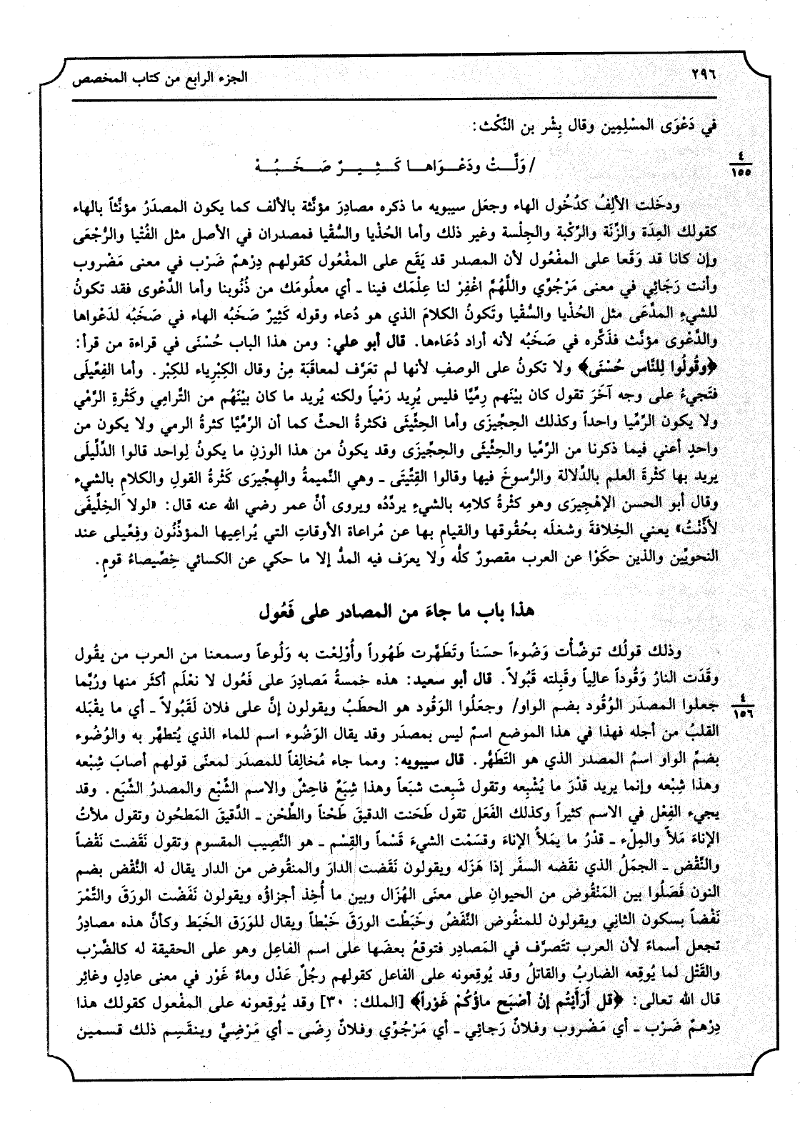 فِي دَعْوَى الْمُسلمين وَقَالَ بِشر بن النِّكْث: وَلَّتْ ودعْواها كَثيرٌ صَخَبُه دخلت الألفُ كدخول الْهَاء وَجعل سِيبَوَيْهٍ مَا ذكره مصَادر مؤنَّثة بِالْألف كَمَا يكون المصدرُ مؤنثاً بِالْهَاءِ كَقَوْلِك العِدَة والزِّنَة والرِّكْبة والجِلْسَة وَغير ذَلِك وَأما الحُذْيا والسُّقْيا فمصدران فِي الأَصْل مثل الفُتْيا والرُّجْعى وَإِن كَانَا قد وَقَعَا على الْمَفْعُول لِأَن الْمصدر قد يَقع على الْمَفْعُول كَقَوْلِهِم دِرْهمٌ ضَرْب فِي معنى مَضْروب وَأَنت رجائي فِي معنى مَرْجُوِّي واللهمَّ اغْفِر لنا عِلْمَكَ فِينَا: أَي معلومَك من ذنوبنا وَأما الدَّعْوى فقد تكون للشَّيْء المدَّعى مثل الحُذْيا والسُّقْيا وَتَكون الكلامَ الَّذِي هُوَ دُعاء وَقَوله كثير صَخَبُه لدَعْواها والدَّعوى مؤنَّث فذكَّره فِي صخبُه لِأَنَّهُ أَرَادَ دُعاءها، قَالَ أَبُو عَليّ: وَمن هَذَا الْبَاب حُسْنى فِي قِرَاءَة من قَرَأَ وَقُولُوا للنَّاس حُسْنى وَلَا تكونُ على الوصفِ لِأَنَّهَا لم تعرَّف لمعاقَبَة مِنْ وَقَالَ الكِبْرِياء للكِبَر، وَأما الفِعِّيلَى فتجيءُ على وَجه آخر تَقول كَانَ بَيْنَهم رِمِّيَّاً فَلَيْسَ يُريد رَمْياً وَلكنه يُرِيد مَا كَانَ بَيْنَهم من التَّرامي وكثْرَة الرَّمْي وَلَا يكون الرِّمِّيا وَاحِدًا وَكَذَلِكَ الحِجِّيزى: وَأما الحِثِيثى فكثرةُ الحثِّ كَمَا أَن الرِّمِّيا كثرةُ الرَّمْي وَلَا يكون من واحدٍ أَعنِي فِيمَا ذكرنَا من الرِّمِّيَّا والحِثِّيثى والحِجِّيزى وَقد يكونُ من هَذَا الْوَزْن مَا يكونُ لواحدٍ قَالُوا الدِّلِّيلى يُرِيد بهَا كثرةَ الْعلم بالدِّلالة والرُّسوخ فِيهَا وَقَالَ الفِتِّيتى: وَهِي النَميمةُ والهِجِّيرى كثرةُ القولِ والكلامِ بالشَّيْء وَقَالَ أَبُو الْحسن الإهْجيرى وَهُوَ كثرةُ كلامِه بالشَّيْء يردِّدُه ويروى أنَّ عمر رَضِي الله عَنهُ قَالَ: (لَوْلَا الخِلِّيفى لأذَّنْت) . يَعْنِي الخلافةَ وشغلَه بحقوقِها وَالْقِيَام بهَا عَن مُرَاعَاة الأوقاتِ الَّتِي يُراعيها المؤذِّنون وفِعِّيلى عِنْد النَّحْوِيين وَالَّذين حَكَوْا عَن الْعَرَب مقصورٌ كلُّه وَلَا يعرَف فِيهِ المدُّ إِلَّا مَا حُكيَ عَن الْكسَائي خِصِّيصاء قومٍ.