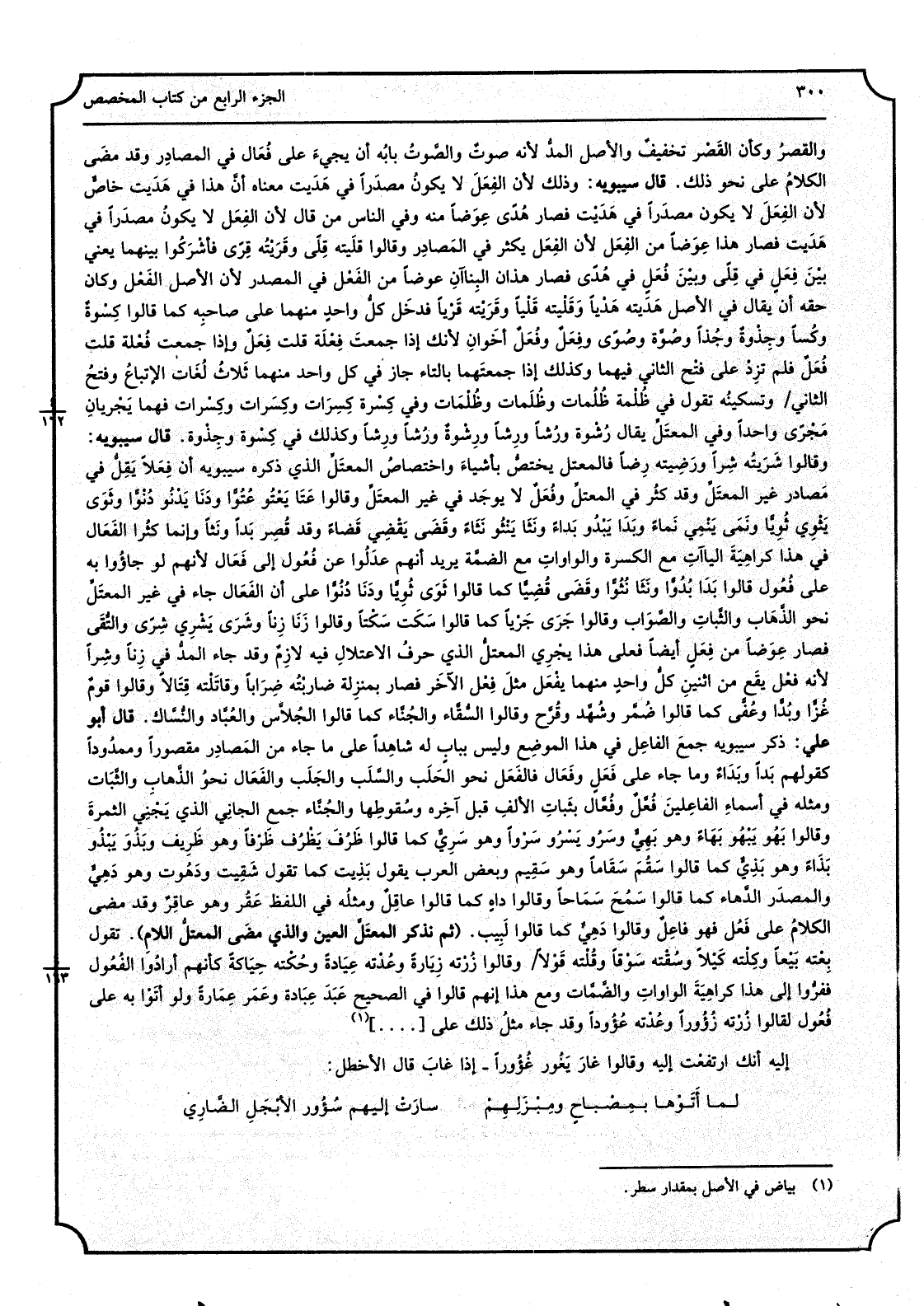 والقصرُ وَكَأن القَصْر تخفيفٌ وَالْأَصْل المدُّ لِأَنَّهُ صوتٌ والصَّوتُ بَابه أَن يجيءَ على فُعال فِي المصادر وَقد مضى الكلامُ على نَحْو ذَلِك، قَالَ سِيبَوَيْهٍ: وَذَلِكَ لِأَن الفعلَ لَا يكونُ مصدرا فِي هَدَيْت فَصَارَ هَذَا عِوَضاً مِنْهُ وَفِي النَّاس من قَالَ لِأَن الْفِعْل لَا يكونُ مصدرا فِي هَدَيْت فَصَارَ هَذَا عِوَضاً من الْفِعْل لِأَن الْفِعْل يكثر فِي المصادر وَقَالُوا قَلَيته قِلىً وقَرَيْته قِرىً فأشْركوا بَينهمَا يَعْنِي بَيْنَ فِعَلٍ فِي قِلىً وبينَ فُعَلٍ فِي هُدىً فَصَارَ هَذَا البِناآن عوضا من الْفِعْل فِي الْمصدر لِأَن الأَصْل الفَعْل وَكَانَ حَقه أَن يُقَال فِي الأَصْل هَدَيْته هَدْيَاً وقَلَيْته قَلْيَاً وقَرَيْته قَرْيَاً فَدخل كلُّ واحدٍ مِنْهُمَا على صَاحبه كَمَا قَالُوا كِسْوةٌ وكُساً وجِذْوةٌ وجُذاً وصُوَّة وصُوىً وفَعِلٌ وفُعَلٌ أَخَوان لِأَنَّك إِذا جمعتَ فِعْلةً قلت فَعِلٌ وَإِذا جمعت فُعْلة قلت فُعَلٌ فَلم تَزِدْ على فتْح الثَّانِي فيهمَا وَكَذَلِكَ إِذا جمعتها بِالتَّاءِ جَازَ فِي كل وَاحِد مِنْهُمَا ثلاثُ لُغَات الِاتِّبَاع وَفتح الثَّانِي وتسكينُه تَقول فِي ظُلْمة ظُلُمات وظُلَمات وظُلْمات وَفِي كِسْرة كِسِرات وكِسَرات وكِسْرات فهما يجريان مَجْرَىً وَاحِدًا وَفِي المعتلِّ يُقَال رُشْوة ورُشاً ورِشاً ورِشْوةٌ ورُشاً ورِشاً وَكَذَلِكَ فِي كِسْوة وجِذْوة، قَالَ سِيبَوَيْهٍ: وَقَالُوا شَرَيْته شِراً ورَضيته رِضاً فالمعتل يختصُّ بأشياءَ واختصاصُ المعتلِّ وفُعَلٌ لَا يُوجد فِي غير المعتلِّ وَقَالُوا عَتا يَعْتُو عُتُوَّاً ودَنا يَدْنو دُنُوَّاً وثَوى يَثْوي ثُوِيَّاً ونَمى يَنْمى نَماءً وبَدا يبْدو بَداءً ونَثا يَنْثو نَثاءً وقَضى يَقْضي قَضاءً وَقد قُصِر بَداً ونَثا وَإِنَّمَا كثُرا الفَعال فِي هَذَا كَراهيةَ الياآت مَعَ الكسرة والواوات مَعَ الضمَّة يُرِيد أَنهم عدَلوا عَن فُعول إِلَى فَعال لأَنهم لَو جاؤا بِهِ على فُعول قَالُوا بَدا بُدُوَّاً ونَثا نُثُوَّاً وقَضى قُضِيَّاً كَمَا قَالُوا ثَوى ثُوِيَّاً ودَنا دُنُوَّاً على أَن الفَعال جَاءَ فِي غير المعتلِّ نَحْو الذَّهاب والثَّبات والصَّواب وَقَالُوا جَرى جَرْيَاً كَمَا قَالُوا سَكَتَ سَكْتَاً وَقَالُوا زَنا زِناً وشَرى يَشْري شِرىً والتُّقى فَصَارَ عِوَضاً من فِعَلٍ أَيْضا فعلى هَذَا يَجْري المعتلُّ الَّذِي حرفُ الاعتلالِ فِيهِ لازمٌ وَقد جَاءَ المدُّ فِي زِناً وشِراً لِأَنَّهُ فِعل يَقع من اثْنَيْنِ كلُّ واحدٍ مِنْهُمَا يفْعَل مثلَ فِعْل الآخر فَصَارَ بِمَنْزِلَة ضاربْتُه ضِراباً وقاتَلْته قِتالاً وَقَالُوا قومٌ غُزَّاً وبُدَّاً وعُفَّىً كَمَا قَالُوا ضُمَّر وشُهَّد وقُرَّح وَقَالُوا السُّقَّاء والجُنَّاء كَمَا قَالُوا الجُلاَّس والعُبَّاد والنُّسَّاك، قَالَ أَبُو عَليّ: ذكر سِيبَوَيْهٍ جمعَ الْفَاعِل فِي هَذَا الْموضع وَلَيْسَ ببابٍ لَهُ شَاهدا على مَا جَاءَ من المصادر مَقْصُورا وممدوداً كَقَوْلِهِم بَداً وبَداءٌ وَمَا جَاءَ على فَعَلٍ وفَعال فالفَعَل نَحْو الحَلَب والسَّلَب والجَلَب والفَعال نَحْو الذَّهاب والثَّبات وَمثله فِي أَسمَاء الفاعلين فُعَّلٌ وفُعَّال بثبات الألفِ قبل آخِره وسُقوطِها والجُنَّاء جمع الْجَانِي الَّذِي يَجْني الثمَرة وَقَالُوا بَهُو يَبْهو بَهاءً وَهُوَ بَهِيٌّ وسَرو يَسْرو سَرْوَاً وَهُوَ سَرِيٌّ كَمَا قَالُوا ظَرُفَ يَظْرُف ظَرْفَاً وَهُوَ ظَريف وبَذو يَبْذُو بَذاءً وَهُوَ بَذِيٌّ كَمَا قَالُوا سَقُمَ سَقاماً وَهُوَ سَقيم وَبَعض الْعَرَب يَقُول بَذِيت كَمَا تَقول شَقِيت ودَهُوت وَهُوَ دَهِيٌّ والمصدر الدَّهاء كَمَا قَالُوا سَمُحَ سَماحاً وَقَالُوا اداهٍ كَمَا قَالُوا عاقلٌ ومثلهُ فِي اللَّفْظ عَقُر وَهُوَ عاقِرٌ وَقد مضى الكلامُ على فَعُل فَهُوَ فاعلٌ وَقَالُوا 