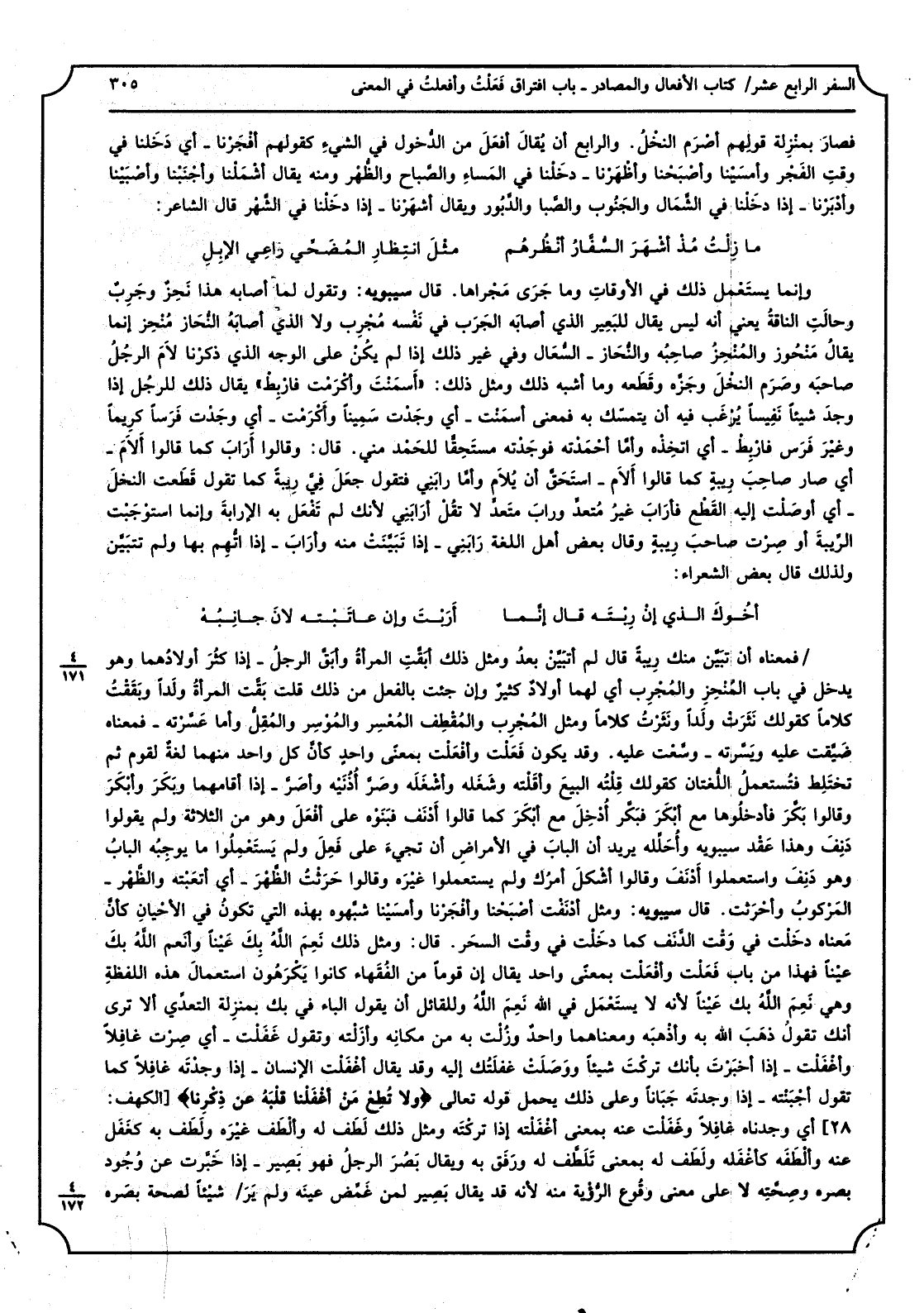 فَصَارَ بِمَنْزِلَة قولِهم أَصْرَم النخلُ، وَالرَّابِع أَن يُقَال أَفْعَلَ من الدُّخُول فِي الشيءِ كَقَوْلِهِم أَفْجَرْنا: أَي دَخَلْنا فِي وقتِ الْفجْر وأَمْسَيْنا وأَصْبَحْنا وأَظْهَرْنا: دَخَلْنا فِي الْمسَاء والصَّباح والظُّهر وَمِنْه يُقَال أَشْمَلنا وأَجْنَبنا وأَصْبَينا وأَدْبَرنا: إِذا دَخَلنَا فِي الشمَال والجَنوب والصَّبا والدَّبور وَيُقَال أَشْهَرنا: إِذا دَخَلْنا فِي الشَّهر، قَالَ الشَّاعِر: مَا زِلتُ مُذْ أَشْهَرَ السُّفَّارُ أَنْظُرُهُم مثلَ انْتِظَار المُضَحِّي راعيَ الإبلِ وَإِنَّمَا يُستعمل ذَلِك فِي الْأَوْقَات وَمَا جرى مَجراها، قَالَ سِيبَوَيْهٍ: وَتقول لما أَصَابَهُ هَذَا نَحِزٌ وجَرِبٌ وحالَتِ الناقةُ يَعْنِي أَنه لَيْسَ للبعير الَّذِي أَصَابَهُ الجَرَب فِي نفْسِه مُجْرِب وَلَا الَّذِي أَصَابَهُ النُّحاز مُنْحِز إِنَّمَا يُقَال مَنْحُوز والمُنْحِز صاحبُه والنُّحاز: السُّعال وَفِي غير ذَلِك إِذا لم يكن على الْوَجْه الَّذِي ذكرنَا لامَ الرجلُ صاحبَه وصَرَمَ النخلَ وجزَّه وقَطَعَه وَمَا أشبه ذَلِك وَمثل ذَلِك: أَسْمَنتَ وأَكْرَمتَ فاربِط. يُقَال ذَلِك للرجل إِذا وجد شَيْئا نَفيساً يُرغبُ فِيهِ أَن يتمسّك بِهِ فَمَعْنَى أَسْمَنت: أَي وَجَدْت سَميناً وأَكْرَمت: أَي وجدت فَرَساً كَرِيمًا وغيرَ فَرَس فاربِط: أَي اتخِذه وَأما أَحْمَدته فوجَدْته مستحقَّاً للحَمْد مني، قَالَ: وَقَالُوا أَرابَ كَمَا قَالُوا أَلامَ: أَي صَار صاحبَ رِيبةٍ كَمَا قَالُوا أَلامَ: استحقَّ أَن يُلام وأمَّا رابَني فَتَقول جَعَلَ فِيَّ رِيبةً كَمَا تَقول قَطعت النخلَ: أَي أَوْصَلت إِلَيْهِ القَطْع فأَرابَ غيرُ متعدٍّ ورابَ متَعدٍّ، لَا تقُل أَرابني لِأَنَّك لم تفعل بِهِ الإرابة وَإِنَّمَا اسْتَوْجَبت الرِّيبة أَو صِرت صاحبَ ريبةٍ، وَقَالَ بعض أهل اللُّغَة: رابَني: إِذا تَبَيَّنَتْ مِنْهُ وأَرابَ: إِذا اتُّهِمَ بهَا وَلم تتبَيَّن وَلذَلِك قَالَ بعض الشُّعَرَاء: أخوكَ الَّذِي إنْ رِبْته قَالَ إنَّما أَرَبْتَ وَإِن عاتَبْتَه لانَ جانِبُه فَمَعْنَاه إِن تبيَّن مِنْك رِيبَة قَالَ لم أتبَيَّنْ بعدُ وَمثل ذَلِك أبَقَّتِ المرأةُ وأبَقَّ الرجلُ: إِذا كَثُر أولادُهما وَهُوَ يدْخل فِي بَاب المُنْحِز والمُجْرِب أَي لَهما أولادٌ كثير وَإِن جِئْت بِالْفِعْلِ من ذَلِك قلت بَقَّت المرأةُ وَلَدَاً وبَقَقْتُ كلَاما كَقَوْلِك نَثَرْت ولَداً ونَثَرْت كلَاما وَمثل المُجْرِب والمُقْطِف المُعْسِر والموسِر والمُقِلُّ وَأما عَسَّرته: فَمَعْنَاه ضَيَّقت عَلَيْهِ، ويسَّرْته: وسَّعت عَلَيْهِ. وَقد يكون فَعَلْت وأَفْعَلت بِمَعْنى واحدٍ كأنَّ كل وَاحِد مِنْهُمَا لغةٌ لقوم ثمَّ تختلط فتُستعمَل اللُّغتان كَقَوْلِك قِلْتُه البيعَ وأَقَلْته وشَغَلَه وأَشْغَله وصَرَّ أُذُنَيْه وأَصَرَّ: إِذا أقامهما وبَكَرَ وأَبْكَر وَقَالُوا بَكَّر فأدخلوها مَعَ أَبْكَرَ فبَكَّر أُدخِل مَعَ أَبْكَرَ كَمَا قَالُوا أَدْنَف فَبَنَوه على أَفْعَلَ وَهُوَ من الثَّلَاثَة وَلم يَقُولُوا دَنِفَ وَهَذَا عَقْد سِيبَوَيْهٍ وأُحَلِّله يُرِيد أَن البابَ فِي الأمراضِ أَن تجيءَ على فَعِلَ وَلم يستعملوا مَا يوجبهُ البابُ وَهُوَ دَنِفَ واستعملوا أَدْنَفَ وَقَالُوا أَشْكَلَ أمرُك وَلم يستعملوا غَيْرَه وَقَالُوا حَرَثْتُ الظَّهْرَ: أَي أَتْعَبته، والظَّهر: المَرْكوب، وأَحْرَثت. قَالَ سِيبَوَيْهٍ: وَمثل أَدْنَفت أَصْبَحْنا وأَفْجَرْنا وأَمْسَيْنا شبَّهوه بِهَذِهِ الَّتِي تكونُ فِي الأحيان كأنَّ مَعْنَاهُ دَخَلْت فِي وَقْتِ الدَّنَف كَمَا دَخَلْت فِي وقتِ السحَر. قَالَ: وَمثل ذَلِك نَعِمَ اللهُ بكَ عَيْنَاً وأَنْعَم اللهُ بكَ عَيْنَاً فَهَذَا من بَاب فَعَلْت وأَفْعَلت بِمَعْنى وَاحِد يُقَال إِن قوما من الفُقهاء كَانُوا يَكْرَهون استعمالَ هَذِه اللفظةِ وَهِي ن
