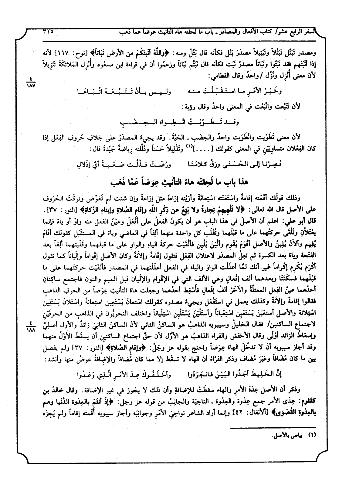 وَذَلِكَ قَوْلك أَقَمْته إِقَامَة واسْتَعَنْته اسْتِعانةً وأَرَيْته إراءةً مثل إراعةً وَإِن شِئْت لم تُعَوِّض وتركْتَ الْحُرُوف على الأَصْل قَالَ الله تَعَالَى: (لَا تُلْهيهم تِجارةٌ وَلَا بَيْعٌ عَن ذِكْرِ اللهِ وإقام الصلاةِ وإيتاءِ الزَّكاة) . قَالَ أَبُو عَليّ: اعْلَم أَن الأصلَ فِي هَذَا البابِ هُوَ أَن يكون الفعلُ على أَفْعَلَ وعينُ الْفِعْل مِنْهُ واوٌ أَو ياءٌ فَإِنَّمَا يعْتَلاّنِ وتُلقى حركتُهما على مَا قبلَهما وتُقلبُ كل وَاحِدَة مِنْهُمَا ألفا فِي الْمَاضِي وياءً فِي المستقبَل كَقَوْلِك أقامَ يُقيم وألانَ يُلين وَالْأَصْل أَقْوَم يُقْوِم وأَلْيَن يُليِن فألْقَيْت حركةَ الياءِ والواوِ على مَا قبلهمَا وقَلَبْتهما ألفا بعد الفتحة وياءً بعد الكسرة ثمَّ تعِلُّ المصدرَ لاعتلال الفِعل فَتَقول إِقَامَة وإلانةً وَكَانَ الأَصْل إقْواماً وإلْياناً كَمَا تَقول أَكْرَم يُكْرِم إكْراماً غير أَنَّك لمّا أَعْلَلْت الواوَ والياءَ فِي الْفِعْل أَعْلَلتهما فِي الْمصدر فألقَيْت حركتَهما على مَا فبلَهما فسكَنَتا وبعدهما ألف إفْعالٍ وَهِي الْألف الَّتِي فِي الإقْوام والإلْيان قبل الْمِيم وَالنُّون فَاجْتمع ساكنان أحدُهما عينُ الْفِعْل المعتلَّةُ والآخرُ ألفُ إفْعالٍ فأُسقِط أحدُهما وجُعِلت هاءُ التأنيثِ عِوَضاً من الحرفِ الذاهبِ فَقَالُوا إِقَامَة وإلانَةً وَكَذَلِكَ يعْمل فِي اسْتَفْعَل ويجيءُ مصدره كَقَوْلِك اسْتَعان يَسْتَعين اسْتِعْياناً واسْتَلْيَن يَسْتَلين اسْتِلْياناً وَاخْتلف النحويون فِي الذاهبِ من الحرفَيْنِ لِاجْتِمَاع الساكنين فَقَالَ الْخَلِيل وسيبويه الذاهبُ هُوَ الساكنُ الثَّانِي لأنَّ الساكنَ الثَّانِي زائدٌ وَالْأول أصليٌّ وَإِسْقَاط الزائدِ أَوْلَى وَقَالَ الْأَخْفَش وَالْفراء الذاهبُ هُوَ الأوَّل لِأَن حقَّ اجْتِمَاع الساكنين أَن يسْقط الأولُ مِنْهُمَا وَقد أجَاز سِيبَوَيْهٍ أنْ لَا تدخلَ الهاءُ عِوَضاً وَاحْتج بقوله عز وَجل: (وإقامِ الصَّلاةِ) . وَلم يفصل بَين مَا كَانَ مُضافاً وغيرَ مُضَاف وَذكر الفرَّاء أَن الْهَاء لَا تسْقط إِلَّا مِمَّا كَانَ مُضَافا والإضافةُ عوضٌ مِنْهَا، وَأنْشد: إنَّ الخليطَ أجَدُّوا البَيْنَ فانْجَرَدوا وأَخْلَفوكَ عِدَ الأمرِ الَّذِي وَعَدوا وَذكر أَن الأَصْل عِدَةَ الأمرِ وَالْهَاء سَقَطَت للإضافةِ وَأَن ذَلِك لَا يجوز فِي غير الْإِضَافَة. وَقَالَ خالدُ بن كُلْثُوم: عِدَى الْأَمر جمع عِدْوة والعِدْوَة: النَّاحِيَة والجانب من قَوْله عز وَجل: (إذْ أنتُم بالعِدْوَةِ الدُّنْيا وهم بالعِدْوَةِ القُصْوى) . وَإِنَّمَا أَرَادَ الشَّاعِر نواحيَ الأمرِ وجوانبَه وَأَجَازَ سِيبَوَيْهٍ أَقْمَته إقاماً وَلم يُجِزه
