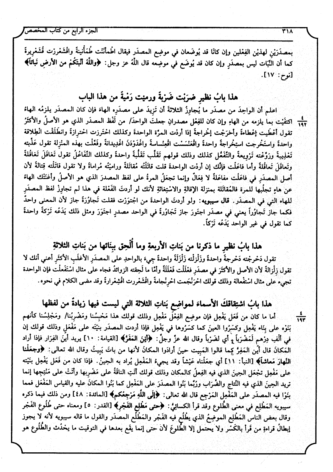 أما مَا كَانَ من فَعَلَ يَفْعِل فَإِن مَوضِع الفِعل مَفْعِل وَذَلِكَ قَوْلك هَذَا مَحْبِسنا ومَضْرِبنا ومَجْلِسُنا كَأَنَّهُمْ بنوه على بناءِ يَفْعِل وكَسروا العينَ كَمَا كسروها فِي يَفْعِل فَإِذا أردْت المَصْدَر بنيته على مَفْعَلٍ وَذَلِكَ قَوْلك إِن فِي ألفِ دِرْهمٍ لَمَضْرَبا: أَي لَضَرْبا، وَقَالَ الله عز وَجل: (أَيْنَ المَفَرّ) . يُرِيد أَيْن الفِرار فَإِذا أَرَادَ الْمَكَان قَالَ أَيْن المَفِرُّ كَمَا قَالُوا المَبيت حِين أَرَادوا المكانَ لِأَنَّهَا من باتَ يَبيتُ وَقَالَ الله تَعَالَى: (وجعَلْنا النَّهارَ مَعاشاً) . أَي جَعَلْنَاهُ عَيْشَاً وَقد يجيءُ المَفْعِل يُراد بِهِ الحِيْن. فَإِذا كَانَ من فَعَلَ يَفْعِل بَنَيْته على مَفْعِل تَجْعَل الحِينَ الَّذِي فِيهِ الفعلُ كالمكان وَذَلِكَ قَوْلك أتَتِ الناقةُ على مَضْرِبِها وأتتْ على مَنْتِجِها إِنَّمَا تُرِيدُ الحينَ الَّذِي فِيهِ النِّتاج والضِّراب وَرُبمَا بَنَوْا المَصْدَر على المفعِل كَمَا بنوا المكانَ عَلَيْهِ وَالْقِيَاس المَفْعَل فَمَا بَنَوْا فِيهِ المَصْدَر على المَفْعِل المَرْجِع، قَالَ الله تَعَالَى: (إِلَى اللهِ مَرْجِعُكم) . وَمن ذَلِك فِيمَا ذكره سِيبَوَيْهٍ المَطْلِع فِي معنى الطُّلوع وَقد قَرَأَ الْكسَائي: (حَتَّى مَطْلِعِ الفجرِ) . وَمَعْنَاهُ حَتَّى ضلوع الْفجْر، وَقَالَ بعض النَّاس المَطْلِع الموضِع الَّذِي يَطْلُع فِيهِ الْفجْر والمَطْلَع المَصْدَر وَالْقَوْل مَا قَالَه سِيبَوَيْهٍ لِأَنَّهُ لَا يجوز إبطالُ قراءةِ من قَرَأَ بالكَسْر وَلَا يحْتَمل إِلَّا الطُّلوع لِأَن حَتَّى إِنَّمَا يَقع بعْدهَا فِي التَّوْقِيت مَا يَحْدُث والطُّلوع هُوَ الَّذِي
