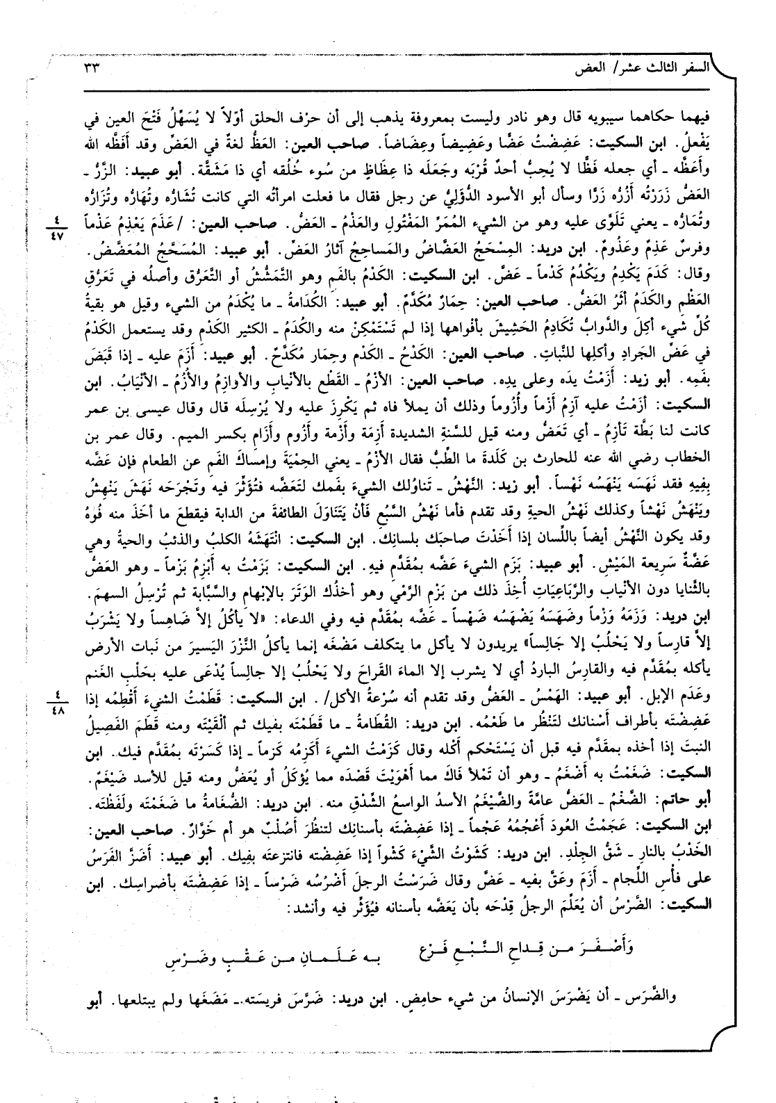 فيهمَا حَكَاهُمَا سِيبَوَيْهٍ قَالَ وَهُوَ نَادِر وَلَيْسَت بمعروفة يذهب إِلَى أَن حرف الْحلق أوّلا لَا يُسَهِّل فتحَ الْعين فِي يفعل. ابْن السّكيت: عضَضْت عضّاً وعَضيضاً وعِضاضاً. صَاحب الْعين: العَظُّ لُغَة فِي العضِّ وَقد أَفَظَّه الله وأَعَظَّه: أَي جعله فَظّاً لَا يحب أحدٌ قُرْبه وَجعله ذَا عِظاظ من سوء خلُقه أَي ذَا مشقَّة. أَبُو عُبَيْد: الزّرُّ: العَضُّ زَرَرْتُه أزُرُّه زَرّاً، وَسَأَلَ أَبُو الأَسود الدّؤلي عَن رجل فَقَالَ مَا فعلت امْرَأَته التّي كَانَت تُشارُّه وتُهارُّه وتُزارُّه وتمارُّه: يَعْنِي تلوّى عَلَيْهِ وَهُوَ من الشّيء الممرّ المفتول. والعَذْم: العضُّ. صَاحب الْعين: عَذَم يَعْذِم عَذْماً وَفرس عَذِمٌ وعَذوم. ابْن دُرَيْد: المِسْحَجُ: العضّاض والمساحج آثَار العضّ. أَبُو عُبَيْد: المُسَحَّج: المُعضَّض. وَقَالَ: كَدَمَ يكدِم ويكدُم كَدْماً: عضَّ. ابْن السّكيت: الكَدْم بالفم وَهُوَ التّمشُّش أَو التّعرُّق وَأَصله فِي تعرُّق الْعظم، والكَدَم: أثر العضّ. صَاحب الْعين: حمارٌ مُكَدَّمٌ. أَبُو عُبَيْد: الكُدامة: مَا يُكدم من الشّيء وَقيل هُوَ بَقِيَّة كل شَيْء أُكِل، والدّواب تكادِم الْحَشِيش بأفواهها إِذا لم تستمكن مِنْهُ، والكُدَمُ: الْكثير الكَدْم وَقد يسْتَعْمل الكدم فِي عض الْجَرَاد وأكلها للنبات. صَاحب الْعين: الكَدْح: الكدم وحمارٌ مُكَدّح. أَبُو عُبَيْد: أزَمَ عَلَيْهِ: إِذا قبض بفمه. أَبُو زيد: أزَمْتُ يَده وعَلى يَده. صَاحب الْعين: الأَزْم: الْقطع بالأنياب، والأوازم والأُزُم: الأَنياب. ابْن السّكيت: أَزَمْت عَلَيْهِ آزِم أَزْماً وأُزوماً وَذَلِكَ أَن يمْلَأ فَاه ثمَّ يَكْرِزَ عَلَيْهِ وَلَا يرسلَه قَالَ وَقَالَ عِيسَى بن عمر كَانَت لنا بطة تأزم: أَي تعَضُّ وَمِنْه قيل للسّنة الجديدة أزِمَة وأزْمة وأزوم وأزامِ بِكَسْر الْمِيم. وَقَالَ عمر بن الْخطاب رَضِي الله عَنهُ للحرث بن كلدة: مَا الطّبُّ ? فَقَالَ: الأَزْم: يَعْنِي الحمية وإمساك الْفَم عَن الطّعام فَإِن عضّه بِفِيهِ فقد نَهَسَه يَنْهَسُه نَهْساً. أَبُو زيد: النّهْش: تناولك الشّيء بفمك لتعَضَّه فتؤثر فِيهِ وتجرحه نهَش ينهِش وينهَش نهْشاً وَكَذَلِكَ نهْش الحيَّة وَقد تقدم، فَأَما نهش السّبع فَأن يتَنَاوَل الطّائفة من الدّابة فَيقطع مَا اخذ مِنْهُ فوهُ، وَقد يكون النّهش أَيْضا بِاللِّسَانِ إِذا أخذت صَاحبك بلسانك. ابْن السّكيت: انتهشه الْكَلْب وَالذِّئْب والحيَّة وَهِي عضَّة سريعة المَيْش. أَبُو عُبَيْد: بزَم الشّيء: عضَّه بِمقدم فِيهِ. ابْن السّكيت: بزَمْت بِهِ أبزِم بَزماً: وَهُوَ العضُّ بالثّنايا دون الأَنياب والرَّباعيّات أُخذ ذَلِك من بَزْم الرّمي وَهُوَ أخذك الوترَ بالإبهام والسّبّابة ثمَّ ترسل السّهم. ابْن دُرَيْد: وزَمَه وَزْماً وضَهَسَه يضهسُه ضَهساً: عضَّه بِمقدم فِيهِ، وَفِي الدّعاء: (لَا يَأْكُل إلاّ ضاهِساً وَلَا يشرب إلاّ قارساً وَلَا يحلُب إلاّ جَالِسا) يُرِيدُونَ لَا يَأْكُل مَا يتَكَلَّف مضغه إِنَّمَا يَأْكُل النّزر الْيَسِير من نَبَات الأَرْض يَأْكُلهُ بِمقدم فِيهِ والقارس الْبَارِد أَي لَا يشرب إلاّ المَاء القَراح وَلَا يحلب إلاّ جالسّاً يُدعى عَلَيْهِ بحلْب الْغنم وَعدم الإِبل. أَبُو عُبَيْد: الهَمْس: العَضُّ وَقد تقدم أَنه سرعَة الأَكل. ابْن السّكيت: قطَمت الشّيء أقطِمُه إِذا عضِضْته بأطراف أسنانك لتنظر مَا طعمه. ابْن دُرَيْد: القُطامة: مَا قطمته بفيك ثمَّ أَلقيته وَمِنْه قطم الفصيل النّبت إِذا أَخذه بمقدّم فِيهِ قبل أَن يستحكم أكله، وَقَالَ كَزَمْت الشّيء أكزِمُه كَزْماً: إِذا كَسرته بِمقدم فِيك. ابْن السّكيت: ضغَمت بِهِ أضغَم: وَهُوَ أَن تملأ فَاك مِمَّا أهويت قَصده مِمَّا يُؤْكَل أَو يُعَضُّ وَمِنْه قيل للأسد ضَيْغَمٌ. أَبُو حَاتِم: الضّغْم: العضُّ عامَّة، والضّيغم الأَسد الْوَاسِع الشّدق مِنْهُ. ابْن دُرَيْد: الضّغامة مَا ض