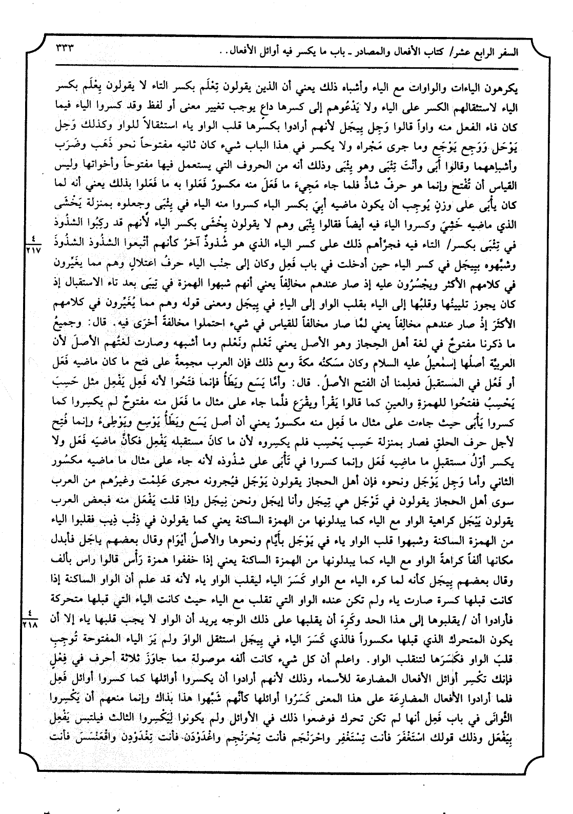 يكْرهُونَ الياآت والواوات مَعَ الْيَاء وَأَشْبَاه ذَلِك يَعْنِي أَن الَّذين يَقُولُونَ تِعْلَم بِكَسْر التَّاء لَا يَقُولُونَ يِعلَم بِكَسْر الْيَاء لاستثقالهم الْكسر على الْيَاء وَلَا يَدعُوهُم إِلَى كسرهَا داعٍ يُوجب تَغْيِير معنى أَو لفظ وَقد كسروا الْيَاء فِيمَا كَانَ فَاء الْفِعْل مِنْهُ واواً قَالُوا وجِلَ يَجَل لأَنهم أَرَادوا بِكَسْرِهَا قلب الْوَاو يَاء استثقالاً للواو وَكَذَلِكَ وحِلَ يَوْحَل ووَجِعَ يَوْجَع وَمَا جرى مَجراه وَلَا يكسر فِي هَذَا الْبَاب شَيْء كَانَ ثَانِيه مَفْتُوحًا نَحْو ذَهَب وضَرَب وأشباهِهما وَقَالُوا أَبَى وأنتَ تِئْبَى وَهُوَ يِئْبَى وَذَلِكَ أَنه من الْحُرُوف الَّتِي يسْتَعْمل فِيهَا مَفْتُوحًا وَأَخَوَاتهَا وَلَيْسَ الْقيَاس أَن تُفتَح وَإِنَّمَا هُوَ حرفٌ شاذٌّ فَلَمَّا جَاءَ مَجيءَ مَا فَعَلَ مِنْهُ مكسورٌ فعلوا بِهِ مَا فعلوا بذلك يَعْنِي أَنه لما كَانَ يَأْبَى على وزنٍ يوجِبُ أَن يكون ماضيه خَشِيَ وكسروا الياءَ فِيهِ أَيْضا فَقَالُوا يِئْبَى وهم لَا يَقُولُونَ يِخْشَى بِكَسْر الْيَاء لأَنهم قد ركبُوا الشذوذ فِي تِئْبَى بِكَسْر التَّاء فِيهِ فجرَّاَهم ذَلِك على كسر الْيَاء الَّذِي هُوَ شذوذٌ آخر كَأَنَّهُمْ أتْبَعوا الشذوذ الشُّذوذ وشبَّهوه بيِيِجَل فِي كسر الْيَاء حِين أُدخلت فِي بَاب فَعِلَ وَكَانَ إِلَى جنْب الْيَاء حرفُ اعتلال وهم مِمَّا يغيِّرون فِي كَلَامهم الْأَكْثَر ويجْسُرون عَلَيْهِ إِذْ صَار عِنْدهم مُخَالفا يَعْنِي أَنهم شبَّهوا الْهمزَة فِي تِيبَى بعد تَاء الِاسْتِقْبَال إِذْ كَانَ يجوز تليينها وقلبها إِلَى الْيَاء بقلب الْوَاو إِلَى الْيَاء فِي يِيجَل وَمعنى قَوْله وهم مِمَّا يغيِّرون الْأَكْثَر ويجسُرون عَلَيْهِ إِذْ صَار عِنْدهم مُخَالفا يَعْنِي لما صَار مُخَالفا للْقِيَاس فِي شَيْء احتملوا مُخَالفَة أُخْرَى فِيهِ. قَالَ: وَجَمِيع مَا ذكرنَا مفتوحٌ فِي لُغَة أهل الْحجاز وَهُوَ الأَصْل يَعْنِي تَعْلم ونَعْلَم وَمَا أشبهه وَصَارَت لغتهم الأَصْل لِأَن الْعَرَبيَّة أَصْلهَا إسماعيلُ عَلَيْهِ السَّلَام وَكَانَ مَسْكَنه مَكَّة وَمَعَ ذَلِك فَإِن الْعَرَب مجمِعةٌ على فتح مَا كَانَ ماضيه فَعَل أَو فَعُل فِي الْمُسْتَقْبل فَعلمنَا أَن الْفَتْح الأصلُ. قَالَ وَأما يسَع ويَطَأُ فَإِنَّمَا فتحُوا لِأَنَّهُ فَعِل يَفعِل مثل حَسِب يَحْسِبُ ففتحوا للهمزة وَالْعين كَمَا قَالُوا يقْرَأ ويقرع فَلَمَّا جَاءَ على مِثَال مَا فَعَل مِنْهُ مفتوحٌ لم يكسِروا كَمَا كسَروا يَأْبَى حَيْثُ جَاءَت على مِثَال مَا فَعِل مِنْهُ مكسورٌ يَعْنِي أَن أصل يسَعُ ويَطأُ يَوْسِعُ ويَوْطِئُ وَإِنَّمَا فتح لأجل حرف الْحلق فَصَارَ بِمَنْزِلَة حَسِبَ يَحْسِب فَلم يكسروه لِأَن مَا كَانَ مستقبله يَفْعِل فَكَأَن ماضيَه فَعَل وَلَا يكسر أوّل مُسْتَقْبل مَا ماضيه فَعَل وَإِنَّمَا كسروا فِي تأبَى على شُذوذه لِأَنَّهُ جَاءَ على مِثَال مَا ماضيه مكسور الثَّانِي، وَأما وَجِل يَوْجَل وَنَحْوه فَإِن أهل الْحجاز يَقُولُونَ يَوْجَل فيُجرونه مجْرى عَلِمْت وَغَيرهم من الْعَرَب سوى أهل الْحجاز يَقُولُونَ فِي تَوْجَل هِيَ تِيجَل وَأَنا إيجَل وَنحن نِيجَل وَإِذا قلت يَفعَل مِنْهُ فبعض الْعَرَب يَقُولُونَ يَيْجَل كَرَاهِيَة الْوَاو مَعَ الْيَاء كَمَا يبدلونها من الْهمزَة الساكنة يَعْنِي كَمَا يَقُولُونَ فِي ذِئْب ذِيْب فقلبوا الْيَاء من الْهمزَة الساكنة وشبَّهوا قلب الْوَاو يَاء فِي يَوْجَل بأيام وَنَحْوهَا وَالْأَصْل أَيْوام، وَقَالَ بَعضهم ياجَل فأبدل مَكَانهَا ألفا كراهةَ الْوَاو مَعَ الْيَاء كَمَا يبدلونها من الْهمزَة الساكنة يَعْنِي إِذا خفَّفوا همزَة رَأس قَالُوا راس بألِف وَقَالَ بَعضهم ييِجَل كَأَنَّهُ لما كره الْيَاء مَعَ الْوَاو كَسَر الْيَاء ليقلب الْوَاو يَاء لِأَنَّهُ قد