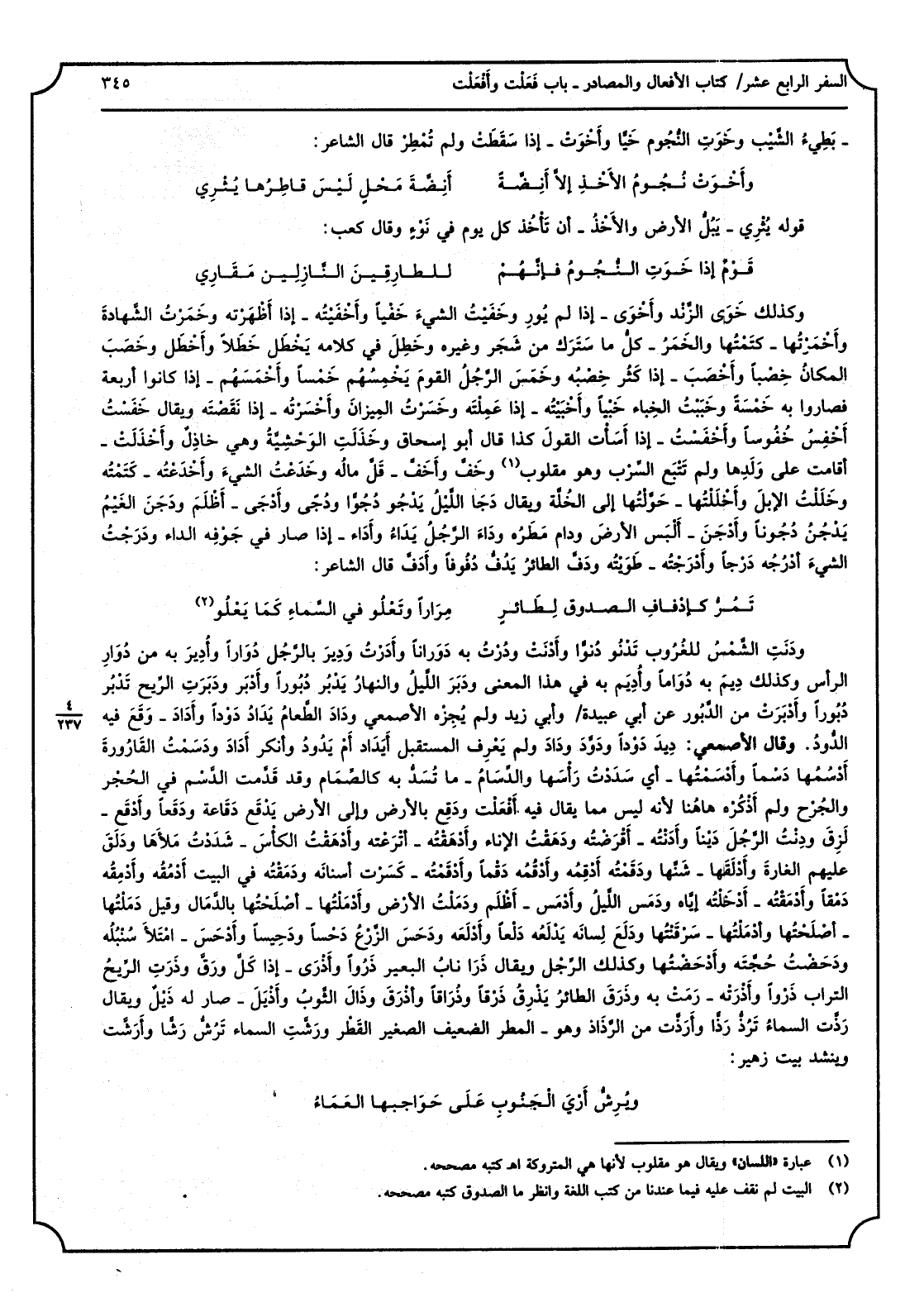 بَطيءُ الشَّيْب وخَوَتِ النجومُ خَيَّاً وأَخْوَتْ: إِذا سَقَطَت وَلم تُمطِر. قَالَ الشَّاعِر: وأَخْوَتْ نُجومُ الأخْذِ إلاّ أَنِضَّةً أَنِضَّةَ مَحْلٍ لَيْسَ قاطِرُها يُثْري قَوْله يُثري: يَبُلُّ الأرضَ والأخْذ: أَن تأخُذَ كل يومٍ فِي نَوْءٍ وَقَالَ كَعْب: قومٌ إِذا خَوَتِ النجومُ فإنَّهمْ للطارِقينَ النَّازلين مَقاري وَكَذَلِكَ خَوَىَ الزَّنْد وأَخْوَى: إِذا لم يُورِ وخَفَيْتُ الشيءَ خَفْيَاً وأَخْفَيتُه: إِذا أَظْهَرْته وخَمَرْتُ الشهادةَ وأَخْمَرتُها: كَتَمْتُها. والخَمَر: كلُّ مَا سَتَرَك من شَجَرٍ وَغَيره وخَطِلَ فِي كَلَامه يَخْطَل خَطَلاً وأَخْطَل وخَصَبَ المكانُ خِصْباً وأَخْصَب: إِذا كَثُر خِصْبُه وخَمَسَ الرجلُ القومَ يَخْمِسُهُم خَمْسَاً وأَخْمَسَهُم: إِذا كَانُوا أَرْبَعَة فصاروا بِهِ خَمْسَةً. وخَبَبْتُ الخِباءَ خَبْيَاً وأَخْبَيتُه: إِذا عَمِلْتَه وخَسَرْتُ الميزانَ وأَخْسَرتُه: إِذا نَقَصْتَه وَيُقَال خَفَسْتُ أَخْفِسُ خُفوساً وأَخْفَستُ: إِذا أَسَأْت القولَ كَذَا قَالَ أَبُو إِسْحَاق وخَذَلَتِ الوَحْشِيَّةُ وَهِي خاذِلٌ وأَخْذَلتْ: أَقَامَت على ولدِها وَلم تَتْبَع السِّرْب وَهُوَ مقلوب وخَفَّ وأخَفَّ: قلَّ مالُه وخَدَعْتُ الشيءَ وأَخْدَعتُه: كَتَمْتُه وخَلَلْتُ الإبلَ وأَخْلَلتُها: حوَّلتُها إِلَى الخُلَّة وَيُقَال دَجا الليلُ يَدْجُو دُجوَّاً ودُجىً وأَدْجَى: أَظْلَم ودَجَنَ الغَيْمُ يَدْجُن دُجوناً وأَدْجَن: أَلْبَس الأرضَ ودامَ مطَرُه وداءَ الرجلُ يَداءُ وأَداء: إِذا صَار فِي جوفِه الدَّاء ودَرَجْتُ الشيءَ أَدْرُجُه دَرْجَاً وأَدْرَجتُه: طَوَيْتُه. ودَفَّ الطائرُ يَدُفُّ دُفوفاً وأَدَفَّ، قَالَ الشَّاعِر: تَمُرُّ كإدْفافِ الصدوق لطائرٍ مِراراً وتَعْلُو فِي السَّماءِ كَمَا يَعْلُو وَدنت الشَّمْس الْغُرُوب تَدْنُو دُنُوَّاً وأَدْنَتْ، ودُرْتُ بِهِ دَوَراناً وأَدَرْتُ وديرَ بالرَّجل دُواراً وأُدير بِهِ من دُوار الرَّأْس وَكَذَلِكَ دِيمَ بِهِ دُواماً وأُديم بِهِ فِي هَذَا الْمَعْنى، ودَبَرَ الَّليل والنَّهار يَدْبُرُ دُبوراً، وأَدْبَرَ ودَبَرَت الرّيح تَدْبُرُ دُبوراً وأَدبَرَتْ من الدَّبور عَن أبي عُبَيْدَة وَأبي زيد وَلم يجزه الْأَصْمَعِي، ودَادَ الطَّعام يَدادُ دَوْداً، وأدادَ: وَقع فِيهِ الدُّود. وَقَالَ الْأَصْمَعِي: دِيدَ دَوْداً ودَوَّدَ ودادَ وَلم يعرف الْمُسْتَقْبل أَيَداد أم يَدودُ وَأنكر أَدادَ، ودَسَمْتُ القارورةَ أدْسُمُها دَسْماً، وأَدْسَمْتُها: أَي سددن رَأسهَا، والدِّسامُ: مَا تُسَدُّ بِهِ كالصِّمام، وَقد قدَّمت الدَّسْم فِي الجُحْر والجُرح وَلم أذكرهُ هَهُنَا لِأَنَّهُ لَيْسَ مِمَّا يُقَال فِيهِ أَفْعَلت ودَقِعَ بِالْأَرْضِ وَإِلَى الأَرْض يَدْقَع دَقاعةً ودَقَعَاً وأَدْقَع: لَزِقَ ودِنْتُ الرجلَ دَيْنَاً وأَدَنْتُه: أَقْرَضتُه ودَهَقْتُ الإناءَ وأَدْهَقتُه: أَتْرَعتُه وأَدْهَقتُ الكأسَ: شَدَدْتُ مَلأْهَا ودَلَقَ عَلَيْهِم الغارةَ وأَدْلَقَها: شَنَّها ودَقَمْتُه أَدْمِقُه دَمْقَاً وأَدْمَقتُه: أَدْخَلتُه إيَّاه ودَمَسَ الليلُ وأَدْمَس: أَظْلَم ودَمَلْتُ الأرضَ وأَدْمَلتُها: أَصْلَحتُها بالدَّمال وَقيل دَمَلْتُها: أَصْلَحتُها وأَدْمَلتُها: سَرْقَنتُها ودَلَعَ لِسَانه يَدْلَعهُ دَلْعَاً وأَدْلَعَهُ ودَحَسَ الزرعُ دَحْسَاً وأَدْحَس: امْتلأ سُنْبُلُه ودَحَضْتُ حُجَّتُه وأَدْحَضتُها وَكَذَلِكَ الرِّجْل وَيُقَال ذَرا نابُ الْبَعِير ذَرْوَاً وأَذْرَى: إِذا كلَّ ورَقَّ وذَرَتِ الريحُ الترابَ ذَرْوَاً وأَذْرَتهُ: رَمَتْ بِهِ وذَرَقَ الطائرُ يَذْرِقُ ذَرْقَاً وذُراقاً وأَذْرَقَ وذالَ الثوبُ وأَذْيَل: صَار لَهُ ذيلٌ وَيُقَال رَذَّت السماءُ تَرُذُّ رَذَّاً وأرَذَّت من الرَّذاذ وَهُوَ: المطرُ الضَّعِيف الصَّغِير القَطْر ورَشَّتِ السماءُ تَرُشُّ