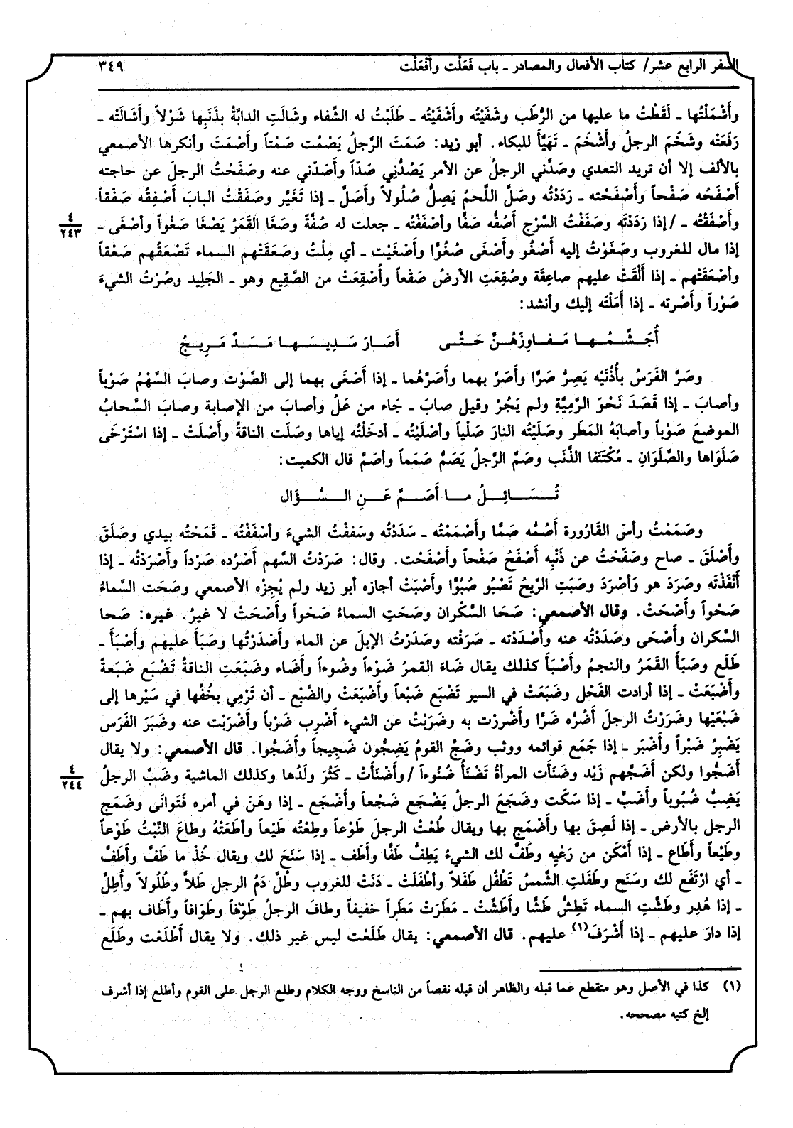 وأَشْمَلتُها: لَقَطْتُ مَا عَلَيْهَا من الرُّطَب وشَفَيْتُه وأَشْفَيتُه: طَلَبْتُ لَهُ الشِّفاء وشالَتِ الدابةُ بذَنَبِها شَوْلاً وأشالَتْه: رَفَعَتْه وشَخَمَ الرجلُ وأَشْخَم: تَهَيَّأَ للبكاء. أَبُو زيد: صَمَتَ الرجلُ يَصْمُت صَمْتَاً وأَصْمَتَ وأنكرها الْأَصْمَعِي بِالْألف إِلَّا أَن تُرِيدُ التَّعَدِّي وصَدَّني الرجلُ عَن الأمرِ يَصُدُّني صَدَّاً وأَصَدَّني عَنهُ وصَفَحْتُ الرجلَ عَن حَاجته أَصْفَحُه صَفْحَاً وأَصْفَحتُه: رَدَدْتُه وصَلَّ اللحمُ يَصِلُّ صُلولاً وأَصَلَّ: إِذا تغيَّر وصَفَقْتُ البابَ صَفْقَاً وأَصْفَقتُه إِذا رَدَدْتَه وصَفَفْتُ السَّرْج أَصُفُّه صَفَّاً وأَصْفَفتُه: جعلت لَهُ صُفَّةً وصَغا القَمرُ يَصْغَا صَغْوَاً وأَصْغَى: إِذا مَال للغروب وصَغَوْتُ إِلَيْهِ أَصْغُو وأَصْغَى صُغُوَّاً وأَصْغَيتُ: أَي مِلْتُ وصَعَقَتهم السَّمَاء تَصْعَقُهم صَعْقَاً وأَصْعَقَتْهُم: إِذا أَلْقَتْ عَلَيْهِم صَاعِقَة، وصُقِعَتِ الأرضُ صَقْعَاً وأُصْقِعَتْ من الصَّقيع وَهُوَ: الجَليد وصُرتُ الشيءَ صَوْرَاً وأَصَرْتُه: إِذا أَمَلْتَه إِلَيْك وَأنْشد: أُجَشِّمُها مَفاوِزَهُنَّ حتَّى أَصارَ سَديسَها مَسَدٌ مَريجُ وصَرَّ الفرَسُ بأُذُنَيْه يَصِرُّ صَرَّاً وأَصَرَّ بهما وأصَرَّهُما: إِذا أَصْغَى بهما إِلَى الصَّوْت وصابَ السهمُ صَوْبَاً وأًصابَ: إِذا قَصَدَ نَحْوَ الرَّمِيَّةِ وَلم يَجُرْ وَقيل صابَ: جَاءَ من عَلُ وأصابَ من الْإِصَابَة وصابَ السَّحابُ الموضعَ صَوْبَاً وأصابَهُ المَطَر وصَلَيْتُه النارَ صَلْيَاً وأَصْلَيتُه: أَدْخَلتُه إِيَّاهَا وصَلَتِ الناقةُ وأَصْلَتْ: إِذا اسْتَرْخى صَلَوَاها والصَّلَوان: مُكْتَنَفا الذَّنَب وصَمَّ الرجلُّ يَصَمُّ صَممَاً وأَصَمَّ، قَالَ الْكُمَيْت: تُسائِلُ مَا أَصَمَّ عنِ السُّؤال وصَمَمْتُ رأسَ القارورة أصُمُّه صَمَّاً وأَصْمَمتُه: سَدَدْتُه وسَفَفْتُ الشيءَ وأَسْفَفتُه: قَمَحْتُه بيَدي وصَلَقَ وأَصْلَقَ: صَاح وصَفَحْتُ عَن ذَنْبِه أَصْفَحُ صَفْحَاً وأَصْفَحتُ. وَقَالَ: صَرَدْتُ السهمَ أَصْرُده صَرْدَاً وأَصْرَدتُه: إِذا أَنْفَذتَه وصَرَدَ هُوَ وأَصْرَدَ وصَبَتِ الريحُ تَصْبُو صُبُوَّاً وأَصْبَتْ أجَازه أَبُو زيد وَلم يُجِزه الْأَصْمَعِي وصَحَتِ السماءُ صَحْوَاً وأَصْحَتْ. وَقَالَ الْأَصْمَعِي: صَحا السَّكْران وصَحَتِ السماءُ صَحْوَاً وأَصْحَتْ لَا غير. غَيره: صَحا السَّكران وأَصْحَى وصَدَدْتُه عَنهُ وأَصْدَدتُه: صَرَفْته وصَدَرْتُ الإبلَ عَن المَاء وأَصْدَرتُها وصَبَأَ عَلَيْهِم وأَصْبَأ: طَلَعَ وصَبَأَ القمرُ والنجمُ وأَصْبَأ كَذَلِك يُقَال ضاءَ القمرُ ضَوْءَاً وضُوءاً وأَضاءَ وضَبَعَتِ الناقةُ تَضْبَع ضَبَعَةً وأَضْبَعتْ: إِذا أَرَادَت الفَحْل وضَبَعَتْ فِي السّير تَضْبَع ضَبْعَاً وأَضْبَعتْ والضَّبْع: أَن تَرْمِي بخُفِّها فِي سَيْرِها إِلَى ضَبْعَيْها وضَرَرْتُ الرجلَ أضُرُّه ضَرَّاً وأَضْرَرتُ بِهِ وضَرَبْتُ عَن الشَّيْء أَضْرِب ضَرْبَاً وأَضْرَبتُ عَنهُ وضَبَرَ الفرَس يَضْبِر ضَبْرَاً وأَضْبَر: إِذا جمَعَ قوائمه ووثب وضَجَّ القومُ يَضِجُّون ضَجيجاً وأَضَجُّوا. قَالَ الْأَصْمَعِي: وَلَا يُقَال أَضَجُّوا وَلَكِن أَضَجَّهم زَيْد وضَنَأَتِ المرأةُ تَضْنَأُ ضُنوءاً وأَضْنَأتْ: كَثُر وَلَدُها وَكَذَلِكَ الْمَاشِيَة وضَبَّ الرجلُ يَضِبُّ ضُبوباً وأَضَبَّ: إِذا سَكَتَ وَضَجَع الرجلُ يَضْجَع ضَجْعَاً وأَضْجَع: إِذا وَهَنَ فِي أمره فتَوانى وَضَمَج الرجلُ بِالْأَرْضِ: إِذا لَصِقَ بهَا وأَضْمَج بهَا وَيُقَال طُعْتُ الرجلَ طَوْعَاً وطِعْتُه طَيْعَاً وأَطَعْتُه وطاعَ النَّبْتُ طَوْعَاً وطَيْعَاً وأَطاعَ: إِذا أَمْكَن من رَعْيِه وطَفَّ لَك الشيءُ يَطِفُّ طَفَّاً وأَطَف: إِذا سَنَحَ لَك وَيُقَال خُذ مَا طَفَّ وأَطَفَّ: أَي ارتَفَع لَك وَسَ