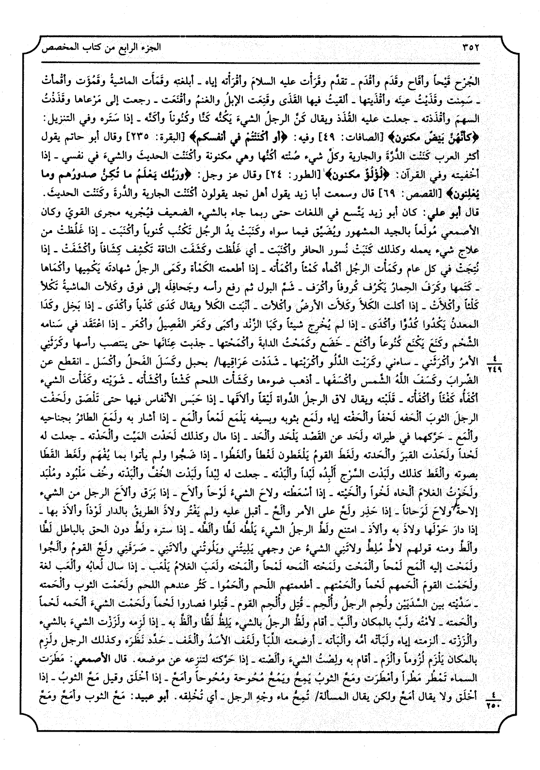 الجُرْح قَيْحَاً وأقاحَ وقَدَمَ وأَقْدَم: تقدَّم وقَرَأْت عَلَيْهِ السلامَ وأَقْرَأْته إِيَّاه: أبلغته وقَمَأَت الماشيةُ وقَمُؤَت وأَقْمَأتْ: سَمِنَت وقَذَيْتُ عينَه وأَقْذَيتُها: أَلْفَيتُ فِيهَا القَذى وقَنِعَت الإبلُ والغنمُ وأَقْنَعت: رجعت إِلَى مَرْعَاها وقَذَذْتُ السهمَ وأَقْذَذتُه: جعلت عَلَيْهِ القُذَذ وَيُقَال كَنَّ الرجلُ الشيءَ يكُنُّه كَنَّاً وكُنوناً وأكَنَّه: إِذا سَتَرَه وَفِي التَّنْزِيل: (كأنَّهُنَّ بَيْضٌ مَكْنُون) . وَفِيه: (أَو أَكْنَنْتُم فِي أَنفسكُم) . وَقَالَ أَبُو حَاتِم يَقُول أَكثر الْعَرَب كَنَنْت الدُّرَّةَ وَالْجَارِيَة وكلَّ شَيْء صُنته أكُنُّها وَهِي مكنونة وأَكْنَنت الحديثَ والشيءَ فِي نَفسِي: إِذا أَخْفَيته وَفِي الْقُرْآن: (لؤلؤٌ مَكْنُون) . وَقَالَ عز وَجل: (وربُّكَ يَعْلَمُ مَا تُكِنُّ صدورُهم وَمَا يُعْلِنون) . وَقَالَ سَمِعت أَبَا زيد يَقُول أهل نجد يَقُولُونَ أَكْنَنت الْجَارِيَة والدُّرَّة وكَنَنْت الحديثَ. قَالَ أَبُو عَليّ: كَانَ أَبُو زيد يَتَّسع فِي اللُّغَات حَتَّى رُبمَا جَاءَ بالشَّيْء الضَّعِيف فيُجْريه مجْرى الْقوي وَكَانَ الْأَصْمَعِي مُولَعاً بالجيد الْمَشْهُور ويُضَيِّق فِيمَا سواهُ وكَنَبَتْ نسور الْحَافِر وأَكْنَبتْ: أَي غَلُظت وكَشَفَت النَّاقة تَكْشِف كِشافاً وأَكْشَفتْ: إِذا نُتِجَتْ فِي كل عَام وكَمَأْت الرجل أَكْمَأه كَمْئَاً وأَكْمَأتُه: إِذا أطعمته الكَمْأَة وكمى الرجلُ شهادتَه يَكْمِيها وأَكْمَاها: كَتَمَها وكَرَفَ الحمارُ يَكْرُف كُروفاً وأَكْرَف: شَمَّ الْبَوْل ثمَّ رفع رَأسه وجَحافِلَه إِلَى فَوق وكَلأت الماشيةُ تَكْلأ كَلْئَاً وأَكْلأَتْ: إِذا أكلت الكَلأَ وكَلأَتَ الأرضُ وأَكْلأَت: أَنْبَتت الْكلأ. وَيُقَال كَدَىَ كَدْيَاً وأَكْدَى: إِذا بَخِلَ وكَدا المعدنُ يَكْدُوا كُدُوَّاً وأَكْدَى: إِذا لم يُخرِج شَيْئا وكَبا الزَّنْد وأَكْبَى وكَعَرَ الفَصيل وأَكْعَر: إِذا اعتَقَد فِي سَنامه الشَّحْم وكَنَعَ يَكْنَع كُنوعاً وأَكْنَع: خَضَعَ وكَمَحْتُ الدابةَ وأَكْمَحتُها: جذبت عِنانَها حَتَّى ينْتَصب رَأسهَا وكَرَثَني الأمرُ وأَكْرَثني: سَاءَنِي وكَرَبْت الدَّلْو وأَكْرَبْتها: شَدَدْت عَراقِيها بِحَبل وكَسَلَ الفحلُ وأَكْسَل: انْقَطع عَن الضراب وكَسَفَ اللهُ الشمسَ وأَكْسَفَها: أذهب ضوأها وكَشَأْت اللَّحْم كَشْئَاً وأَكْشَأتُه: شَوَيْته وكَفَأْت الشيءَ أَكْفَأهُ كَفْئَاً وأَكْفَأته: قَلَبْته وَيُقَال لاقَ الرجلُ الدَّواة لَيْقَاً وألاقَها: إِذا حَبَسَ الأنفاس فِيهَا حَتَّى تَلْصَق ولَحَفْت الرجلَ القوبَ أَلْحَفه لَحْفَاً وأَلْحَفتُه إِيَّاه ولَمَعَ بِثَوْبِهِ وبسيفه يَلْمَع لَمْعَاً وأَلْمَع: إِذا أَشَارَ بِهِ ولَمَعَ الطائرُ بجناحَيْه وأَلْمَع: حرَّكهُما فِي طيرانه ولَحَدَ عَن الْقَصْد يَلْحَد وأَلْحَد: إِذا مَال وَكَذَلِكَ لَحَدْت الميِّتَ وأَلْحَدتُه: جعلت لَهُ لَحْدَاً ولَحَدْت القبرَ وأَلْحَدتُه ولَغَطَ القومُ يَلْغَطون لَغْطَاً وأَلْغَطوا: إِذا ضَجُّوا وَلم يَأْتُوا بِمَا يُفهَم ولَغَطَ القَطا بِصَوْتِهِ وأَلْغَط كَذَلِك ولَبَدْت السَّرْج أَلْبِدهُ لَبْدَاً وأَلْبَدتُه: جعلت لَهُ لِبْداً ولَبَدْت الخُفَّ وأَلْبَدتُه: وخُفٌّ مَلْبُود ومُلْبَد ولَخَوْتُ الغلامَ ألخاه وأَلْخُوه لَخْوَاً وأَلْخَيتُه: إِذا أَسْعَطته ولاحَ الشيءُ لَوْحَاً وألاحَ: إِذا بَرَقَ وألاحَ الرجل من الشَّيْء إلاحةً ولاحَ لَوَحاناً: إِذا حَذِرَ ولَحَّ على الْأَمر وأَلَحَّ: أقبل عَلَيْهِ وَلم يَفْتُر ولاذَ الطريقُ بِالدَّار لَوْذَاً وألاذَ بهَا: إِذا دارَ حَوْلَها ولاذَ بِهِ وألاذَ: امْتنع ولَطَّ الرجلُ الشيءَ يَلُطُّه لَطَّاً وأَلَطُّه: إِذا ستره ولَطَّ دون الْحق بِالْبَاطِلِ لَطَّاً وألَطَّ وَمِنْه قَوْلهم لاطٌّ مُلِطٌّ ولاتَني الشيءُ عَن وَجْهي 