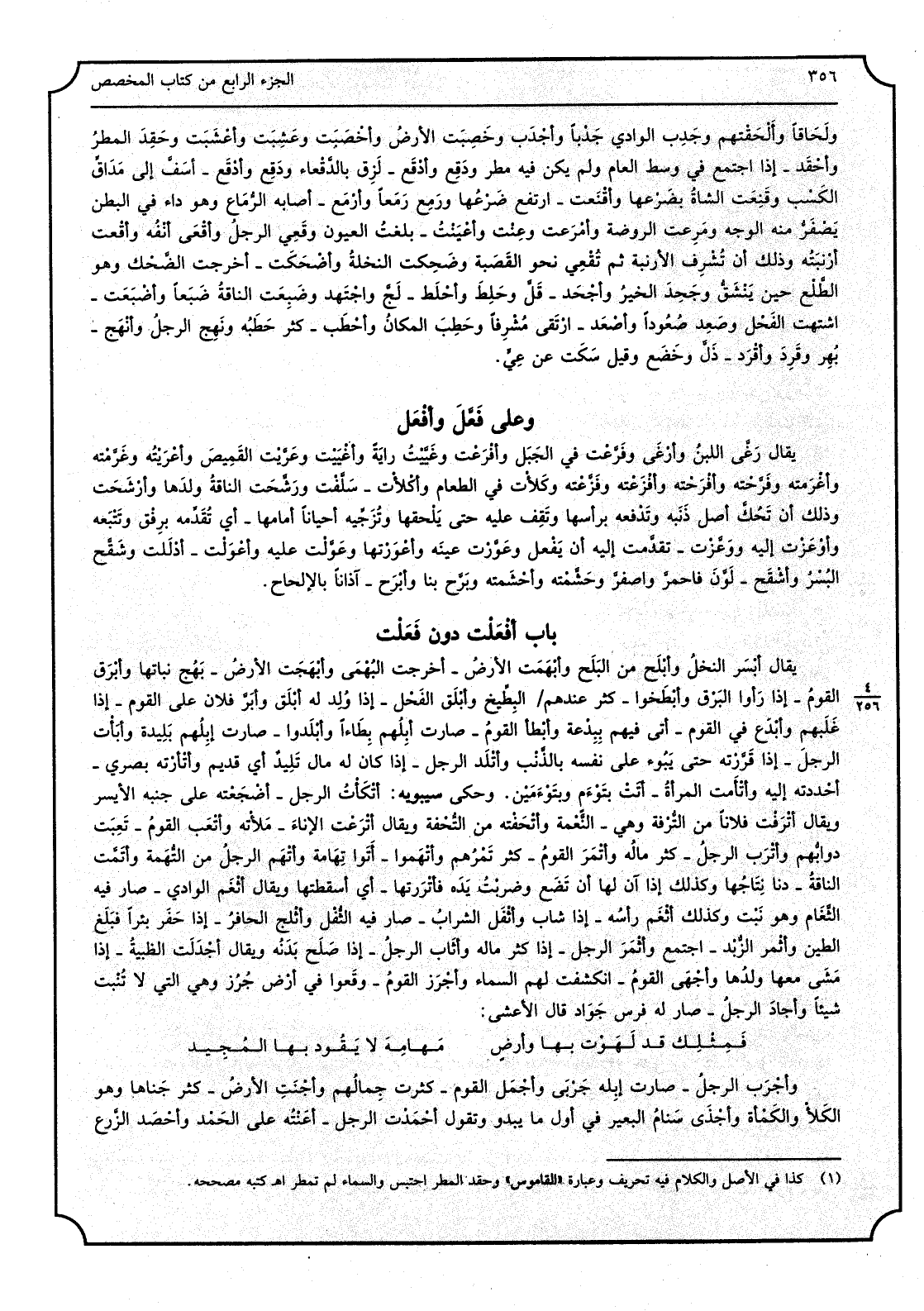 ولَحاقاً وأَلْحَقتهم وجَدِبَ الْوَادي جَدْبَاً وأَجْدَب وخَصِبَت الأرضُ وأَخْصَبت وعَشِبَت وأَعْشَبت وحَقِدَ المطرُ وأَحْقَد: إِذا اجْتمع فِي وسط الْعَام وَلم يكن فِيهِ مطر ودَفِعَ وأَدْفَع: لَزِقَ بالدَّقْعاء ودَقِعَ وأَدْقَع: أسَفَّ إِلَى مَداقِّ الكَسْب وقَنِعَت الشاةُ بضَرْعها وأَقْنَعت: ارْتَفع ضَرعها ورَمِعَ رَمَعَاً وأَرْمَع أَصَابَهُ الرُّماع وَهُوَ دَاء فِي الْبَطن يصفَرُّ مِنْهُ الْوَجْه ومَرِعَت الرَّوْضَة وأَمْرَعت وعِنْتَ وأَعْيَنْت: بلغت الْعُيُون وقَعِيَ الرجلُ وأَقْعَى أنفُه وأَقْعَت أَرْنَبتهُ وَذَلِكَ أَن تُشرِف الأرنبة ثمَّ تَقْعي نَحْو القَصَبة وضَحِكَت النخلةُ وأَضْحَكت: أخرجت الضَّحْك وَهُوَ الطَّلْع حِين يَنْشَقُّ وجَحِدَ الخيرُ وأَجْحَد: قلَّ وحَلِطَ وأَحْلَط: لَجَّ واجتَهد وضَبِعَت الناقةُ ضَبَعَاً وأَضِبَعت: اشتهت الْفَحْل وصَعِدَ صُعوداً وأَصْعَد: ارْتقى مُشْرِفاً وحَطِبَ المكانُ وأَحْطَب: كثر حطَبُه ونَهِجَ الرجلُ وأَنْهَج: بُهِر وقَرِدَ وأَقْرَد: ذَلَّ وخَضَعَ. وَقيل سَكَتَ عَن عِيٍّ.