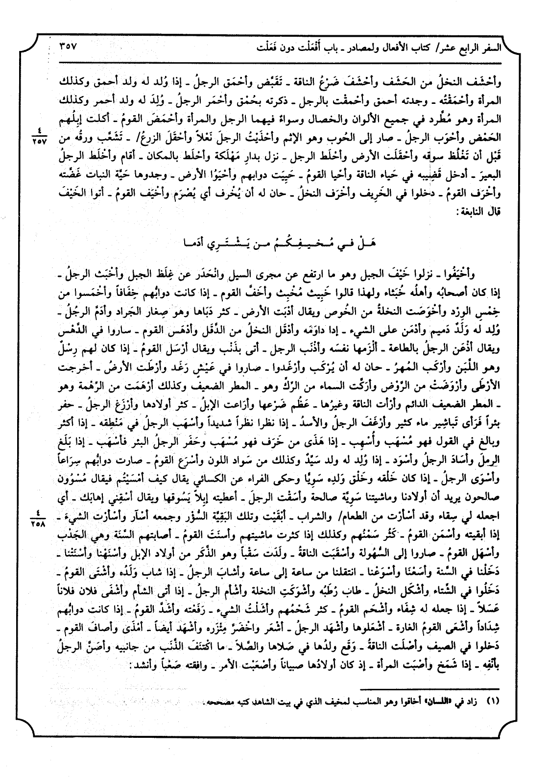 وأَحْشَف النخلُ من الحَشَف وأَحْشَف ضَرْعُ النَّاقة: تَقَبَّض وأَحْمَق الرجلُ: إِذا ولِدَ لَهُ ولد أَحمَق وَكَذَلِكَ الْمَرْأَة وأَحْمَقتُه: وجدته أَحمَق وأَحْمَقت بِالرجلِ: ذكرته بحمق وأَحْمَرَ الرجلُ: وُلِد لَهُ ولد أَحْمَر وَكَذَلِكَ الْمَرْأَة وَهُوَ مُطَّرِد فِي جَمِيع الألوان والخصال وسواءٌ فيهمَا الرجل وَالْمَرْأَة وأَحْمَض القومُ: أكلت إبلُهم الحَمْض وأَحْوَب الرجلُ: صَار إِلَى الحُوب وَهُوَ الْإِثْم وأَحْذَيتُ الرجل نَعْلاً وأَحْقَلَ الزرعُ: تَشَعَّب ورقُه من قَبْل أَن تَغْلُظ سوقه وأَحْقَلَت الأَرْض وأَحْلَطَ الرجل: نزل بدار مَهْلَكة وأَحْلَط بِالْمَكَانِ: أَقَامَ، وأَخْلَط الرجلُ البعيرَ: أَدخل قَضِيبه فِي حَياء النَّاقة وأَحْيَا القومُ: حَيِيَت دوابهم وأَحْيَوا الأَرْض: وجدوها حَيَّة النَّبَات غَضَّته وأَخْرَف القومُ: دخلُوا فِي الخَريف وأَخْرَف النخلُ: حَان لَهُ أَن يُخرَف أَي يُصرَم وأَخْيَف القومُ: أَتَوْا الخَيْفَ. قَالَ النَّابِغَة: هلْ فِي مُخيفِكُمْ من يَشْتَري أدَما أَخْيَفوا: نزلُوا خَيْفَ الْجَبَل وَهُوَ مَا ارْتَفع عَن مجْرى السَّيْل وانْحَدر عَن غِلَظ الْجَبَل وأَخْبَث الرجلُ: إِذا كَانَ أصحابُه أهلُه خُبَثاء وَلِهَذَا قَالُوا خَبيث مُخْبِث وأخَفَّ الْقَوْم: إِذا كَانَت دوابُّهم خِفافاً وأَخْمَسوا من خِمْسِ الوِرْد وأَخْوَصتْ النخلةُ من الخُوص وَيُقَال أَدْبَت الأَرْض: كثر دَباها وَهُوَ صِغار الْجَرَاد وأدَمَّ الرجلُ: وُلد لَهُ ولدٌ دَميم وأَدْمَن على الشَّيْء: إِذا داوَمَه وأَدْقَل النخلُ من الدَّقْل وأَدْهَس الْقَوْم: سَارُوا فِي الدَّهْس وَيُقَال أَذْعَن الرجلُ بِالطَّاعَةِ: أَلْزَمها نَفْسَه وأَذْنَب الرجل: أَتَى بِذَنْب وَيُقَال أَرْسَل القومُ: إِذا كَانَ لَهُم رِسْلٌ وَهُوَ اللَّبن وأَرْكَب المُهْرُ: حَان لَهُ أَن يُركَب وأَرْغَدوا: صَارُوا فِي عَيْشٍ رَغَد وأَرْطَت الأرضُ: أخرجت الأرْطى وأَرْوَضتْ من الرَّوْض وأرَكَّت السَّمَاء من الرِّكِّ وَهُوَ الْمَطَر الضَّعِيف وَكَذَلِكَ أَرْهَمتْ من الرِّهْمَة وَهُوَ الْمَطَر الدَّائِم وأَرْأَت النَّاقة وَغَيرهَا: عَظُم ضَرْعُها وأَرَاَعت الإبلُ: كثر أَوْلَادهَا وأَرْزَغ الرجلُ: حفر بِئْرا فَرَأى تَباشير مَاء كثير وأَرْغَف الرجلُ والأسدُ: إِذا نظرا نظرا شَدِيدا وأَسْهَب الرجلُ فِي مَنْطِقه: إِذا أَكثر وَبَالغ فِي القَوْل فَهُوَ مُسْهَب وأُسْهِب: إِذا هذَى من خَزَف فَهُوَ مُسْهَب وحَفَرَ الرجلُ البئرَ فأسْهَب: إِذا بَلَغَ الرملَ وأسادَ الرجلُ وأَسْوَد: إِذا وُلشد لَهُ ولد سَيِّدٌ وَكَذَلِكَ من سَواد اللَّوْن وأَسْرَع القومُ: صَارَت دوابُّهم سِراعاً وأَسْوَى الرجلُ: إِذا كَانَ خَلْقُه وخَلْقُ وَلده سَوِيَّاً وَحكى الْفراء عَن الْكسَائي يُقَال كَيفَ أَمْسَيْتُم فَيُقَال مُسْوُون صَالِحُونَ يُرِيد أَن أَوْلَادنَا وماشيتنا سَوِيَّة صَالِحَة وأَسَقْت الرجلَ: أَعْطيته إبِلا يَسوقها وَيُقَال أَسْقِني إهابك: أَي اجْعَلْهُ لي سِقاء وَقد أَسْأَرت من الطَّعَام وَالشرَاب: أَبْقَيْت وَتلك البَقِيَّة السُّؤْر وَجمعه أسْآر وأَسْأَرت الشيءَ: إِذا أبقيته وأَسْمَن القومُ: كثُر سَمْنُهم وَكَذَلِكَ إِذا كثرت ماشيتهم وأَسْنَتَ القومُ: أَصَابَتْهُم السَّنَة وَهِي الجَدب وأَسْهَل القومُ: صَارُوا إِلَى السُّهولة وأَسْقَبت الناقةُ: وَلَدَت سَقْبَاً وَهُوَ الذّكَر من أَوْلَاد الْإِبِل وأَسْنَهنا وأَسْنَتنا: دَخَلْنا فِي السَّنة وأَسَعْنا وأَسْوَعنا: انتقلنا من سَاعَة إِلَى سَاعَة وأشابَ الرجلُ: إِذا شابَ ولَدُه وأَشْتَى القومُ: دخلُوا فِي الشِّتاء وأَشْكَل النخلُ: طابَ رُطَبُه وأَشْوَكت النخلةُ وأَشْأَم الرجلُ: إِذا أَتَى الشأم وأَشْفَى فلَان فلَانا عَسَلاً: إِذا جعله لَهُ شِفاءً وأَشْحَم القومُ: كثر شحمُهم وأَشَلْتُ الشَّيْء: رَفَعْته وأشَدَ