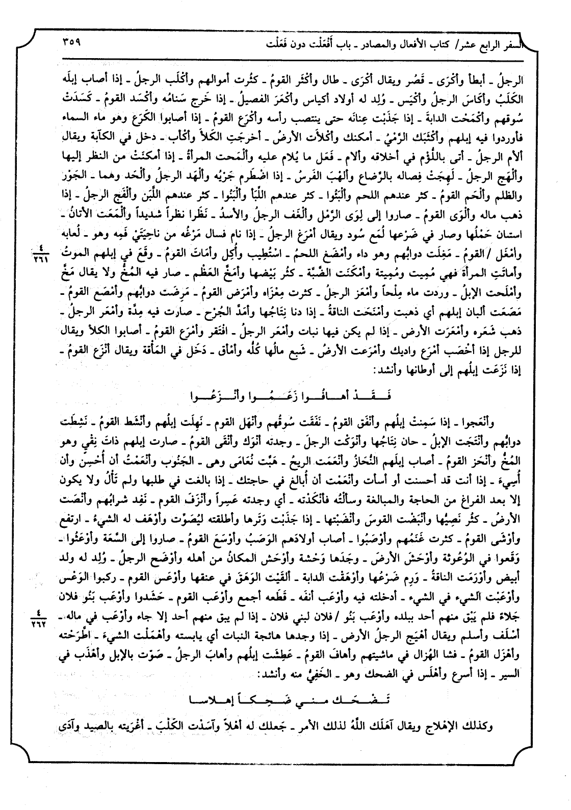 الرجلُ: أَبْطَأَ وأَكْرَى: قصُر وَيُقَال أَكْرَى: طالَ وأَكْثَر القومُ: كثُرت أَمْوَالهم. وأَكْلَب الرجلُ: إِذا أصَاب إبِله الكَلَبُ وأكاسَ الرجلُ وأَكْيَس: وُلشد لَهُ أَوْلَاد أكياس وأَكْعَر الفَصيل: إِذا خرجَ سَنامُه وأَكْسَد القومُ: كَسَدَتْ سُوقهم وأَكْمَحتُ الدابةَ: إِذا جَذَبْت عِنانه حَتَّى ينْتَصب رَأسه وأَكْرَع القومُ: إِذا أَصَابُوا الكَرَع وَهُوَ مَاء السَّمَاء فأوردوا فِيهِ إبلهم وأَكْثَبَك الرَّمْيُ: أمكنك وأكلأَتِ الأرضُ: أخرجتِ الكَلأ وأَكْأَب: دخل فِي الكآبة وَيُقَال أَلأْمَ الرجلُ: أَتَى بالُّلؤْم فِي أخلاقه وألامَ: فعل مَا يُلام عَلَيْهِ وأَلْمَحت المرأةُ: إِذا أَمْكَنتْ من النّظر إِلَيْهَا وأَلْهَج الرجلُ: لَهِجَتْ فِصاله بالرَّضاع وأَلْهَب الفرَسُ: إِذا اضْطَرم جَرْيُه وأَلْهَد الرجلُ وألحد وهما الجَوْر وَالظُّلم وأَلْحَم القومُ: كثُر عِنْدهم اللَّحْم، وأَلْبَئوا: كثر عِنْدهم اللِبَأ وأَلْبَنوا: كثر عِنْدهم اللَّبن وأَلْفَج الرجلُ: إِذا ذهب مَاله وأَلْوَى القومُ: صَارُوا إِلَى لِوَى الرمل وأَلْغَف الرجلُ وألسدُ: نظرا نظرا شَدِيدا وأَلْمَعتِ الأتانُ: استبان حَمْلُها وَصَارَ فِي ضَرْعِها لُمَع سُود وَيُقَال أَمْرَغ الرجلُ: إِذا نامَ فَسَالَ مَرْغُه من ناحِيَتَيْ فَمِه وَهُوَ: لُعابه وأَمْغَل القومُ: مَغِلَت دوابُّهم وَهُوَ دَاء وأَمْضَغ اللحمُ: استُطْيِب وأُكِل وأماتَ القومُ: وقعَ فِي إبلهِم الموتُ وأماتتِ الْمَرْأَة فَهِيَ مُميت ومُميتة وأَمْكَنت الضَّبَّة: كثُر بَيْضُها وأمَخَّ العَظْم: صَار فِيهِ المُخُّ وَلَا يُقَال مَخَّ وأَمْلَجت الإبلُ: وَردت مَاء مِلْحاً وأَمْعَز الرجلُ: كثرت مِعْزاه وأَمْرَض القومُ: مَرِضَت دوابُّهم وأَمْصَع القومُ: مَصَعَت ألبان إبلهم أَي ذهبت وأَمْنَحت الناقةُ: إِذا دنا نِتاجُها وأمَدَّ الجُرح: صَارَت فِيهِ مِدَّة وأَمْعَر الرجلُ: ذهب شَعَره وأَمْعَرت الأَرْض: إِذا لم يكن فِيهَا نَبَات وأَمْعَر الرجلُ افْتَقَر وأَمْرَع القومُ: أَصَابُوا الْكلأ وَيُقَال للرجل إِذا أَخْصَب أَمْرَع واديك وأَمْرَعت الأرضُ: شَبِعَ مالُها كلُّه وأَمْأَق: دخلَ فِي المَأْقة وَيُقَال أَنْزَع القومُ: إِذا نَزَعَتْ إبلهُم إِلَى أوطانها وَأنْشد: لمرأةُ: حاضَت وَفِي الْقُرْآن: (فلمَّا رأيْنَهُ أَكْبَرْنَهُ) . أَي حِضْنَ وَمن قَرَأَ أَكْبَرْنَهُ بِضَم الْهَاء فِي الْوَصْل أَرَادَ أَعْظَمْنَهُ وأَكَتَّ الرجلُ الشيءَ: أَحْصَاهُ وَقوم لَا يُكَتُّ عَديدُهم: أَي لَا يُحصى وأَكْرَى الرجلُ: أَبْطَأَ وأَكْرَى: قصُر وَيُقَال أَكْرَى: طالَ وأَكْثَر القومُ: كثُرت أَمْوَالهم. وأَكْلَب الرجلُ: إِذا أصَاب إبِله الكَلَبُ وأكاسَ الرجلُ وأَكْيَس: وُلشد لَهُ أَوْلَاد أكياس وأَكْعَر الفَصيل: إِذا خرجَ سَنامُه وأَكْسَد القومُ: كَسَدَتْ سُوقهم وأَكْمَحتُ الدابةَ: إِذا جَذَبْت عِنانه حَتَّى ينْتَصب رَأسه وأَكْرَع القومُ: إِذا أَصَابُوا الكَرَع وَهُوَ مَاء السَّمَاء فأوردوا فِيهِ إبلهم وأَكْثَبَك الرَّمْيُ: أمكنك وأكلأَتِ الأرضُ: أخرجتِ الكَلأ وأَكْأَب: دخل فِي الكآبة وَيُقَال أَلأْمَ الرجلُ: أَتَى بالُّلؤْم فِي أخلاقه وألامَ: فعل مَا يُلام عَلَيْهِ وأَلْمَحت المرأةُ: إِذا أَمْكَنتْ من النّظر إِلَيْهَا وأَلْهَج الرجلُ: لَهِجَتْ فِصاله بالرَّضاع وأَلْهَب الفرَسُ: إِذا اضْطَرم جَرْيُه وأَلْهَد الرجلُ وألحد وهما الجَوْر وَالظُّلم وأَلْحَم القومُ: كثُر عِنْدهم اللَّحْم، وأَلْبَئوا: كثر عِنْدهم اللِبَأ وأَلْبَنوا: كثر عِنْدهم اللَّبن وأَلْفَج الرجلُ: إِذا ذهب مَاله وأَلْوَى القومُ: صَارُوا إِلَى لِوَى الرمل وأَلْغَف الرجلُ وألسدُ: نظرا نظرا شَدِيدا وأَلْمَعتِ الأتانُ: استبان حَمْلُها وَصَارَ فِي ضَرْعِها لُمَع سُود وَيُقَال أَمْرَغ الرجلُ: إِذا نامَ فَسَالَ مَرْغُه من ناحِيَتَيْ فَمِه وَهُوَ: لُعابه وأَمْغَل الق