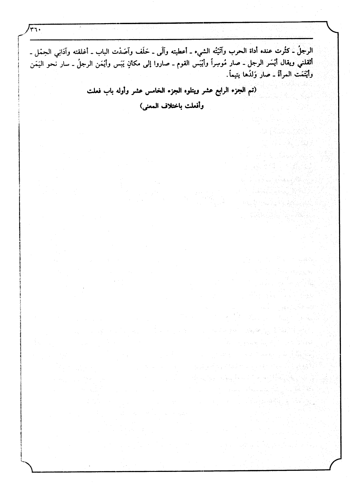 الرجلُ: كثُرت عِنْده أَدَاة الْحَرْب وآتَيْتُه الشَّيْء: أَعْطيته وآلى: حَلَفَ وآصَدت الْبَاب: أغلقته وآداني الحِمْل: أثقلني وَيُقَال أَيْسَر الرجل: صَار مُوسِرًا وأَيْبَس الْقَوْم: صَارُوا إِلَى مكانٍ يَبَس وأَيْمَن الرجلُ: سَار نَحْو اليَمَن وأَيْتَمت المرأةُ: صَار ولدُها يَتِيما. تمّ الْجُزْء الرَّابِع عشر ويتلوه الْجُزْء الْخَامِس عشر وأوله بَاب فعلت وأفعلت باخْتلَاف الْمَعْنى. وَمن يتوكل على الله فَهُوَ حَسبه