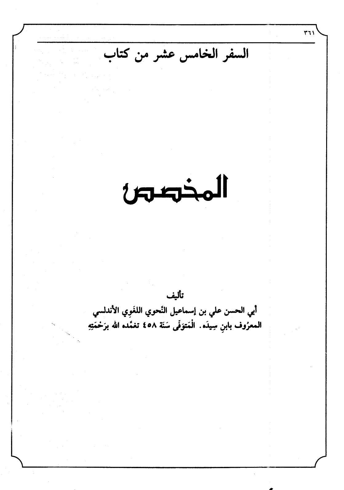 بِسم الله الرَّحْمَن الرَّحِيم السّفر الْخَامِس عشر من كتاب الْمُخَصّص تأليف أبي الْحسن عَليّ بن إِسْمَاعِيل النَّحْوِيّ اللّغَوِيّ الأندلسي الْمَعْرُوف بِابْن سَيّده الْمُتَوفَّى سنة 458 تغمده الله برحمته.