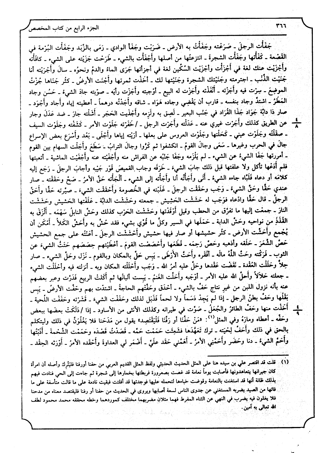 جَفَأْتُ الرجل: صَرَعْته وجَفَأْتُ بِهِ الأَرْض: ضَرَبْت وجَفَأَ الْوَادي: رمى بالزَّبَد وجَفَأْت البُرْمة فِي القَصْعة: كَفَأْتها وجَفَأْت الشجرةَ: انتزعتُها من أَصْلهَا وأَجْفَأت بالشَّيْء: طَرَحْت جَزَيْته على الشَّيْء: كَاَفَأته وأَجْزَيتُ عَنْك لُغَة فِي أَجْزَأْت وأَجْزَيْت السِّكِّين لُغَة فِي أجزأتها. جَرى الماءُ والدمُ ونحوُه: سالَ وأَجْزَيتُه أَنا جَنَيْت الذنْب: اجترمته وجَنَيْتك الشَّجَرَة وجَنَيْتها لَك: أَخَذْت ثَمَرَتهَا وأَجْنَتِ الأرضُ: كثُر جَناها جُزْتُ الموضِعَ: سِرْت فِيهِ وأَجَزْته: أَنْفَذتُه وأَجَزْت لَهُ البيع: أَوْجَبتُه وأَجَزْت رأيَه: صوّبته جادَ الشيءُ: حَسُن وجادَ المطرُ: اشتدَّ وجاد بِنَفسِهِ: قَارب أَن يَقْضِي وجاده هَواه: شاقه وأَجَدْتُه درهما: أَعْطيته إِيَّاه وأجاد وأَجْوَد: صَار ذَا دابَّة جَواد. جَذا القُراد فِي جَنْبِ الْبَعِير: لَصِقَ بِهِ ولَزِمَه وأَجْذَيْت الحَجَر: أَشَلْته جارَ: ضد عَدَلَ وجار عَن الطَّرِيق كَذَلِك وأَجَرْت غَيْرِي عَنهُ: عَدَلْته وأَجَرْت الرجل: خَفَرْته جَلَوْت الْأَمر: كَشَفْته وجَلَوْت السَّيْف: صَقَلْته وجَلَوْت عَيْني: كَحَلْتها وجَلَوْت الْعَرُوس على بَعْلهَا: أَرَيْته إِيَّاهَا وأَجْلَى: بعُد وأَسْرَع بعض الْإِسْرَاع جالَ فِي الْحَرْب وَغَيرهَا: سَعى وجالَ القومُ: انكشفوا ثمَّ كَرُّوا وجالَ الترابُ: سَطَعَ وأَجَلْت السِّهَام بَين الْقَوْم: أمررتها جَفا الشيءُ عَن الشَّيْء: لم يَلْزَمه وجَفا جَنْبُه عَن الْفراش مِنْهُ وأَجْفَيْته عَنهُ وأَجْفَيْت الْمَاشِيَة: أتعبتها فَلم أَدَعْها تَأْكُل وَلَا علفتها قبل ذَلِك. جابَ الشيءَ: خَرَقَه وجاب القميصَ قَوَّر جَيْبَه وأجابَ الرجلَ: رَجَعَ إِلَيْهِ كلامَه أَو دَعَاهُ فلَبَّاه. جَاءَهُ الشيءُ: أَتى وأَجَأْتهُ إِلَى الشَّيْء: أَلْجَأتُه. حَقَّ الأمرُ: صَحَّ وحَقَقْته: صَار عِنْدِي حَقَّاً وحَقَّ الشيءُ: وَجَبَ وحَقَقْت الرجلَ: غَلَبْته فِي الْخُصُومَة وأَحْقَقْت الشيءَ: صيَّرته حَقَّاً وأَحَقَّ الرجلُ: قَالَ حقّاً وادّعاه فوَجب لَهُ. حَشَشْت الحَشيش: جمعته وحَشَشْت الدابَّة: عَلَفْتها الحَشيش وحَشَشْت النارَ: جمعت إِلَيْهَا مَا تفرق من الْحَطب وَقيل أَوْقَدْتها وحَشَشْت الحَرْب كَذَلِك وحَشَّ النابلُ سَهْمَه: أَلْزَق بِهِ القُذَذَ من نواحيه وحَشَّ الدَّابَّة: حَمَلَها فِي السّير وكلُّ مَا قُوِّي بِشَيْء فقد حُشَّ بِهِ وأحَشَّ الكلأُ: أَمْكَن أَن يُجمَع وأَحَشَّت الأَرْض: كثُر حشيشها أَو صَار فِيهَا حشيش وأَحْشَشتُ الرجلَ: أَعَنْتُه على جمع الْحَشِيش حَصَّ الشَّعَرَ: حَلَقَه وأَذْهَبه وحَصَّ رَحِمَه: قَطَعَها وأَحْصَصتُ القومَ: أَعْطَيْتهم حِصَصَهم حَتَتُّ الشيءَ عَن الثَّوْب: فَرَكْته وحَتَّ اللهُ مالَه: أَفْقَره وأحَتَّ الأرْطى: يَبِسَ. حلَّ بِالْمَكَانِ وبالقوم: نزل وحَلَّ الشَّيْء: صَار حِلاًّ وحَلَلْت العُقْدة: نَقَضْت عَقْدَها وحَلَّ عَلَيْهِ أمرُ الله: وَجَبَ وأَحْلَلتُه الْمَكَان وَبِه: أنزلته فِيهِ وأَحْلَلت الشَّيْء: جعلته حَلالاً وأحَلَّ الله عَلَيْهِ الْأَمر: أَوْجَبه وأحَلَّت الغنمُ: يَبِسَت ألبانُها ثمَّ أَكَلَت الرّبيع فدرَّت وَعبر بَعضهم عَنهُ بِأَنَّهُ نزُول اللَّبن من غير نِتاج حَفَّ بالشَّيْء: أَحْدَق وحَفَّتْهم الحاجةُ: اشتدَّت بهم وحَفَّت الأرضُ: يبسط بَقْلُها وحَفَّ بطنُ الرجل: إِذا لم يَجِدْ دَسَمَاً وَلَا لَحْمًا فذَبَل لذَلِك وحَفَفْت الشيءَ: قَشَرْته وحَفَفْت اللِّحْيَة: أَخَذْت مِنْهَا وحَفَّ الطائرُ والجَعَلُ: صوَّت فِي طيرانه وَكَذَلِكَ الْأُنْثَى من الأساود: إِذا دَلَكَتْ بعضَها بِبَعْض وحَفَّه: أعطَاهُ ومارَهُ وَفِي الْمثل: مَن حَفَّنا أَو رَفَّنا فَلْيَقْتَصِد. يَقُول من مَدَحَنا فَلَا يَغْلُوَنَّ فِي ذَلِك وليتكلم بِالْحَقِّ فِي ذَلِك وأَحَفَّ لِحْيَته: ترك تَع