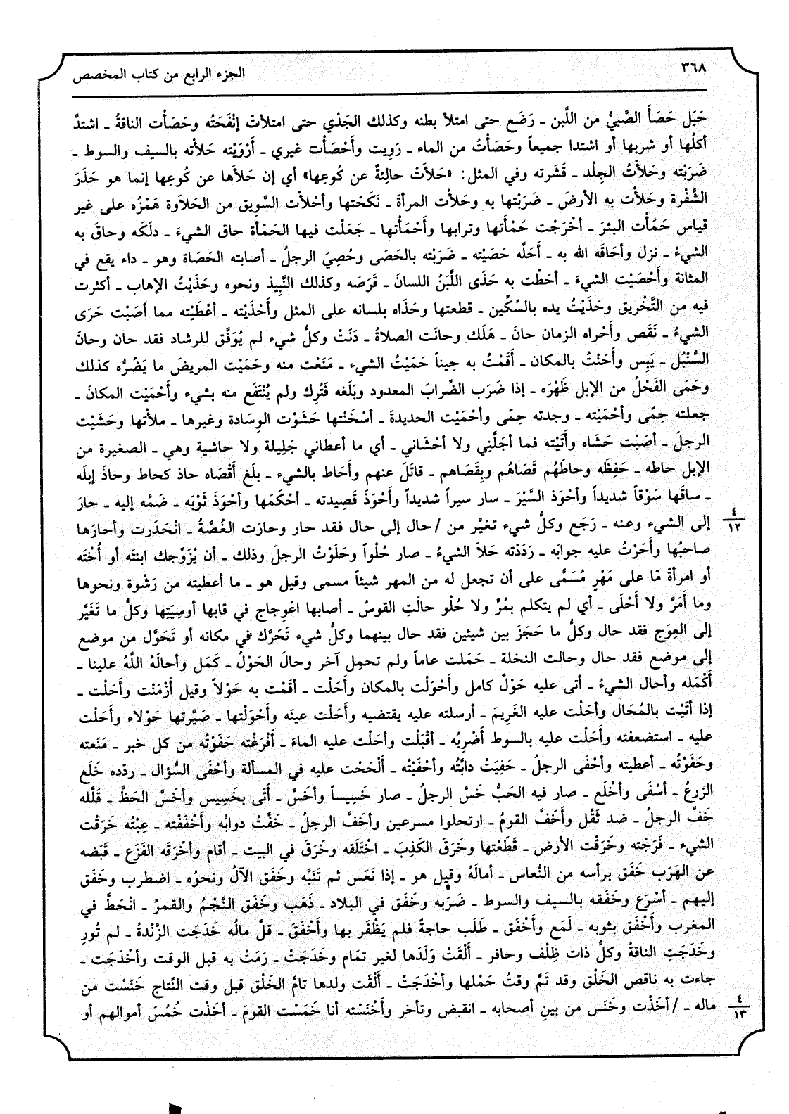 حَبَل. حَصَأَ الصبيُّ من اللبنِ: رَضَعَ حَتَّى امْتَلَأَ بَطْنُه وَكَذَلِكَ الجَدْي حَتَّى امْتَلَأت إنْفَحَتُه وحَصَأَت الناقةُ: اشتدَّ أَكْلُها أَو شربهَا أَو اشتدا جَمِيعًا وحَصَأْتُ من المَاء: رَوِيْت وأَحْصَأْت غَيْرِي: أَرْوَيتُه حلأْته بِالسَّيْفِ وَالسَّوْط: ضَرَبْته وحَلأْتُ الجِلْد: قَشَرْته وَفِي الْمثل: حَلأَتْ حالِئةٌ عَن كُوعِها. أَي إنَّ حَلأْها عَن كوعها إِنَّمَا هُوَ حَذَرَ الشَّفرة وحَلأْت بِهِ الأَرْض: ضَرَبْتها بِهِ وحَلأْت المرأةَ: نَكَحْتها وأَحْلأَْت السَّوِيق من الحَلاوة هَمْزُه على غير قِيَاس حَمَأْت البئرَ: أَخْرَجت حَمْأَتها وترابها وأَحْمَأتها: جَعَلْت فِيهَا الحَمْأَة حاقَ الشيءَ: دَلَكَه وحاقَ بِهِ الشيءُ: نزل وأَحاقَه الله بِهِ: أَحَلَّه. حَصَيْته: ضَرَبْته بالحَصى وحُصِيَ الرجلُ: أَصَابَته الحَصاة وَهُوَ: دَاء يَقع فِي المثانة وأَحْصَيت الشيءَ: أَحَطْت بِهِ حَذَىَ اللبنُ اللسانَ: قَرَصَه وَكَذَلِكَ النَّبِيذ وَنَحْوه وحَذَيْت الإهاب: أكثرت فِيهِ من التخريق وحَذَيْتُ يدَه بالسكِّين: قطعتها وحَذاه بِلِسَانِهِ على الْمثل وأَحْذَيْتُه: أَعْطيته مِمَّا أَصَبْت. حَرَىَ الشيءُ: نَقَصَ وأَحْرَاه الزَّمَان. حانَ: هَلَكَ وحانَت الصلاةُ: دَنَتْ وكلُّ شيءٍ لم يُوَفَّق للرشاد فقد حَان وحانَ السُّنْبُل: يَبِسَ وأَحَنْتُ بِالْمَكَانِ: أَقَمْتُ بِهِ حِيناً. حَمَيْتُ الشيءَ: مَنَعْت مِنْهُ وحَمَيْت المريضَ مَا يضُرُّه كَذَلِك وحَمَى الفحلُ من الْإِبِل ظَهْرَه: إِذا ضَرَبَ الضِّرابَ الْمَعْدُود وبَلَغه فتُرِك وَلم يُنتَفَع مِنْهُ بِشَيْء وأَحْمَيت المكانَ: جعلته حِمىً وأَحْمَيته: وجدتُه حِمىً وأَحْمَيت الحَديدةَ: أَسْخَنتها. حَشَوْت الوِسادةَ وَغَيرهَا: ملأْتها وحَشَيْت الرجلَ: أَصَبْت حَشاه وأَتَيْته فَمَا أجَلَّني وَلَا أَحْشَاني: أَي مَا أَعْطَانِي جَليلة وَلَا حَاشِيَة وَهِي: الصَّغِيرَة من الْإِبِل. حاطه: حَفِظَه وحاطَهُم قَصاهُم وبِقَصاهم: قاتَل عَنْهُم وأحاطَ بالشَّيْء: بلغَ أَقْصَاه. حاذَ كحاط وحاذَ إبلَه: ساقَها سَوْقَاً شَدِيدا وأَحْوَذ السَّيْرَ: سَار سيراً شَدِيدا وأَحْوَذَ قصيدَته: أَحْكَمَها وأَحْوَذَ ثَوْبَه: ضَمه إِلَيْهِ. حارَ إِلَى الشَّيْء وَعنهُ: رَجَعَ وكلُّ شيءٍ تغير من حَال إِلَى حَال فقد حَار وحارَت الغُصَّةُ: انْحَدَرَت وأحارَها صاحبُها وأَحَرْتُ عَلَيْهِ جوابَه: رَدَدْته. حَلا الشيءُ: صَار حُلْواً وحَلَوْتُ الرجلَ: وَذَلِكَ أَن يُزَوِّجك ابْنَتَه أَو أُخْتَه أَو امْرَأَة مَا على مَهْرٍ مُسَمَّى على أَن تجْعَل لَهُ من الْمهْر شَيْئا مسمَّى وَقيل هُوَ: مَا أَعْطيته من رَشْوَةٍ وَنَحْوهَا وَمَا أمرَّ وَلَا أَحْلَى: أَي لم يتَكَلَّم بمُرٍّ وَلَا حُلْو. حالَتِ القوسُ: أَصَابَهَا اعوجاج فِي قابها أَو سِيَتِها وكلُّ مَا تغيَّر إِلَى العِوَج فقد حَال وكلُّ مَا حَجَزَ بَين شَيْئَيْنِ فقد حَال بَينهمَا وكلُّ شيءٍ تحرَّك فِي مَكَانَهُ أَو تحوَّل من مَوضِع إِلَى مَوضِع فقد حَال وحالت النَّخْلَة: حَمَلَت عَاما وَلم تَحْمِل آخر وحالَ الحَوْلُ: كَمَلَ وأحلَهُ اللهُ علينا: أَكْمَله وأحالَ الشيءُ: أَتَى عَلَيْهِ حَوْلٌ كَامِل وأَحْوَلْت بِالْمَكَانِ وأَحَلْت: أَقَمْت بِهِ حَوْلاً وَقيل أَزْمَنْت وأَحَلْت: إِذا أَتَيْت بالمُحال وأَحَلْت عَلَيْهِ الغَريم: أَرْسلتهُ عَلَيْهِ يَقْتَضِيهِ وأَحَلْت عَلَيْهِ بِالسَّوْطِ أَضْرِبهُ: أَقْبَلْت وأَحَلْت عَلَيْهِ الماءَ: أَفْرَغتُه. حَفَوْتهُ من كل خير: منعته وحَفَوْتُه: أَعْطيته وأَحْفَى الرجلُ: حَفِيَتْ دابَّتُه وأَحْفَيتُه: أَلْحَحتُ عَلَيْهِ فِي المسئلة وأَحْفَى السُّؤَال: ردّده. خَلَعَ الزرعُ: أَسْقَى وأَخْلَع: صَار فِيهِ الحَبُّ. خَسَّ الرجلُ: صَار خَسيساً وأَخَسَّ: أَتَى بخَسيس وأَحَسَّ الخَطَّ: قلَّله. خَفَّ الرجلُ: ضد ثقُل وأَخَف