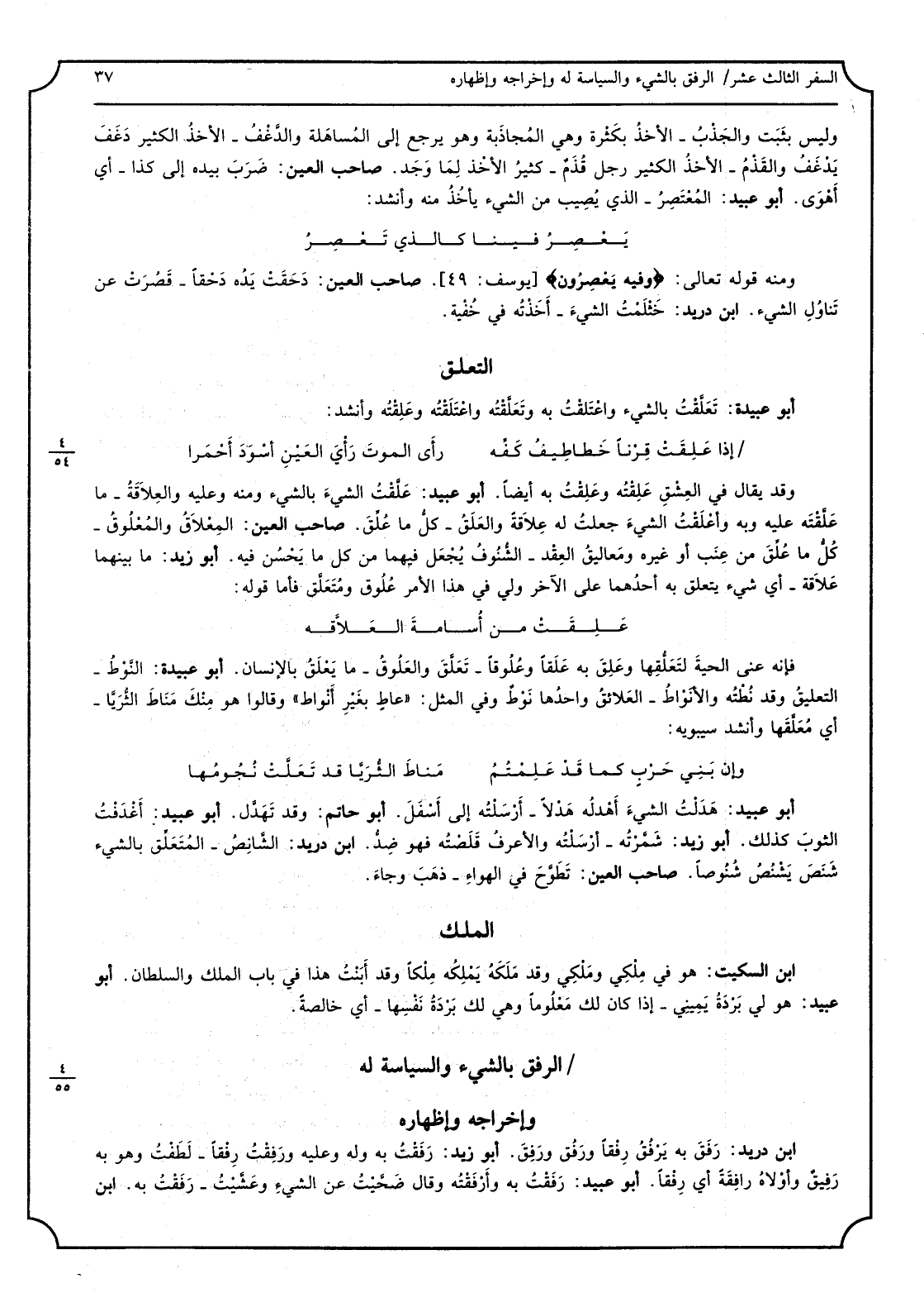 أَبُو عُبَيْدة: تعلَّقت بالشّيء واعْتَلَقْت بِهِ وتَعَلَّقْته واعْتَلَقْته وعَلِقْته، وَأنْشد: إِذا عَلِقَت قِرْناً خطاطيفُ كفّه رأى الْمَوْت رَأْي العينِ أسودَ أحمرا وَقد يُقَال فِي الْعِشْق عَلِقته وعَلِقت بِهِ أَيْضا. أَبُو عُبَيْد: عَلَّقْت الشّيء بالشّيء وَمِنْه وَعَلِيهِ، والعِلاقة: مَا عَلَّقْته عَلَيْهِ وَبِه وأعلقت الشّيء جعلت لَهُ عِلاقة، والعَلَق: كل مَا عُلِّق. صَاحب الْعين: صَاحب الْعين: المِعْلاق والمُعْلوق: كل مَا عُلق من عِنَب أَو غَيره، ومَعاليق العقد: الشّنوف يُجعل فِيهَا من كل مَا يحسن فِيهِ. أَبُو زيد: مَا بَينهمَا عَلاقة: أَي شَيْء يتَعَلَّق بِهِ أَحدهمَا على الآخر ولي فِي هَذَا الْأَمر عُلوق ومُتَعَلَّق، فَأَما قَوْله: عَلِقَتْ من أسامةَ العَلاَّقَه فَإِنَّهُ عَنى الحيّة لتعلقها، وعَلِق بِهِ عَلَقاً وعُلوقاً: تعلّق، والعَلوق: مَا يَعْلُق بالإنسان. أَبُو عُبَيْدة: النّوْط: التّعليق، وَقد نُطُّته، والأنواط: العلائق، وَاحِدهَا نَوْط، وَفِي المثَل: عاطٍ بِغَيْر أنواط. وَقَالُوا هُوَ مِنْك مَناط الثّرَيَّا: أَي مُعَلَّقُها، وَأنْشد سِيبَوَيْهٍ: وَإِن بَني حَرْبٍ كَمَا قد عَلِمْتُم مَناطَ الثُّريَّا قد تَعَلَّتْ نُجومُها أَبُو عُبَيْد: هَدَلْت الشّيء أهدِله هدلاً: أَرْسلتهُ إِلَى أَسْفَل. أَبُو حَاتِم: وَقد تهَّدل. أَبُو عُبَيْد: أغْدَفْت الثّوب كَذَلِك. أَبُو زيد: شَمَّرْته: أَرْسلتهُ، والأعرف قَلَصْته فَهُوَ ضِد. ابْن دُرَيْد: الشّانِص: الْمُتَعَلّق بالشّيء، شَنَص يشنُص شُنوصاً. صَاحب الْعين: تَطَوَّح فِي الْهَوَاء: ذهب وَجَاء.