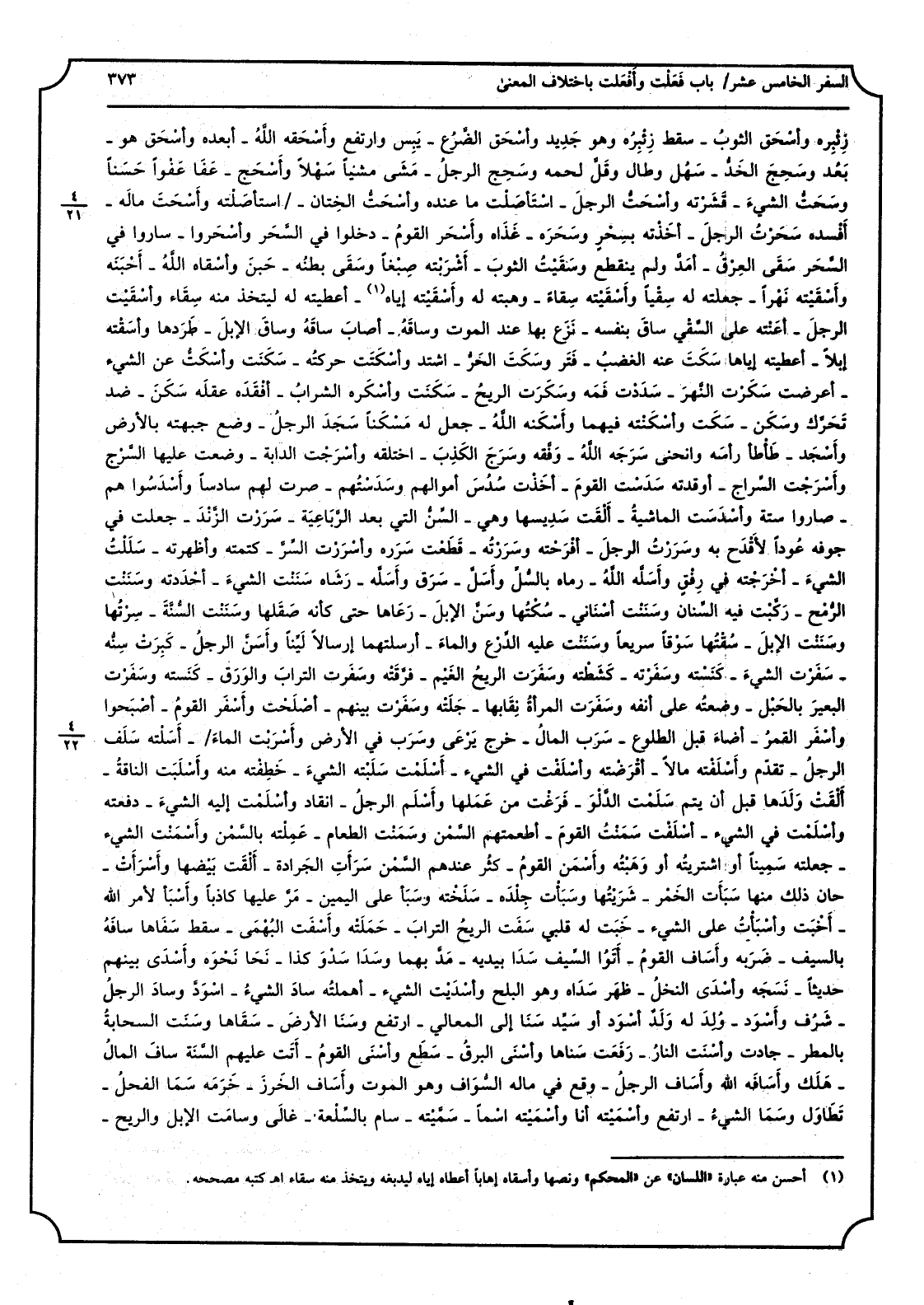 زِئْبِره وأَسْحَق الثوبُ: سقط زِئْبِره وَهُوَ جَديد وأَسْحَق الضَّرْع: يَبِسَ وارتفع وأَسْحَقَه اللهُ: أبعده وأَسْحَق هُوَ: بعُد وسَحِجَ الخَدُّ: سَهُل وَطَالَ وقلَّ لَحْمه وسَحِجَ الرجلُ: مَشى مَشْيَاً سَهْلاًَ وأَسْحَج: عَفا عَفْوَاً حَسَنَاً وسَحَتُّ الشيءَ: قَشَرْته وأَسْحَتُّ الرجلَ: استَأْصَلت مَا عِنْده وأَسْحَتُّ الخِتان: استَأْصَلته وأَسْحَتَ مالَه: أَفْسَده. سَحَرْت الرجلَ: أَخَذْته بِسِحْرٍ وسَحَرَه: غَذاه وأَسْحَر القومُ: دخلُوا فِي السَّحَر وأَسْحَروا: سَارُوا فِي السَّحَر. سَقَىَ العِرْقُ: أمَدَّ وَلم يَنْقَطِع وسَقَيْتُ الثوبَ: أَشْرَبْته صِبْغاً وسَقَىَ بطنُه: حَبِنَ. وأَسْقَاه اللهُ: أَحْبَنَه وأَسْقَيْته نَهْرَاً: جعلت لَهُ سِقْيا وأَسْقَيْته سِقاءً: وهبته لَهُ وأَسْقَيْته إِيَّاه: أَعْطيته لَهُ ليتَّخذ مِنْهُ سِقاء وأَسْقَيْت الرجلَ: أَعَنْته على السَّقْي. ساقَ بِنَفسِهِ: نَزَعَ بهَا عِنْد الْمَوْت وساقَهُ: أصابَ ساقَهُ وساقَ الإبلَ: طَرَدَها وأَسَقْته إبِلا: أَعْطيته إِيَّاهَا. سَكَتَ عَنهُ الغضبُ: فَتَرَ وسَكَتَ الحرُّ: اشتدَّ وأَسْكَتَت حركتُه: سَكَنَت وأسْكَتُّ عَن الشَّيْء: أَعرَضت. سَكَرْت النهرَ: سَدَدْت فَمَه وسَكَرَت الريحُ: سَكَنَت وأَسْكَرَه الشرابُ: أَفْقَدَه عقلَه. سَكَنَ: ضد تحرَّك وسَكَنَ: سَكَتَ وأَسْكَنتُه فيهمَا. وأَسْكَنَه اللهُ: جعل لَهُ مَسْكَناً. سَجَدَ الرجلُ: وضع جَبهته بِالْأَرْضِ وأَسْجَد: طَأْطَأ رأسَه وانحنى. سَرَجَه اللهُ: وفَّقَه وسَرَجَ الكذبَ: اختلفه وأَسْرَجْت الدَّابَّة: وضعت عَلَيْهَا السَّرْج، وأَسْرَجْت السِّراج: أوقدته. سَدَسْت القومَ: أخذتُ سُدُسَ أَمْوَالهم وسَدَسْتهم: صرت لَهُم سادساً وأَسْدَسوا هم: صَارُوا سِتَّة وأَسْدَسَت الماشيةُ: أَلْقَت سَديسَها وَهِي: السِّنُّ الَّتِي بعد الرَّباعِيَّة. سَرَرْت الزَّنْدَ: جعلت فِي جَوْفه عُوداً لأَقْدَح بِهِ وسَرَرْت الرجلَ: أَفْرَحْته وسَرَرْته: قَطَعْت سَرَره وأَسْرَرْت السِّرَّ: كتمته وأظهرته. سلَلْت الشيءَ: أَخْرَجْتُه فِي رِفْق وأَسَلَّه اللهُ: رَمَاه بالسُّلّ وأَسَلَّ: سَرَقَ وأَسَلَّه: رَشاه. سَنَنْت الشيءَ: أَحْدَدته وسَنَنْت الرمحَ: ركَّبْت فِيهِ السِّنان وسَنَنْت أَسْنَاني: سُكْتُها وسَنَّ الإبلَ: رَعاها حَتَّى كَأَنَّهُ صَقَلَها وسَنَنْت السُّنَّة: سِرْتُها وسَنَنْت الإبلَ: سُقْتُها سَوْقَاً سَرِيعا وسَنَنْت عَلَيْهِ الدِّرْع والماءَ: أرسلتهما إرْسَالًا ليِّناً وأَسَنَّ الرجلُ: كَبِرَتْ سِنُّه. سَفَرْت الشيءَ: كَنَسْته وسَفَرْته: كَشَطْته وسَفَرَت الريحُ الغيْمَ: فرَّقَتْه وسَفَرْت الترابَ والورقَ: كَنَسْته وسَفَرْت البعيرَ بالحبل: وضعتُه على أَنفه وسَفَرَت المرأةُ نِقابَها: جَلَتْه وسَفَرْت بَينهم: أَصْلَحتُ وأَسْفَر القومُ: أَصْبَحوا وأَسْفَر القمرُ: أضاءَ قبل الطُّلُوع. سَرَبَ المالُ: خرج يَرْعَى وسَرَبَ فِي الأَرْض وأَسَرْبت الماءَ: أَسَلْته. سَلَفَ الرجلُ: تقدّم وأَسْلَفتُه مَالا: أَقْرَضتُه وأَسْلَفت فِي الشَّيْء: أَسْلَمت. سَلَبْته الشيءَ: خَطِفْته مِنْهُ وأَسْلَبَت الناقةُ: أَلْقَتْ وَلَدَها قبل أَن يتم. سَلَمْت الدلوَ: فَرَغْت من عَملهَا وأَسْلَم الرجلُ: انْقَادَ وأَسْلَمتُ إِلَيْهِ الشيءَ: دَفعته وَأسْلمت فِي الشَّيْء: أَسْلَفت. سَمَنْتُ القومَ: أطعمتهم السَّمْت وسَمَنْت الطَّعَام: عَمِلْته بالسَّمْن وأَسْمَنتُ الشيءَ: جعلته سميناً أَو اشْتَرَيْته أَو وَهَبْتُه وأَسْمَن القومُ: كثُر عِنْدهم السَّمْن. سَرَأَتِ الجرادة: أَلْقَت بَيْضَها وأَسْرَأتْ: حَان ذَلِك مِنْهَا. سَبَأْت الْخمر: شَرَيْتُها وسَبَأْت جِلْده: سَلَخْته وسَبَأَ على الْيَمين: مرَّ نَحْوَه وأَسْدَى بَينهم حَدِيثا: نَسَجَه وأَسْدَى النخلُ: ظهر سَدَاَه وَهُوَ البلح وأَسْدَيْت الشَّيْء: أهملتُه. سادَ الشيءُ: اسودَّ وسادَ 
