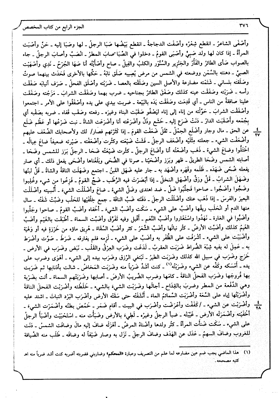 وأَصْفَى الشاعرُ: انْقَطع شِعْرُه وأَصْفَت الدجاجةُ: انْقَطع بَيْضُها. صَبا الرجلُ: لَهَا وصَبا إِلَيْهِ: حنَّ وأَصْبَت المرأةُ: إِذا كَانَ لَهَا ولد صبيٌّ. وأَصْبَى القومُ: دخلُوا فِي الصَّبا. صابَ المطرُ: انْصَبّ، َ وأصابَ الرجلُ: جَاءَ بِالصَّوَابِ. صَأَى الطائرُ والفَأْرُ والخِنزير والسِّنَّوْر والكلبُ والفيلُ: صَاح وأَصْأَيْته أَنا. صَها الجرحُ: نَدِيَ وأَصْهَيْت الصبيَّ: دهنته بالسَّمْن وَوَضَعته فِي الشَّمْس من مرض يُصيبه. صَلَقَ نابَه: حكَّها بِالْأُخْرَى فحدثَ بَينهمَا صوتٌ وصَلَقَته بلساني: شَتَمْته مضارعة وَالْأَصْل السِّين وصَلَقْته بالعصا: ضَرَبْته وأَصْلَق الفحلُ: صَرَفَ أنيابَه. صَفَقْت رَأسه: ضَرَبْته وصَفَقْت عينه كَذَلِك وصَفَقَ الطائرُ بجناحيه: ضرب بهما وصَفَقْت الشرابَ: مَزَجْته وصَفَقَت علينا صافِقةٌ من النَّاس: أَي قَدِمَت وصَفَقْت يدَه بالبيعة: ضربت بيَدي على يَده وأَصْفَقوا على الْأَمر: اجْتَمعُوا وأَصْفَقتُ الشرابَ: حوَّلْته من إِنَاء إِلَى إِنَاء ليَصْفو. صَقَبْت البناءَ وغيرَه: رفعته وصَقَبَ قَفاه: ضربه بصَقْبِه أَي بجُمْعه وأَصْقَبَت الدارُ: دَنَتْ. ضَرَعَ إِلَيْهِ: خَشَعَ وذلَّ وأَضْرَعْته أَنا وأَضْرَعَت الشاةُ: نبت ضَرْعُها أَو عَظُم. ضَلَعَ عَن الْحق: مَال وجار. وأَضْلَع الحِملُ: ثَقُل. ضَعَفْت القومَ: إِذا كَثَرْتهم فَصَارَ لَك ولأصحابك الضِّعْفُ عَلَيْهِم وأَضْعَفْت الشَّيْء: جعلته مِثْلَيْه وأَضْعَفَ الرجلُ: فَشَتْ ضَيْعَته وكثُرت وأَضْعَفْته: صيَّرته ضَعِيفا. ضاعَ عِيالُه: اختلُّوا وضاعَ الشيءُ: ذهبَ وأَضْعَتُه أَنا وأضاعَ الرجلُ: كثُرت ضَيْعَتُه. ضَحا الرجلُ: برزَ للشمس وضَحا: أَصَابَته الشَّمْس وضَحا الطريقُ: ظهر وبرز وأَضْحَيْنا: صِرنا فِي الضُّحى وبَلَغْناها وأَضْحَى يفعل ذَلِك: أَي صَار يَفْعَله ضُحى. ضَهَدَه: ظَلَمَه وقَهَرَه وأَضْهَد بِهِ: جَار عَلَيْهِ. ضَهَلَ اللبنُ: اجْتمع وضَهَلَت الناقةُ والشاةُ: قلَّ لبنُها وضَهَلَ الشرابُ: قلَّ ورَقَّ وأَضْهَل النخلُ: إِذا أَبْصَرتَ فِيهِ الرُّطَب. ضَجَّ القومُ: فزِعوا من شَيْء وغُلِبوا وضَجُّوا وأضَجُّوا: صاحوا فجَلَّبوا. ضَلَّ: ضد اهْتَدَى وضلَّ الشيءُ: ضاعَ وأَضْلَلتُ الرجلَ: دَفَنْته. ضَبَّ الناقةَ: جمع خِلْفَيْها للحَلْب وضَبَّتْ شَفَتُه: سَالَ مِنْهَا الدَّم أَو انحلَبَ ريقُها وأَضَبَّ على الشَّيْء: سكتَ وأضَبَّ الشيءَ: أخفاه وأَضَبَّ القومُ: صاحوا وجلَّبوا وأَضبُّوا فِي الْغَارة: نَهَدوا واسْتَغاروا وأضَبَّ النَّعَم: أَقْبَل وَفِيه تفرُّق وأضَبَّت السماءُ: أَطْبَقَت بالغَيْم وأضبَّ الغيمُ كَذَلِك وأَضبَّت الأرضُ: كثُر نباتُها وأضبَّ الشَّعَرُ: كثر وأضَبَّ السِّقاءُ: هُرِيق مَاؤُهُ من خَرْزَةٍ فِيهِ أَو وَهْيَة وأَضْبَبْت على الشَّيْء: أَشَرْفت على الظَّفَر بِهِ وأضَبَّ على الشَّيْء: لَزِمَه فَلم يُفَارِقهُ: ضَرَطَ: صوَّتَ وأَضْرَط بِهِ: عَمِلَ لَهُ بِفِيهِ شِبْهَ الضُّراط. ضَرَبَت العقربُ: لَدَغَت وضَرَبَ العِرقُ والقلبُ: نَبَضَ وضَرَبَ فِي الأَرْض: خرجَ وضَرَبَ فِي سَبِيل الله كَذَلِك وضَرَبَت الطيرُ: تَبْتَغي الرِّزْق وضَرَبَ بِيَدِهِ إِلَى الشَّيْء: أَهْوَى وضَرَبَ على يَده: أَمْسَكه وكفَّه عَن الشَّيْء وضَرَبْتُه: كنت أشدَّ ضَرْبَاً مِنْهُ وضَرَبَت المخاضُ: شالت بأذنابها ثمَّ ضَرَبَت بهَا فُروجَها وضَرَبَ الفحلُ الناقةَ: كامَها وضربَ الضَّريبُ الأَرْض: أَصَابَهَا وضَرَبَتهم السماءُ: أَتَتْ بضربة وَهِي الدَّفْعة من الْمَطَر وضَرَبَ بالقِداح: أجالَها وضَرَبْت الشيءَ بالشَّيْء: خَلَطْته وأَضْرَبْت الفحلَ الناقةَ وأَضْرَبْتُها إِيَّاه على السَّعَة وأَضْرَبَت السَّمائمُ الماءَ: أَنْشَفَتْه حَتَّى سَقَتْه الأَرْض وأَضْرَب البَرْد النباتَ: اشْتَدَّ عَلَيْهِ وأَضْرَبت عَن الشَّيْء: كَفَفْت وأَعْرَضْت وأَضْرَب فِي الْبَ