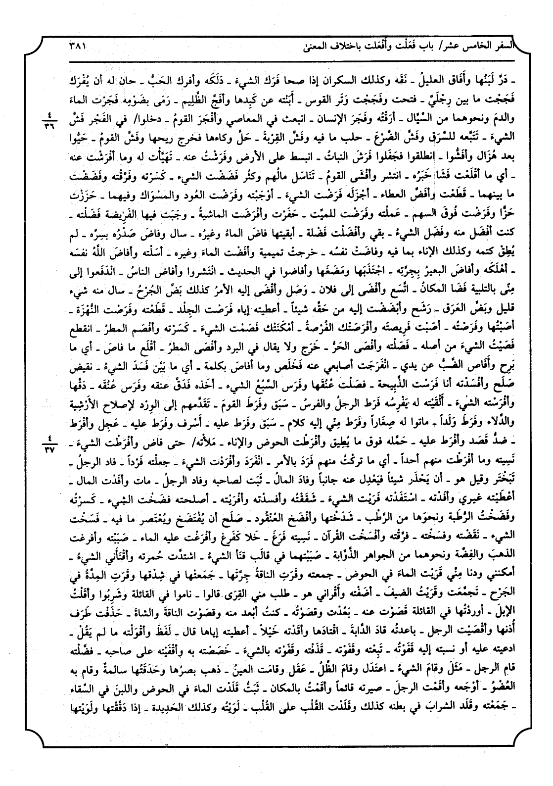 درَّ لبَنُها وأفاقَ العليلُ: نَقَهَ وَكَذَلِكَ السَّكْرَان إِذا صَحا. فَرَكَ الشيءَ: دَلَكَه وأَفْرَك الحبُّ: حَان لَهُ أَن يُفْرَك. فَجَجْت مَا بَين رِجْلَيَّ: فتحت وفَجَجْت وَتَرَ الْقوس: أَبَنْته عَن كبِدِها وأفجَّ الظِّلِيم: رَمى بصوْمِه. فَجَرْت الماءَ والدمَ ونحوَهما من السُّيَّال: أَرَقْته وفَجَرَ الْإِنْسَان: انْبَعَثَ فِي الْمعاصِي وأَفْجَر القومُ: دخلُوا فِي الفَجْر. فش الشيءَ: تتَبَّعه للسَّرَق وفَشَّ الضَّرْعَ: حلب مَا فِيهِ وفَشَّ القِرْبةَ: حلَّ وِكاءَها فَخرج ريحُها وفشَّ القومُ: حَيُّوا بعد هُزال وأفَشُّوا: انْطَلقُوا فَجَفَلوا. فَرَشَ النباتُ: انْبَسَط على الأَرْض وفَرَشْت عَنهُ: تَهَيَّأْت لَهُ وَمَا أَفْرَشْت عَنهُ: أَي مَا أَقْلَعْت. فَشا خبَرُه: انْتَشَر وأَفْشَى القومُ: تَناسَل مالُهم وكثُر. فَضَضْت الشَّيْء: كَسَرْته وفرَّقته وفَضَضْت مَا بَينهمَا: قَطَعْت وأَفَضَّ الْعَطاء: أَجْزَلَه. فَرَضْت الشيءَ: أَوْجَبْته وفَرَضْت العُود والمِسْواك وَفِيهِمَا: حَزَزْت حزَّاً وفَرَضْت فُوقَ السهْم: عَمِلْته وفَرَضْت للميِّت: حَفَرْت وأَفْرَضَت الماشيةُ: وَجَبَت فِيهَا الْفَرِيضَة. فَضَلْته: كنت أَفْضَل مِنْهُ وأَفْضَل الشيءُ: بَقِيَ وأَفْضَلْت فَضْلَة: أبقيتها. فاضَ الماءُ وغيرُه: سالَ وفاضَ صَدْرُه بسِرِّه: لم يُطِق كتمه وَكَذَلِكَ الْإِنَاء بِمَا فِيهِ وفاضَتْ نَفْسُه: خرجت تميمية وأَفَضْت الماءَ وغيرَه: أَسَلْته وأفاضَ اللهُ نَفْسَه: أَهْلَكَه وأفاضَ البعيرُ بجِرَّتِه: اجْتَذَبَها ومَضَغَها وأفاضوا فِي الحَدِيث: انْتَشَروا وأفاضَ الناسُ: انْدَفَعوا إِلَى مِنىً بِالتَّلْبِيَةِ. فَضا المكانُ: اتَّسَع وأَفْضَى إِلَى فلَان: وَصَلَ وأَفْضَى إِلَيْهِ الأمرُ كَذَلِك. بَضَّ الجُرحُ: سَالَ مِنْهُ شَيْء قَلِيل وبَضَّ العَرَق: رَشَحَ. وأَبْضَضْت إِلَيْهِ من حقِّه شَيْئا: أَعْطَيْته إِيَّاه. فَرَصْت الجِلْد: قَطَعْته وفَرَصْت النُّهْزَة: أَصَبْتها وفَرَصْته: أَصَبْت فَريصتَه وأَفْرَصْتك الفُرْصةُ: أَمْكَنَتْك. فَصَمْت الشيءَ: كَسَرْته وأَفْصَم المطرُ: انْقَطع. فَصَيْت الشيءَ من أَصله: فَصَلْته وأَفْصَى الحَرُّ: خرجَ وَلَا يُقَال فِي الْبرد وأَفْصَى المطرُ: أَقْلَع. مَا فاصَ: أَي مَا بَرِحَ وأفاصَ الضَّبُّ عَن يَدي: انْفرجَتْ أصابعي عَنهُ فَخَلَص. وَمَا أفاصَ بِكَلِمَة: أَي مَا بَيَّن. فَسَدَ الشيءُ: نقيض صَلَحَ وأَفْسَدْته أَنا. فَرَسْت الذَّبيحة: فَصَلْت عُنُقَها وفَرَسَ السَّبُع الشَّيْء: أَخذه فدَقَّ عُنُقه وفَرَسَ عُنُقَه: دَقَّها وأَفْرَسْته الشيءَ: أَلْقَيْته لَهُ يَفْرِسهُ. فَرَطَ الرجلُ والفرسُ: سَبَقَ وفَرَطَ القومَ: تقَدَّمهم إِلَى الوِرْد لإِصْلَاح الأَرْشِية والدِّلاء، وفَرَطَ وَلَدَاً: مَاتُوا لَهُ صِغاراً، وفَرَطَ منِّي إِلَيْهِ كَلَام: سَبَقَ وفَرَطَ عَلَيْهِ: أَسْرَف وفَرَطَ عَلَيْهِ: عَجِلَ وأَفْرَط: ضدُّ قَصَدَ وأَفْرَط عَلَيْهِ: حمَّله فَوق مَا يُطيق وأَفْرَطْت الْحَوْض والإناء: ملأْتُه حَتَّى فاض وأَفْرَطْت الشيءَ: نَسِيْته وَمَا أَفْرَطْت مِنْهُم أحدا: أَي مَا تَرَكْت مِنْهُم. فَرَدَ بِالْأَمر: انْفَرَد وأَفْرَدتُ الشيءَ: جَعَلْته فَرْدَاً. فادَ الرجلُ: تَبَخْتَر وَقيل هُوَ: أَن يَحْذَر شَيْئا فيَعْدِل عَنهُ جانباً وفادَ المالُ: ثَبَتَ لصَاحبه وفاد الرجلُ: مَاتَ وأَفَدْت المالَ: أَعْطَيْته غَيْرِي وأَفَدْته: اسْتَفَدْته. فَرَيْت الشيءَ: شَقَقْته وأَفْسَدْته وأَفْرَيْته: أصلحته. فَضَخْت الشَّيْء: كَسَرْته وفَضَخْت الرُّطَبة ونحوَها من الرَّطْب: شَدَخْتها وأَفْضَخ العُنْقود: صَلَحَ أَن يُفْتَضَخ ويُعتصَر مَا فِيهِ. فَسَخْت الشَّيْء: نَقَضْته وفَسَخْته: فرَّقْته وأَفْسَخْت القُرآن: نَسِيْته. فَرَغَ: خَلا كفَرِغ وأَفْرَغْت عَلَيْهِ المَاء: صَبَبْته وأَفْرَغت الذهبَ والفِضَّة وَنَحْوه