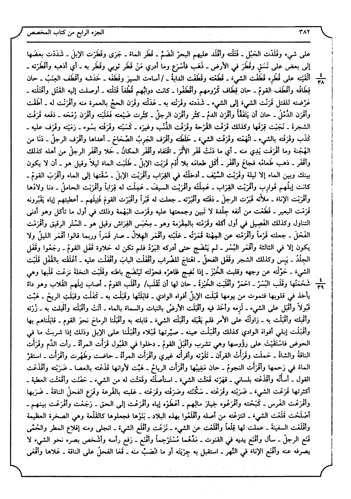 على شَيْء وقلدت الْحَبل فتلته وأَقْلَد عَلَيْهِم البحرُ: انْضَمَّ. قَطَرَ الماءُ: جَرَىَ وقَطَرْت الإبلَ: شَدَدْت بعضَها إِلَى بعض على نَسَقٍ وقَطَرَ فِي الأَرْض: ذهبَ فَأَسْرع وَمَا أَدْرِي مَنْ قَطَرَ ثوبي وقَطَرَ بِهِ: أَي أَذْهَبَه وأَقْطَرْته: أَلْقَيْته على قُطْرِه. قَطَفْت الشيءَ: قَطَعْته وقَطَفَت الدابةُ: أساءت السيرَ. وقَطَفَه: خَدَشَه، وأَقطَفَ العنَبُ: حَان قطافه، وأقْطَفَ القومُ: حَان قطاف كرومهم، وأقطَفوا: كَانَت دوابُّهم قُطُفاً، قتَلْته: أوصلت إِلَيْهِ الْقَتْل، وأقْتَلْه: عرَّضته للْقَتْل، قَرَنْت الشيءَ إِلَى الشَّيْء: شدَدته، وقَرَنْته بِهِ: عَدَلْته، وَقرن الحجَّ بِالْعُمْرَةِ مِنْهُ، وأقْرَنْت لَهُ: أطَفت، وأقْرَن الدُّمّلُ: حَان أَن يتفَقَّأَ، وأقْرَن الدمُ: كثُر، وأقرَن الرجل: كثُرت ضيعته فغلبته، وأقرَن رُمْحَه: دَفَعه، قَرَفْت الشَّجَرَة: نَجَبْت قِرْفَها وَكَذَلِكَ قَرَفْت القُرْحَة، وقَرَفْت الذَّنْب وَغَيره: كَسَبْته، وقَرَفْته بسوءٍ: رَمَيْته، وقَرَفَ عَلَيْهِ: كَذَب، وقَرَفْته بالشَّيْء: اتَّهَمْته، وقَرَفت الشيءَ: خَلَطْته، وأقْرَف الجَرِبُ الصِّحاحَ: أعداها، وأقرَفَ الرجل: دَنا من الهُجْنة، وَمَا أقْرَفَت يَدي مِنْهُ: أَي مَا دنَت، قَفَرَ الأَثَرَ: اقتفاه، وأقْفَرَ المكانُ: خَلا، وأقْفَرَ الرجل من أَهله كَذَلِك، وأقْفَرَ: ذَهَبَ طَعَامه فجاعَ، وأقْفَرَ: أكَلَ طَعَامه بِلَا أُدْمٍ، قَرَبَت الْإِبِل: طلبت الماءَ لَيْلًا وَقيل هُوَ: أَن لَا يكون بَيْنك وَبَين المَاء إلاّ لَيْلَة، وقَرَبْت السَّيْف: أدخلته فِي القِراب، وأقْرَبْت الْإِبِل: سُقْتها إِلَى المَاء، وأقرَبَ القومُ: كَانَت إبلهم قوارِب، وأقرَبْت القِراب: عمِلْته، وأقْرَبْت السَّيف: عمِلْت لَهُ قِراباً، وأقْرَبَت الحاملُ: دنا وِلادُها، وأقْرَبْت الْإِنَاء: ملأتُه، قَبَرْت الرجل: دَفَنْته، وأقْبَرْته: جعلت لَهُ قَبْراً، وأقْبَرْت القومَ قتيلهم: أَعطيتهم إِيَّاه يَقبرونه، قَرَمْت الْبَعِير: قطعت من أَنفه جِلدةً لَا تَبين وجمعتها عَلَيْهِ، وقَرَمت البَهْمة وَذَلِكَ فِي أول مَا تَأْكُل وَهُوَ أدنى التَّنَاوُل، وَكَذَلِكَ الفصيل فِي أول أكله، وقَرَمْته بالمِقْرَمة وَهُوَ: مِحْبَس الفِراش وَقيل هُوَ: السِّتْر الرَّقِيق، وأقْرَمْت الفَحْلَ: جعلته قَرْماً وأقْرَمْته عَن المِهنة، قَمَرْته: غَلَبْته، وأَقْمَرَ الْهلَال: صَار قمراً وَرُبمَا قَالُوا أقمر اللَّيْل وَلَا يكون إِلَّا فِي الثَّالِثَة، وأقمر البُسْرُ: لم يَنْضَج حَتَّى أدرَكه البَرْدُ فَلم تكن لَهُ حلاوة، قَفَلَ القومُ: رجعُوا، وقَفَلَ الجِلْدُ: يَبِسَ وَكَذَلِكَ الشّجر، وقَفَل الْفَحْل: اهتاجَ للضِّراب، وأقفلْت الْبَاب وأقفلْت عَلَيْهِ: أغلقته بالقفل، قَلَبْت الشيءَ: حوَّلته عَن وَجهه، وقلبت الخُبْزَ: إِذا نضِجَ ظَاهره فحوَّلته ليَنضج بَاطِنه، وقلَبْت النَّخلة: نَزَعْت قَلبهَا وَهِي شَحمتها، وقَلَبَ البُسْرُ: احمَرَّ، وأقْلَبَت الخُبْزَةُ: حَان لَهَا أَن تُقْلَب، وأقْلَبَ القومُ: أصَاب إبلهم القُلابُ وَهُوَ داءٌ يَأْخُذ فِي قلوبها فتموت من يَوْمهَا، قَبَلَت الْإِبِل أَفْوَاه الْوَادي: قابَلَتها، وقَبَلْت بِهِ: كَفَلْت، وقَبَلَت الرّيح: هبَّت قُبولاً، وأقبَلَ على الشَّيْء: لَزِمَه وَأخذ فِيهِ، وأقبلَت الأرضُ بالنَّبات وَالسَّمَاء بِالْمَاءِ: أَتَتْ، وأقْبَلْته وأقْبلت بِهِ: زُرْته، وأقبَلْته وأقبَلْت بِهِ: زاولْتُه على الْأَمر فَلم يقبله، وأقبَلْته الشيءَ: قابلته بِهِ، وأقبلنا الرِّماحَ نَحْو الْقَوْم: قابلناهم بهَا وأقبلْت إبلي أفواهَ الْوَادي كَذَلِك، وأقْبَلْت عينه: صيَّرْتها قَبْلاء وأقبلنا على الْإِبِل وَذَلِكَ إِذا شربتْ مَا فِي الْحَوْض فاستقيْتَ على رؤُوسِها وَهِي تشرب، وأقبَلَ القومُ: دخلُوا فِي القَبول، قَرَأَت المرأَةُ: رَأَتْ الدَّمَ، وقَرَأَ