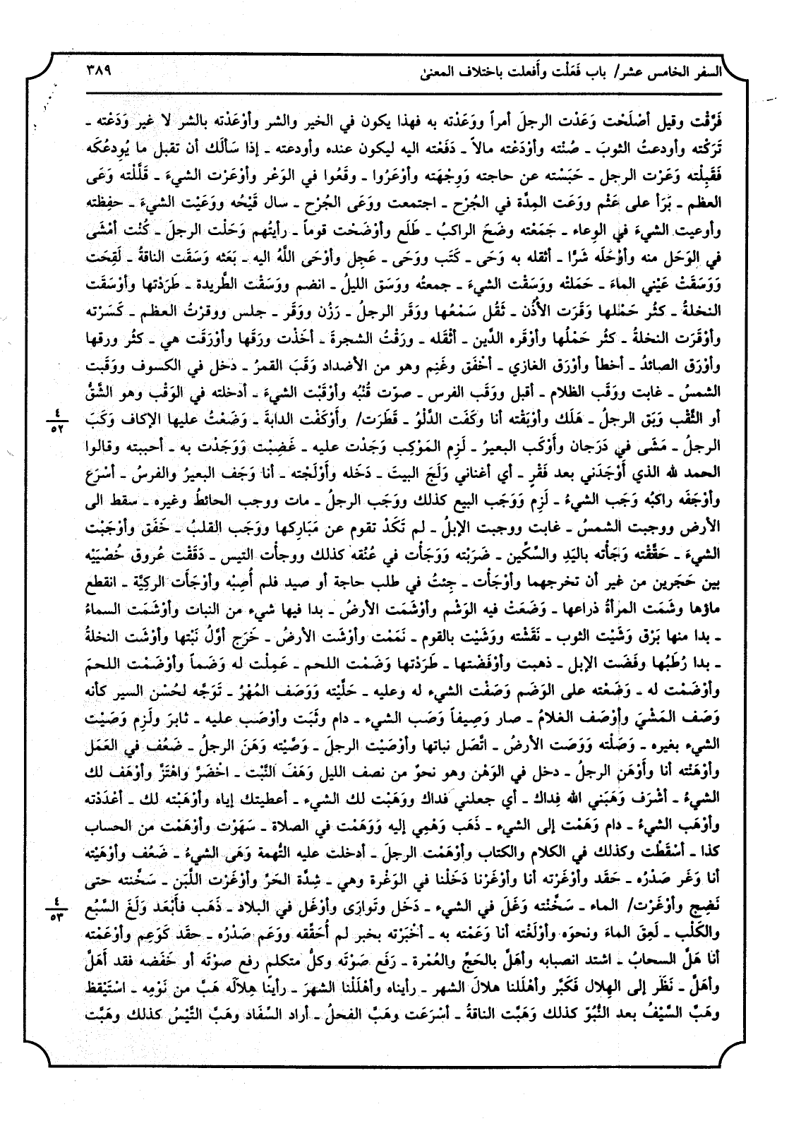 فرَّقْت وَقيل أَصْلَحت وَعَدْت الرجلَ أمرا ووَعَدْته بِهِ فَهَذَا يكون فِي الْخَيْر وَالشَّر وأَوْعَدته بِالشَّرِّ لَا غير. وَدَعْته: تَرَكْته وأَوْدَعت الثوبَ: صُنْته وأودعته مَالا: دَفَعْته إِلَيْهِ ليَكُون عِنْده وأَوْدَعته: إِذا سَأَلَك أَن تقبل مَا يُودِعُكَه فقَبِلْتَه. وَعَرْت الرجلَ: حَبَسْته عَن حَاجته ووِجْهَتَه وأَوْعَروا: وَقَعُوا فِي الوَعْر وأَوْعَرتُ الشيءَ: قلَّلْته. وَعَىَ العَظْمُ: بَرَأَ على عَثْم ووَعَتْ المِدَّة فِي الْجرْح: اجْتمعت ووَعَى الجُرح: سَالَ قَيْحُه ووَعَيْت الشيءَ: حَفِظْته وأَوْعَيت الشيءَ فِي الوِعاء: جَمَعْته. وَضَحَ الراكبُ: طَلَعَ وأَوْضَحْت قوما: رأيتُهم. وَحَلْت الرجلَ: كُنت أَمْشَى فِي الوحل مِنْهُ وأَوْحَلَه شرَّاً: أثقله بِهِ. وَحَى: كتب ووَحى: عَجِلَ وأَوْحَى اللهُ إِلَيْهِ: بَعَثَه. وَسَقَت الناقةُ: لَقِحَت ووَسَقْت عَيْني الماءَ: حَمَلَتْه ووَسَقْت الشيءَ: جمعتُه ووسقَ الليلُ: انْضَمَّ ووَسَقْت الطَّريدة: طَرَدْتها وأَوْسَقَت النخلةُ: كثُر حَمْلُها. وَقَرَت الأُذُن: ثقُل سَمْعُها ووَقَرَ الرجلُ: رزُنَ ووَقَرَ: جلس ووَقَرْت الْعظم: كَسَرْته وأَوْقَرَت النخلةُ: كثُر حَمْلُها وأَوْقَره الدَّيْن: أَثْقَله. وَرَقْتُ الشجرةَ: أَخَذْت وَرَقَها وأَوْرَقَت هِيَ: كثُر وَرقهَا وأَوْرَق الصائدُ: أَخطَأ وأَوْرَق الْغَازِي: أَخْفَق وغَنِمَ وَهُوَ من الأضداد. وَقَبَ القمرُ: دخل فِي الْكُسُوف ووَقَبَتْ الشمسُ: غَابَتْ ووَقَبَ الظلامُ: أقبل ووَقَبَ الْفرس: صوَّت قُنْبُه وأَوْقَبْت الشيءَ: أدخلته فِي الوَقْب وَهُوَ الشَّقُّ أَو الثَّقْب. وَبَقَ الرجلُ: هَلَكَ وأَوْبَقْته أَنا. وَكَفَت الدلوُ: قَطَرَت وأَوْكَفْت الدابةَ: وَضَعْت عَلَيْهَا الإكاف. وَكَبَ الرجلُ: مَشى فِي دَرَجان، وأوكَبَ الْبَعِير: لَزِمَ الموكِبَ، وَجَدَت عَلَيْهِ: غَضِبَت، ووَجَدْت بِهِ: أحببته وَقَالُوا الْحَمد لله الَّذِي أوجَدَني بعد فقرٍ أَي أغناني، وَلَجَ الْبَيْت: دخله، وأولجته: أَنا، وَجَفَ الْبَعِير والفرسُ: أسْرع، وأوْجَفَه راكبُه، وجَبَ الشيءُ: لَزِمَ وَوَجَب البيع كَذَلِك، ووَجَبَ الرجل: مَاتَ، ووَجَبَ الْحَائِط وَغَيره: سقط إِلَى الأَرْض، ووَجَبَت الشَّمْس: غَابَتْ، ووَجبَت الْإِبِل: لم تَكَد تقوم عَن مَباركها، ووَجَبَ القلبُ: خَفَقَ، وأوْجَبْت الشيءَ: حقَّقْته، وَجَأْته بِالْيَدِ والسِّكّين: ضَربته، ووَجأْت فِي عُنُقه كَذَلِك، ووَجَأْت التيسَ: دَقَقْت عروقَ خُصْيَيه بَين حجرين من غير أَن تخرجهما، وأوْجَأْت: جِئْت فِي طلب حَاجَة أَو صيد فَلم أُصبه، وأوْجَأَت الرَّكِيَّة: انْقَطع مَاؤُهَا، وَشَمَت الْمَرْأَة ذراعها: وضعت فِيهِ الوشم، وأوْشَمَت الأَرْض: بدا فِيهَا شيءٌ من النَّبَات، وأوْشَمَت السماءُ: بدا مِنْهَا بَرْق، وَشَيْت الثوبَ: نقشْته، ووَشَيْت بالقوم: نَمَمْت، وأوْشَت الأَرْض: خرج أوّل نبتها، وأوْشَت النَّخلة: بدا رُطَبُها، وفَضَت الْإِبِل: ذهبت، وأوْفَضْتها: طَرَدْتها، وَضَمْت اللَّحْم: عمِلْت لَهُ وَضَماً، وأوْضَمْت اللَّحْم وأوْضَمْت لَهُ: وضعْته على الوَضَم، وصَفْت الشيءَ لَهُ وَعَلِيهِ: حلَّيْته، ووَصَف المُهْرُ: توَجَّه لحُسْن السَّير كأنَّه وصَف الْمَشْي، وأوْصَفَ الغلامُ: صَار وصيفاً، وَصَبَ الشَّيْء: دَامَ وَثَبت، وأوْصَبَ عَلَيْهِ: ثابر ولَزِم، وَصَيْت الشيءَ بِغَيْرِهِ: وَصَلْته، ووَصَت الأَرْض: اتَّصل نباتها، وأوْصَيْت الرجل: وصَّيْته، وَهَنَ الرجلُ: ضَعُف فِي الْعَمَل، وأوْهَنْته أَنا وأوْهَن الرجلُ: دخل فِي الوَهْن وَهُوَ نَحْو من نصف اللَّيْل، وَهَفَ النَّبْت: اخضَرَّ واهْتَزَّ، وأوْهَفَ لَك الشيءُ: أشْرَف، وَهَبَني الله فدَاك: أَي جعلَني فِداك، ووَهبْت لَك الشيءَ: أعطيْتك إِيَّاه، وأوْهَبْته لَك: أعْدَدْته، وأوْهَبَ الشيءُ: دَامَ، وَهَمْت إِلَى الشَّيْء: ذهب وهمي إِلَيْهِ، 