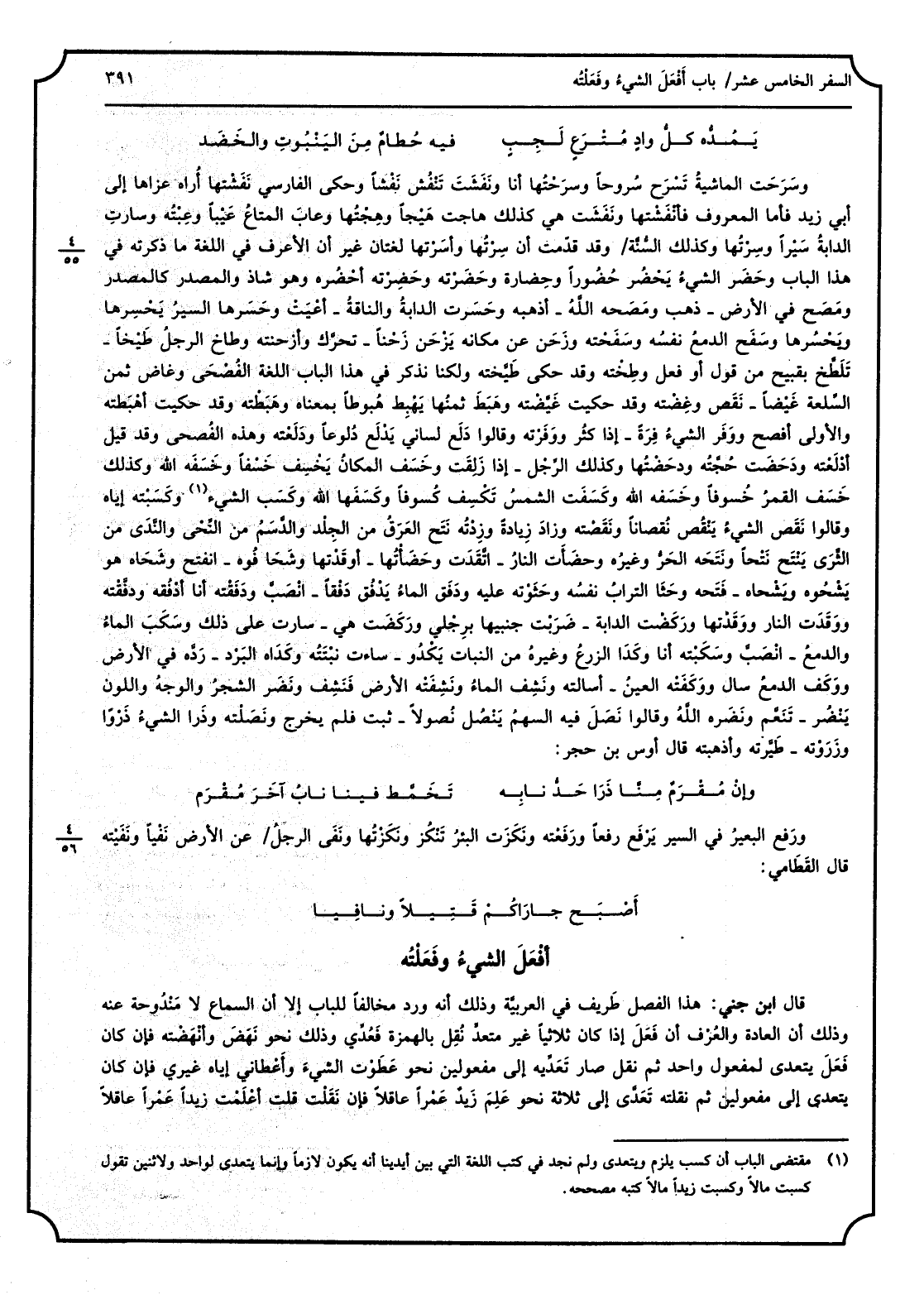 يَمُدُّه كلُّ وادٍ مُتْرَعٍ لَجِبٍ فِيهِ حُطامٌ من اليَنْبوت والخَضَد وسَرَحَت الْمَاشِيَة تسرح سُروحا وسَرَحْتها أَنا، ونَفَشَت تَنْفُش نَفْشاً، وَحكى الْفَارِسِي نَفَشْتها أُراه عزاها إِلَى أبي زيد فَأَما الْمَعْرُوف فأنْفَشْتها ونَفَشَت هِيَ، وَكَذَلِكَ هَاجَتْ هَيجا وهِجْتُها، وَعَابَ المتاعُ عَيباً وعِبْتُه وسارت الدابَّة سَيْراً وسِرْتها وَكَذَلِكَ السُّنَّة وَقد قدَّمت أَن سِرْتُها وأسَرْتها لُغَتَانِ غير أَن الأعرف فِي اللُّغَة مَا ذكرته فِي هَذَا الْبَاب، وحضَرَ الشيءُ يحضُرُ حُضوراً وحِضارة وحضَرته وحضِرْته أحْضُره وَهُوَ شَاذ والمصدر كالمصدر، ومَصَحَ فِي الأَرْض: ذهب، ومَصَحَه الله: أذهبه، وحَسَرت الدَّابَّة والناقة: أعْيَت، وحَسَرها السيرُ يَحْسِرها ويحسُرها وسَفَحَ الدَّمع نفسُه وسَفَحْته وزَحَن عَن مَكَانَهُ يَزْحَن زَحْناً: تحرَّك وأزْحنته، وطاخَ الرجلُ طَيْخاً: تلطَّخ بقبيحٍ من قَول أَو فعل وطِخْته وَقد حكى طَيَّخْته ولكنّا نذْكر فِي هَذَا الْبَاب اللُّغَة الفصحى، وغاضَ ثَمَن السِّلْعة غَيْضاً: نَقَص وغِضْته وَقد حكيت غَيَّضْته وهَبَط ثمنهَا يَهْبِط هُبوطاً وهَبَطْته وَقد حكيت أهْبَطْته وَالْأولَى أفْصح ووفَرَ الشيءُ فِرَةً: إِذا كثر ووَفَرْته، وَقَالُوا دَلَع لساني يَدْلَع دُلوعاً ودَلَعْته وَهَذِه الفصحى وَقد قيل أَدْلَعْته ودَحَضَت حُجَّتُه ودَحَضْتها وَكَذَلِكَ الرِّجل إِذا زَلِقَت، وخَسَف الْمَكَان يخسِف خَسْفاً وخَسَفه الله وَكَذَلِكَ خَسَف القمرُ خُسوفاً وخَسَفه الله، وكَسَفت الشَّمْس تَكْسِفُ كُسوفاً وكَسَفها الله، وكَسَب الشيءُ وكَسَبته إِيَّاه، وَقَالُوا نقَصَ الشيءُ يَنقُص نُقصاناً ونَقَصْته، وزادَ زِيادةً وزِدْته، نَتَحَ العَرَقُ من الْجلد والدَّسم من النِّحْي، والنَّدى من الثَّرى ينتَح نَتْحاً ونَتَحَه الحَرُّ وَغَيره، وحَضأَت النارُ: اتَّقدَت، وحَضأتها: أوْقَدْتها، وشَحا فُوه: انْفَتح، وشَحاه هُوَ يَشْحوه ويَشْحاه: فَتحه، وحَثا الترابُ نفسُه وحَثَوْته عَلَيْهِ، ودَفَقَ الماءُ يَدْفُقُ دَفْقاً: انصَبَّ ودَفَقْته أَنا أدْفقه ودَفَّقته، ووَقَدَت النَّار ووَقَدْتها، ورَكَّضْت الدابَّة: ضرَبْت جنْبَيْها برِجلي، ورَكَضَت هِيَ: سَارَتْ على ذَلِك، وسَكَب الماءُ والدَّمعُ: انصبَّ وسكبته أَنا وَكَذَا الزَّرع وَغَيره من النَّبَات يَكْدو: ساءت نبتته، وكَداه البَرْد: ردَّه فِي الأَرْض، ووَكَف الدّمع: سَالَ، ووَكَفَتْه العينُ: أسالته، ونَشِفَ الماءُ ونَشِفَتْه الأَرْض فنَشِف، ونَضَر الشّجر وَالْوَجْه واللون يَنْضُر: تنعَّم ونَضَره الله، وَقَالُوا نَصَلَ فِيهِ السَّهمُ يَنْصُل نُصولاً: ثَبت فَلم يخرج ونَصَلْته، وذَرا الشيءُ ذَرْواً، وزَرَوْته: طَيَّرته وأذهبته قَالَ أَوْس بن حجر: وَإِن مُقْرَمٌ مِنّا ذَرا حَدُّ نابِه تَخَمَّطَ فِينَا نابُ آخَرَ مُقْرَمُ ورفَع الْبَعِير فِي السّير يَرْفَع رَفْعاً ورَفَعْته، ونَكَزَت البئرُ تَنْكُزُ ونَكَزْتُها، ونَفَى الرجلُ عَن الأَرْض نَفْياً ونَفَيْته قَالَ الْقطَامِي: فأَصْبَح جاراكُمْ قَتيلاً ونافِيا