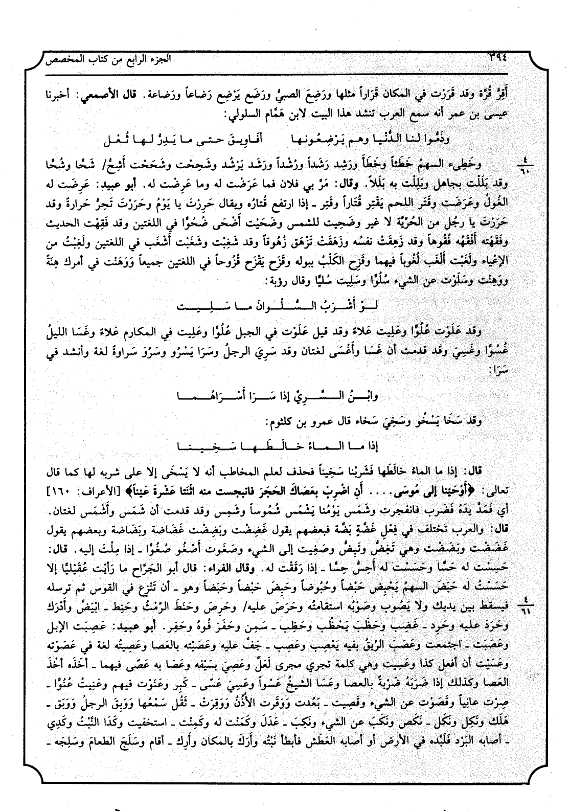 أَقَرُّ قُرَّةً وَقد قَرَرْت فِي الْمَكَان قَراراً مثلهَا، ورَضِع الصبيُّ ورَضَع يرضِع رَضاعاً ورَضاعةً. قَالَ الْأَصْمَعِي: أخبرنَا عِيسَى بن عمر أَنه سمع الْعَرَب تنشد هَذَا الْبَيْت لِابْنِ هَمّام السّلولي: وذَمُّوا لنا الدُّنيا وهم يَرْضِعونَها أَفاوِيقَ حتّى مَا يَدِرُّ لَهَا ثُعْلُ وخَطِئ السَّهمُ خَطَئاً وخَطَأً، ورَشِد رَشَداً ورُشْداً ورَشَد يَرْشُد، وشَحِحْت وشَحَحْت أَشِحُّ شَحّاً وشُحّاً، وَقد بَلَلْت بجاهلٍ وبَلِلْت بِهِ بَلَلاً. وَقَالَ: مَرَّ بِي فلانٌ فَمَا عَرَضْت لَهُ وَمَا عَرِضْت لَهُ. أَبُو عبيد: عَرِضَت لَهُ الغُولُ وعَرَضَت، وقَتَرَ اللَّحْم يَقْتِر قُتاراً وقَتِر: إِذا ارْتَفع قُتارُه، وَيُقَال حَرِرْتَ يَا يومُ وحَرَرْتَ تَحِرُّ حَرارةً، وَقد حَرَرْتَ يَا رجلُ من الحُرِّيَّة لَا غير، وضَحِيت للشمس وضَحَيْت أَضْحى ضُحُوّاً فِي اللغتين، وَقد فَقِهْت الحَدِيث وفَقَهْته أَفقَهُه فُقُوهاً، وَقد زَهِقَت نفسُه وزَهَقَت تَزْهَق زُهُوقاً، وَقد شَغِبْت وشَغَبْت أَشْغَب فِي اللغتين، ولَغِبْتُ من الإعياء ولَغَبْت أَلْغَب لُغُوباً فيهمَا، وقَزِحَ الكلبُ ببوله وقَزَح يَقْزَح قُزُوحاً فِي اللغتين جَمِيعًا، ووَهَنْت فِي أَمرك هِنَةً ووَهِنْت، وسَلَوْت عَن الشَّيْء سُلُوّاً وسَلِيت سُلِيّاً وَقَالَ رؤبة: لوْ أَشْرَبُ السُّلْوانَ مَا سَلِيت وَقد عَلَوْت عُلُوّاً وعَلِيت عَلاء ا، وَقد قيل عَلَوْت فِي الْجَبَل عُلُوّاً وعَلِيت فِي المكارم عَلاء ا، وغَسَا اللَّيْل غُسُوّاً وغَسِيَ وَقد قدَّمت أنّ غسا وأَغْسى لُغَتَانِ، وَقد سَرِيَ الرجلُ وسَرا يَسْرو وسَرُوَ سَراوَةً لُغَة وَأنْشد فِي سَرا: وابْنُ السَّرِيِّ إِذا سَرى أَسْراهُما وَقد سَخا يَسْخو وسَخِيَ سَخاء قَالَ عَمْرو بن كُلْثُوم: إِذا مَا الماءُ خالَطَها سَخِينا قَالَ إِذا مَا المَاء خالطَها فشَرِبنا سَخِينا فَحذف لعلم الْمُخَاطب أَنه لَا يَسْخَى إِلَّا على شربه لَهَا كَمَا قَالَ تَعَالَى: (وإذْ أَوْحَيْنا إِلَى مُوسى أَنِ اضْرِبْ بعصاكَ الحجَرَ فانْفَجَرَتْ منهُ اثْنَتا عَشْرَة عَيْنا) أَي فمَدَّ يدَه فضرَبَ فانفجرت، وشَمَسَ يومُنا يَشْمُسُ شُمُوساً وشَمِسَ وَقد قدّمت أنّ شَمَس وأَشْمَس لُغَتَانِ. قَالَ: وَالْعرب تخْتَلف فِي فِعْلِ غَضَّةٍ بَضَّةٍ فبعضهم يَقُول غَضِضْت وبَضِضْت غَضاضَةً وبَضاضَةً وَبَعْضهمْ يَقُول غَضَضْت وبضَضْت وَهِي تَغِضُّ وتَبِضُّ، وصَغِيت إِلَى الشَّيْء وصَغَوْت أَصْغو صُغُوّاً: إِذا مِلْت إِلَيْهِ. قَالَ: حَسِسْت لَهُ حَسّاً وحَسَسْت لَهُ أَحِسُّ حِسّاً: إِذا رَقَقْت لَهُ. وَقَالَ الْفراء: قَالَ أَبُو الجرَّاح مَا رَأَيْت عُقَيْلِيّاً إِلَّا حَسَسْت لَهُ، حَبَضَ السهمُ يَحْبِض حَبْضاً وحُبوضاً وحَبِضَ حَبْضاً وحَبَضاً وَهُوَ: أَن تَنزع فِي الْقوس ثمَّ ترسله فَيسْقط بَين يَديك وَلَا يَصُوب وصَوْبُه استقامته، وحَرَص عَلَيْهِ وحَرِص، وحَنَطَ الرِّمْثُ وحَنِطَ: ابيَضَّ وأدْرَك، وحَرَدَ عَلَيْهِ وحَرِدَ: غَضب، وحَظَبَ يَحْظُب وحَظِب: سَمِن وحَفَرَ فُوهُ وحَفِر. أَبُو عبيد: عَصِبَت الْإِبِل وعَصَبَت: اجْتمعت، وعَصَبَ الرِّيقُ بِفِيهِ يعصِب وعَصِب: جَفَّ عَلَيْهِ، وعَصَيْته بالعَصا وعَصِيتُه لُغَة فِي عَصَوْته، وعَسَيْت أَن أفْعَلَ كَذَا وعَسِيت وَهِي كلمة تجْرِي مجْرى لعلَّ، وعَصِيَ بِسَيْفِهِ وعَصا بِهِ عَصَىً فيهمَا: أَخَذَه أَخْذَ الْعَصَا وَكَذَلِكَ إِذا ضربه ضَرْبَةً بالعصا، وعسا الشَّيْخ عَسْواً وعَسِيَ عَسىً: كَبِر، وعَنَوْت فيهم وعَنِيت عُنُوّاً: صِرْت عانياً، وقَصَوْت عَن الشَّيْء وقَصِيت: بعُدت، ووَقَرَت الأُذُنُ ووَقَرَت: ثقُلَ سَمْعها، ووَبِقَ الرجل ووَبَقَ: هلك، ونَكِل ونَكَل: نكَصَ، ونَكَبَ عَن الشَّيْء ونَكِب: عَدَل، وكَمَنْت لَهُ وكَمِنْت: استخفيت، وكَدا النَّبْتُ وكَدِيَ: أَصَابَهُ البَر