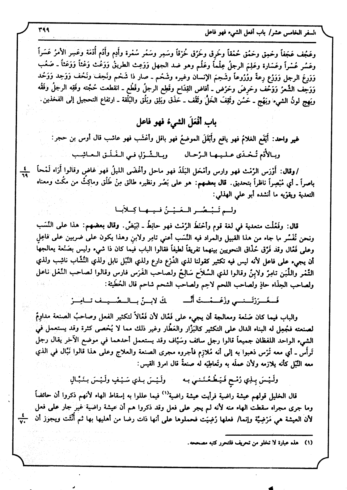 غير وَاحِد: أَيْفَع الغلامُ فَهُوَ يافع وأَبْقَل الموضعُ فَهُوَ بَاقِل وأَعْشَب فَهُوَ عاشب. قَالَ أَوْس بن حجر: وبالأُدْم تُحْدى عَلَيْهَا الرِّحال وبالشَّوْلِ فِي الفَلَق العاشبِ وَقَالَ: أَوْرَس الرِّمْث فَهُوَ وارس وأَمْحَل البلدُ فَهُوَ ماحل وأَغْضَى الليلُ فَهُوَ غاضٍ وَقَالُوا أرَاهُ لَمْحَاً باصراً: أَي مُبْصِراً نَاظرا بتحديق. قَالَ بَعضهم: هُوَ على بَصُر وَنَظِيره طَالِق من طَلُق وماكِثٌ من مَكُث وَمَعْنَاهُ التَّعْدِيَة ويقوَّيه مَا أنْشدهُ أَبُو عَليّ للهذلي: وَلم تَبْصُر العَيْنُ فِيهَا كِلابا قَالَ: وفَعُلْت متعدية فِي لُغَة قوم. وأَحْنَط الرِّمْث فَهُوَ حانطٌ: أَبيض. وَقَالَ بَعضهم: هَذَا على النَّسَب وَنحن نُفسِّر مَا جَاءَ من هَذَا الْقَبِيل وَالْمرَاد فِيهِ النَّسَب أَعنِي تامِر ولابِن وَهَذَا يكون على ضَرْبَيْنِ: على فَاعل وعَلى فَعَّال وَقد فرَّق حُذَّاق النَّحْوِيين بَينهمَا تفريقاً لطيفاً فَقَالُوا الْبَاب فِيمَا كَانَ ذَا شَيْء وَلَيْسَ بصَنْعَة يعالجها أَن يَجِيء على فَاعل لِأَنَّهُ لَيْسَ فِيهِ تَكْثِير كَقَوْلِنَا لذِي الدِّرْع دارع وَلِذِي النَّبْل نابِل وَلِذِي النُّشَّاب ناشِب وَلِذِي التَّمْر تامِر وَاللَّبن لابِنٌ وَقَالُوا لذِي السِّلاح سالِحٌ وَلِصَاحِب الفرَس فَارس وَقَالُوا لصَاحب النَّعْل ناعل وَلِصَاحِب الْحذاء حاذٍ وَلِصَاحِب اللَّحْم لاحِم وَلِصَاحِب الشَّحْم شاحم. قَالَ الحُطَيْئة: فَغَرَرْتني وزَعَمْتَ أنَّك لابِنٌ بالصَّيف تامِرْ وَالْبَاب فِيمَا كَانَ صَنْعَة ومعالجة أَن يَجِيء على فعَّال لِأَن فعَّالاً لتكثير الْفِعْل وصاحبُ الصَّنْعَة مداوِمٌ لصنعته فجُعِل لَهُ الْبناء الدَّال على التكثير كالبَزَّار والعَطَّار وَغير ذَلِك مِمَّا لَا يُحصى كَثْرَة وَقد يسْتَعْمل فِي الشَّيْء الْوَاحِد اللفظان جَمِيعًا. قَالُوا: رجل سائف وسَيَّلف وَقد يسْتَعْمل أَحدهمَا فِي مَوضِع الآخر يُقَال رجل تَرَّاس: أَي مَعَه تُرْس ذَهَبُوا بِهِ إِلَى أَنه مُلازِم فأجروه مجْرى الصَّنْعَة والعلاج وعَلى هَذَا قَالُوا نَبَّال فِي الَّذِي مَعَه النَّبْل كَأَنَّهُ يلازمه وَلِأَن عمله بِهِ وتَعاطِيَه لَهُ صنعةٌ. قَالَ امْرُؤ الْقَيْس: وَلَيْسَ بِذِي رُمْحٍ فَيَطْعُنَني بِهِ ولَيْسَ بِذِي سَيْفٍ ولَيْسَ بنَبَّالِ قَالَ الْخَلِيل: قَوْلهم عيشة راضية فَرَأَيْت عيشة راضية فِيمَا عللوا بِهِ إِسْقَاط الْهَاء لأَنهم ذكرُوا أَن حَائِضًا وَمَا جرى مجْرَاه سَقَطت الْهَاء مِنْهُ لِأَنَّهُ لم يجر على فعل وَقد ذكرُوا هم أَن عيشة راضية غير جَار على فعل لِأَن العيشة هِيَ مَرْضِيَّة وَإِنَّمَا فعلهَا رُضِيَت فحملوها على أَنَّهَا ذَات رضَا من أهليها بهَا ثمَّ أُنِّثَت وَيجوز أَن