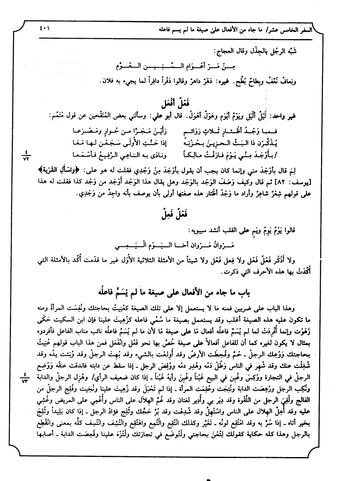 وَهَذَا الْبَاب على ضَرْبَيْنِ فَمِنْهُ مَا لَا يسْتَعْمل إِلَّا على تِلْكَ الصِّيغَة كعُنِيتُ بحاجتك ونُفِسَت المرأةُ وَمِنْه مَا تكون عَلَيْهِ هَذِه الصِّيغَة أغلب وَقد يسْتَعْمل بِصِيغَة مَا سُمِّي فَاعله كزُهِيتَ علينا فَإِن ابْن السّكيت حكى زَهَوْت وَإِنَّمَا أُفْرِدَتْ لما لم يُسَمَّ فاعلُه أَفعَال مَا على صِيغَة مّا لِأَن مَا لم يُسَمَّ فاعلُه نَائِب مناب الْفَاعِل فأفردوه بمثال لَا يكون لغيره كَمَا أَن للْفَاعِل أفعالاً على صِيغَة خُصَّ بهَا نَحْو فَعُل وانْفَعَل فَمن هَذَا الْبَاب قَوْلهم عُنِيتُ بحاجتك ووَعِكَ الرجلُ: حُمَّ وقُحِطَت الأرضُ وَقد أُولِعْت بالشَّيْء وَقد بُهِت الرجلُ وَقد وُنِئَت يدُه وَقد شُغِلْت عَنْك وَقد شُهِر فِي النَّاس وطُلَّ دمُه وهُدِر دمُه ووُقِصَ الرجل: إِذا سقط عَن دَابَّته فانْدَقَّتْ عُنُقُه، ووُضِع الرجلُ فِي التِّجَارَة ووُكِس وغُبِن فِي البيع وغُبِن رأيُه غَبْنَاً: إِذا كَانَ ضَعِيف الرَّأْي وهُزِل الرجلُ والدابةُ ونُكِب الرجل ورُهِصَت الدَّابَّة ونُتِجَت وعُقِمَت الْمَرْأَة: إِذا لم تَحْبَل وَقد زُهيتَ علينا ونُحِّيت وفُلِج الرجلُ من الفالج ولُقِيَ الرجل من اللَّقْوة وَقد دِيرَ بِي وأُدير لُغَتَانِ وَقد غُمَّ الْهلَال على النَّاس وأُغْمِي على الْمَرِيض وغُشِي عَلَيْهِ وَقد أهِلَّ الْهلَال على النَّاس واستُهِلَّ وَقد شُدِهْت وَقد بُرِّ حَجُّك وثُلِج فؤادُ الرجل: إِذا كَانَ بليداً وثُلِج بِخَير أَتَاهُ: إِذا سُرَّ بِهِ وَقد امتقع لَوْنُه: تغيَّر وَكَذَلِكَ انتُقِع والْتُمِع واهْتُقِع وانْتُشِف وانْتُسِف كلُّه بِمَعْنى وانْقُطِع بِالرجلِ وَهَذَا كُله حِكَايَة كَقَوْلِك لِتُعْنَ بحاجتي ولْتُوضَع فِي تجارَتك ولْتُزْهَ علينا وقُعِصَت الدَّابَّة: أَصَابَهَا