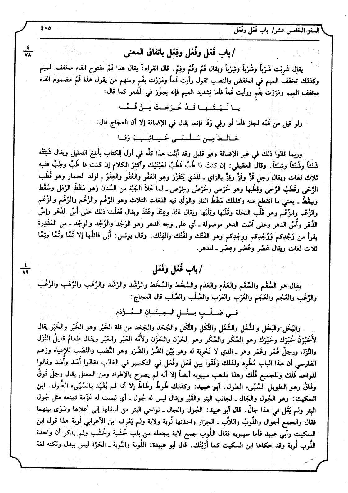 يُقَال هُوَ السُّقْم والسَّقَم والعُدْم والعَدَم والسُّخْط والسَّخَط والرُّشْد والرَّشَد والرُّهْب والرَّهَب والرُّغْب والرَّغَب والعُجْم والعَجَم والعُرْب والعَرَب والصُّلْب والصَّلَب. قَالَ العجاج: فِي صَلَبٍ مِثْلِ العِنانِ المُؤْدَم والبُخْل والبَخَل والشُّغْل والشَّغَل والثُّكْل والثَّكَل والجُحْد والجَحَد من قلّة الخيْر وَهُوَ الخُبْر والخَبَر يُقَال لأَخْبُرَنًّ خُبْرَك وخَبَرَك وَهُوَ السُّكْر والسَّكَر وَهُوَ الحُزْن والحَزَن ولأُمِّه العُبْر والعَبَر وَيُقَال طعامٌ قليلُ النُّزْل والنَّزَل ورجلٌ غُمْر وغَمَر وَهُوَ: الَّذِي لَا تَجْرِبة لَهُ وَهُوَ بيِّن الضُّرِّ والضَّرَر وَهُوَ النُّصْب والنَّصَب للإعياء. وَزعم الْفَارِسِي أَن هَذَا الْبَاب مُطَّرِد وَلذَلِك وَفَّقوا بَين فَعَل وفُعْل فِي التكسير فِي الْغَالِب فَقَالُوا أَسَد وأُسْد وَقَالُوا للْوَاحِد فَلَك وللجميع فُلْك وَهَذَا مَذْهَب سِيبَوَيْهٍ أَيْضا إِلَّا أَنه لم يُصَرح بالاطراد وَمن المعتل يُقَال رجلٌ قٌوقٌ وقَاقٌ وَهُوَ الطَّوِيل السَّيِّءُ الطول. أَبُو عُبَيْد: وَكَذَلِكَ طُوطٌ وطَاطٌ إِلَّا أَنه لم يُقَيِّد بالسَّيِّء الطُّول. ابْن السّكّيت: وَهُوَ الجُول والجَال: لجَانب الْبِئْر والقَبْر وَيُقَال لَيْسَ لَهُ جُول: أَي لَيست لَهُ عَزْمَة تَمنعهُ مثل جُول الْبِئْر وَلم يُقَل فِي هَذَا جالٌ. قَالَ أَبُو عُبَيْد: الجُول والجال: نواحي الْبِئْر من أَسْفَلهَا إِلَى أَعْلَاهَا وسَوَّى بَينهمَا فَقَالَ وَالْجمع أجوال واللُّوبُ واللاَّب: الحِرار واحدتها لُوبة ولابة وَلم يَعْرِف ابْن الْأَعرَابِي لُوبة هَذَا قَول ابْن السّكّيت وَأبي عبيد فَأَما سِيبَوَيْهٍ فَقَالَ: اللُّوب جمع لابة يَجعله من بَاب خَشَبَة وخُشُب وَلم يذكر أَن وَاحِدَة اللُّوب لُوبة وَقد حَكَاهَا ابْن السّكيت كَمَا أَرَيْتُك. قَالَ أَبُو عُبَيْدة: اللُوبة والنُّوبة: الحَرَّة لَيْسَ بِبَدَل وَلكنه لُغَة
