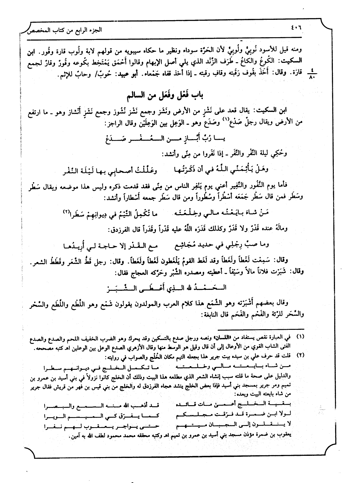 ابْن السّكيت: يُقَال قعد على نَشْزٍ من الأَرْض ونَشَزٍ من الأَرْض وَجمع نَشْز نُشوز وَجمع نَشَز أَنْشَاز وَهُوَ: مَا ارْتَفع من الأَرْض وَيُقَال رجلٌ صَدْع وصَدَع وَهُوَ: الوَعِل بَين الوَعِلَيْن، وَقَالَ الراجز: يَا رُبَّ أَبَّازٍ من العُفْر صَدَعْ وحُكي لَيْلَة النَّفْر والنَّفَر: إِذا نَفَروا من مِنىً وَأنْشد: وَهَلْ يَأْثِمَنِّي اللهُ فِي أَن ذَكَرْتُها وعَلَّلْت أَصْحَابِي بهَا لَيْلَةَ النَّفْر فَأَما يَوْم النُّفور والنَّفير أَعنِي يَوْم يَنْفِر النَّاس من مِنى فقد قدمت ذكره وَلَيْسَ هَذَا مَوْضِعه وَيُقَال سَطْر وَسَطَر فَمن قَالَ سَطْر جمعه أَسْطُراً وسُطوراً وَمن قَالَ سَطَر جمعه أَسْطَاراً وَأنْشد: مَن شاءَ بايَعْتُهُ مَالِي وخِلْعَتَه مَا تُكْمِلُ التَّيْمُ فِي دِيوانِهمْ سَطَرَا ومالَهُ عِنْده قَدْرٌ وَلَا قَدَرٌ وَكَذَلِكَ قَدَرَه اللهُ عَلَيْهِ قَدْرَاً وقَدَرَاً. قَالَ الفرزدق: وَمَا صبَّ رِجْلي فِي حَدِيد مُجاشِع مَعَ القَدْر إِلَّا حَاجَة لي أُريدُها وَقَالَ: سَمِعْت لَغْطَاً ولَغَطَاً وَقد لَغَطَ القومُ يَلْغَطون لَغْطَاً ولَغَطَاً. وَقَالَ: رجلٌ قَطُّ الشَّعَر وقَطَطُ الشَّعَر. وَقَالَ: شَبَرْت فلَانا مَالا وسَيْفَاً: أَعْطيته ومصدره الشَّبْر وحرَّكه العجاج فَقَالَ: الحَمدُ لله الَّذِي أَعْطَى الشَّبَرْ وَقَالَ بَعضهم أَشْبَرْته وَهُوَ الشَّمَع هَذَا كَلَام الْعَرَب والمولدون يَقُولُونَ شَمْع وَهُوَ اللَّطْع واللَّطَع والسَّحْر والسَّحَر للرِّئة والفَحْم والفَحَم. قَالَ النَّابِغَة: