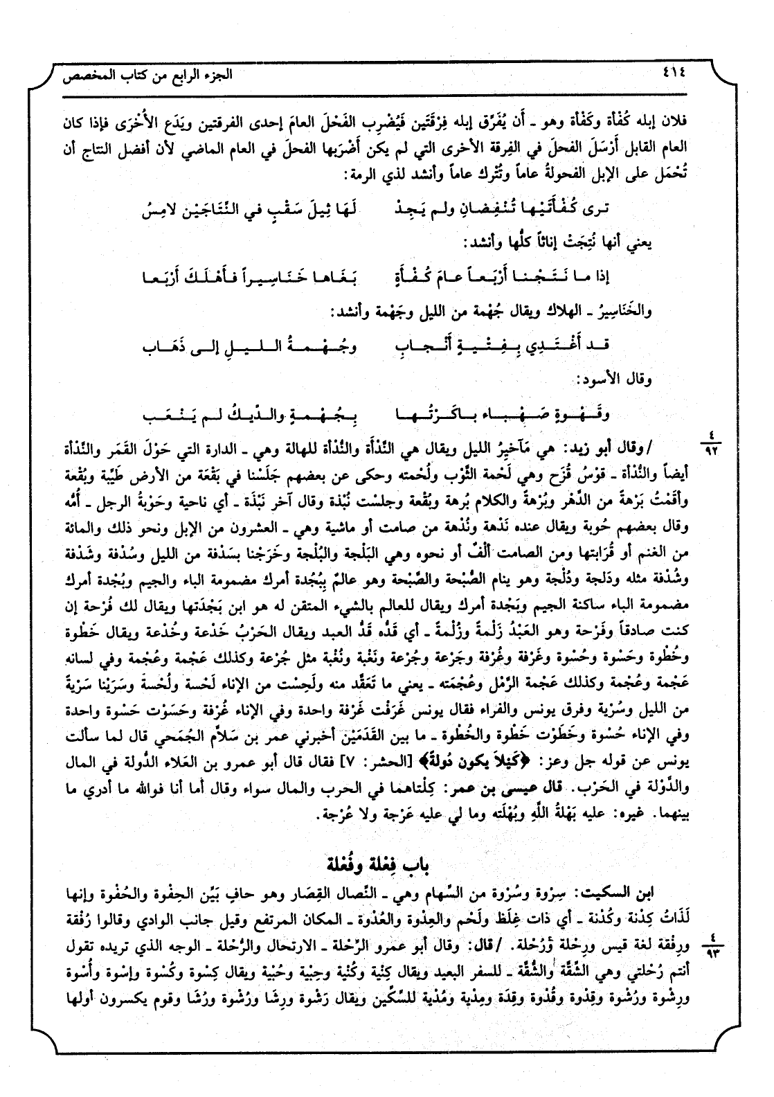 فلَان إبِله كُفْأَة وكَفْأَة وَهُوَ: أَن يُفرِّق إبِله فِرْقَتَيْن فيُضْرِب الفحلَ العامَ إِحْدَى الْفرْقَتَيْنِ ويدَع الأُخْرى فَإِذا كَانَ الْعَام الْقَابِل أَرْسَل الفحلَ فِي الفِرقة الْأُخْرَى الَّتِي لم يكن أَضْرَبَها الفحلَ فِي الْعَام الْمَاضِي لِأَن أفضل النِّتَاج أَن تُحمَل على الْإِبِل الفحولةُ عَاما وتُترَك عَاما وَأنْشد لذِي الرِّمة: ترى كُفْأَتَيْها تُنْفِضانِ وَلم يَجِدْ لَها ثِيلَ سَقْبٍ فِي النِّتَاجَيْن لامِسُ يَعْنِي أَنَّهَا نُتِجَت إِنَاثًا كلُّها وَأنْشد: إِذا مَا نَتَجْنا أَرْبَعاً عامَ كُفْأَةٍ بَغاها خَناسيراً فأهْلَكَ أَرْبَعا والخَناسير: الْهَلَاك وَيُقَال جُهْمة من اللَّيْل وجَهْمَة وَأنْشد: قد أَغْتَدي بفِتْيَةٍ أَنْجَابِ وجُهْمةُ الليلِ إِلَى ذَهابِ وَقَالَ الْأسود: وقَهْوَةٍ صَهْبَاءَ باكَرْتُها بجُهْمةٍ والدِّيكُ لم يَنْعَب وَقَالَ أَبُو زيد: هِيَ مّا خِيرُ اللَّيْل وَيُقَال هِيَ النَّدْأَة والنُّدْأَة للهالة وَهِي: الدارة الَّتِي حَوْلَ القَمَر والنَّدْأَة أَيْضا والنُّدْأَة: قوسُ قُزَح وَهِي لَحْمَة الثَّوب ولُحْمته وَحكي عَن بَعضهم: جَلَسْنا فِي بَقْعَة من الأَرْض طيِّبَة وبُقْعة وأَقَمْت بَرْهَةً من الدَّهر وبُرْهةً وَالْكَلَام بُرهة وبُقْعة وَجَلَست نُبْذة وَقَالَ آخر نَبْذَة: أَي نَاحيَة وحَوْبَةُ الرجل: أُمُّه وَقَالَ بَعضهم حُوبة. وَيُقَال عِنْده نَدْهَة ونُدْهة من صَامت أَو مَاشِيَة وَهِي: الْعشْرُونَ من الْإِبِل وَنَحْو ذَلِك وَالْمِائَة من الْغنم أَو قُرابتها وَمن الصَّامِت ألفٌ أَو نَحوه وَهِي البَلْجة والبُلْجة وخَرَجْنا بسَدْفة من اللَّيْل وسُدْفة وشَدْفة وشُدْفة مثل ودَلْجَة ودُلْجة وَهُوَ ينَام الصُّبْحة والصَّبْحة وَهُوَ عالمٌ ببُجُدة أَمرك مَضْمُومَة الْبَاء وَالْجِيم وبُجْدة أَمرك مَضْمُومَة الْبَاء سَاكِنة الْجِيم وبَجْدَة أَمرك وَيُقَال للْعَالم بالشَّيْء المتقن لَهُ هُوَ ابْن بَجْدَتها وَيُقَال لَك فُرْحة إِن كنت صَادِقا وفَرْحَة وَهُوَ العبدُ زَلْمَة وزُلْمة: أَي قَدُّه قَدُّ العَبْد وَيُقَال للحرب خَدْعَة وخُدْعة وَيُقَال خَطْوَة وخُطْوة وحَسْوَة وحُسْوة وغَرْفَة وغُرْفة وجَرْعَة وجُرْعة ونَغْبَة ونُغْبة مثل جُرْعة وَكَذَلِكَ هَجْمَة وهُجْمة وَفِي لِسَانه عَجْمَة وعُجْمة وَكَذَلِكَ عَجْمَة الرَّمْل وعُجْمَته: يَعْنِي مَا تعقَّد مِنْهُ ولَحِسْت من الْإِنَاء لَحْسَة ولُحْسة وسَرَيْنا سَرْيَةً من اللَّيْل وسُرْية وَفرق يُونُس وَالْفراء فَقَالَ يُونُس: غَرَفْت غَرْفَة وَاحِدَة وَفِي الْإِنَاء غُرْفة وحَسَوْت حَسْوَة وَاحِدَة وَفِي الْإِنَاء حُسْوة وخَطَوْت خَطْوَة والخُطْوة: مَا بَين القدَمَيْن. أَخْبرنِي عمر بن سَلاَّم الجُمَعي قَالَ: لما سَأَلت يُونُس عَن قَوْله جلّ وَعز: (كَيْلا يكون دُولَةً) . فَقَالَ: قَالَ أَبُو عَمْرو بن العَلاء: الدُّولة فِي المَال والدَّوْلة فِي الْحَرْب. قَالَ عِيسَى بن عمر: كِلْتاهما فِي الْحَرْب وَالْمَال سَوَاء وَقَالَ: أما أَنا فو الله مَا أَدْرِي مَا بَينهمَا. غَيره: عَلَيْهِ بَهْلَةُ اللهِ وبُهْلَتُه وَمَا لي عَلَيْهِ عَرْجَة وَلَا عُرْجة.